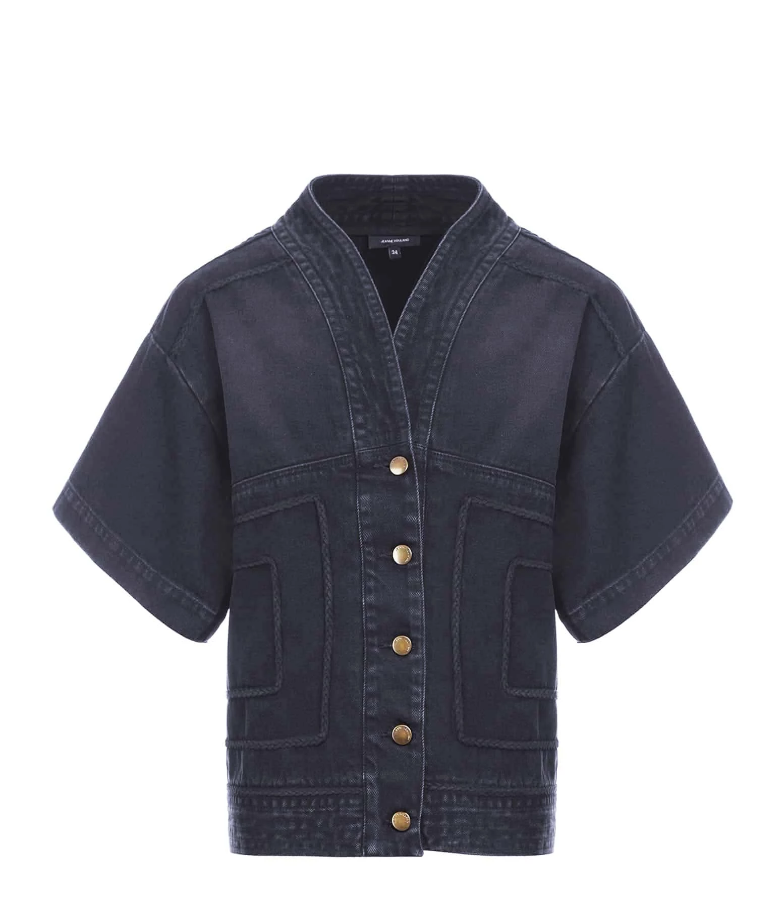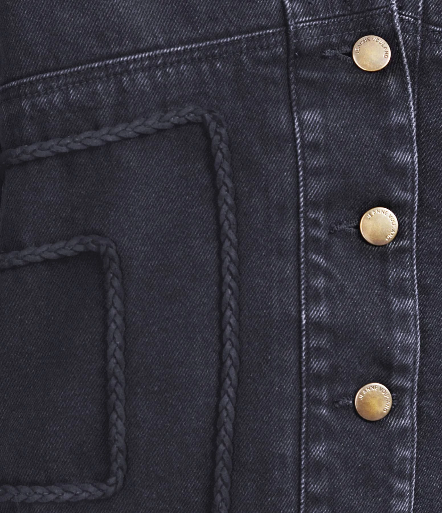 Veste en denim de coton gris ornés de détails tressés. Col en V. Manches courtes avec bords rabattus. Fermeture boutonnée simple sur le devant. Boutons métalliques gravés du logo. Coupe droite large. Base droite.