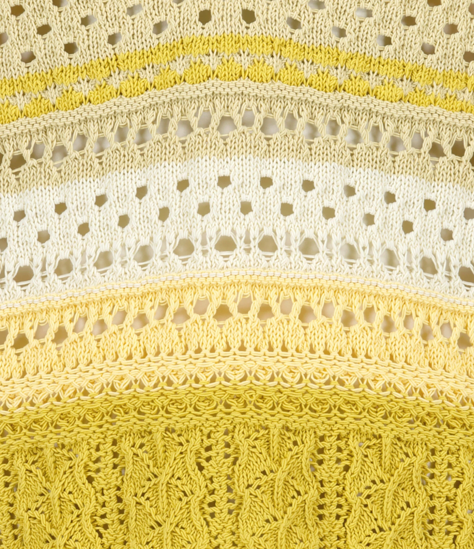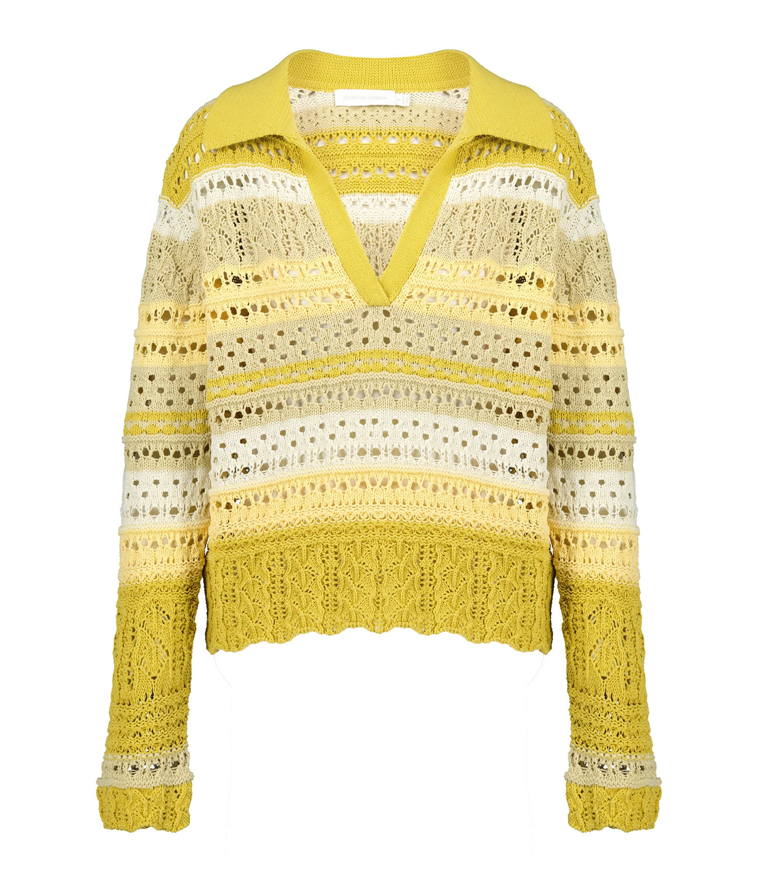 Pull en maille beige à larges rayures jaunes. Manches longues. Col en V. Effet ajouré. Coupe droite. Base droite.