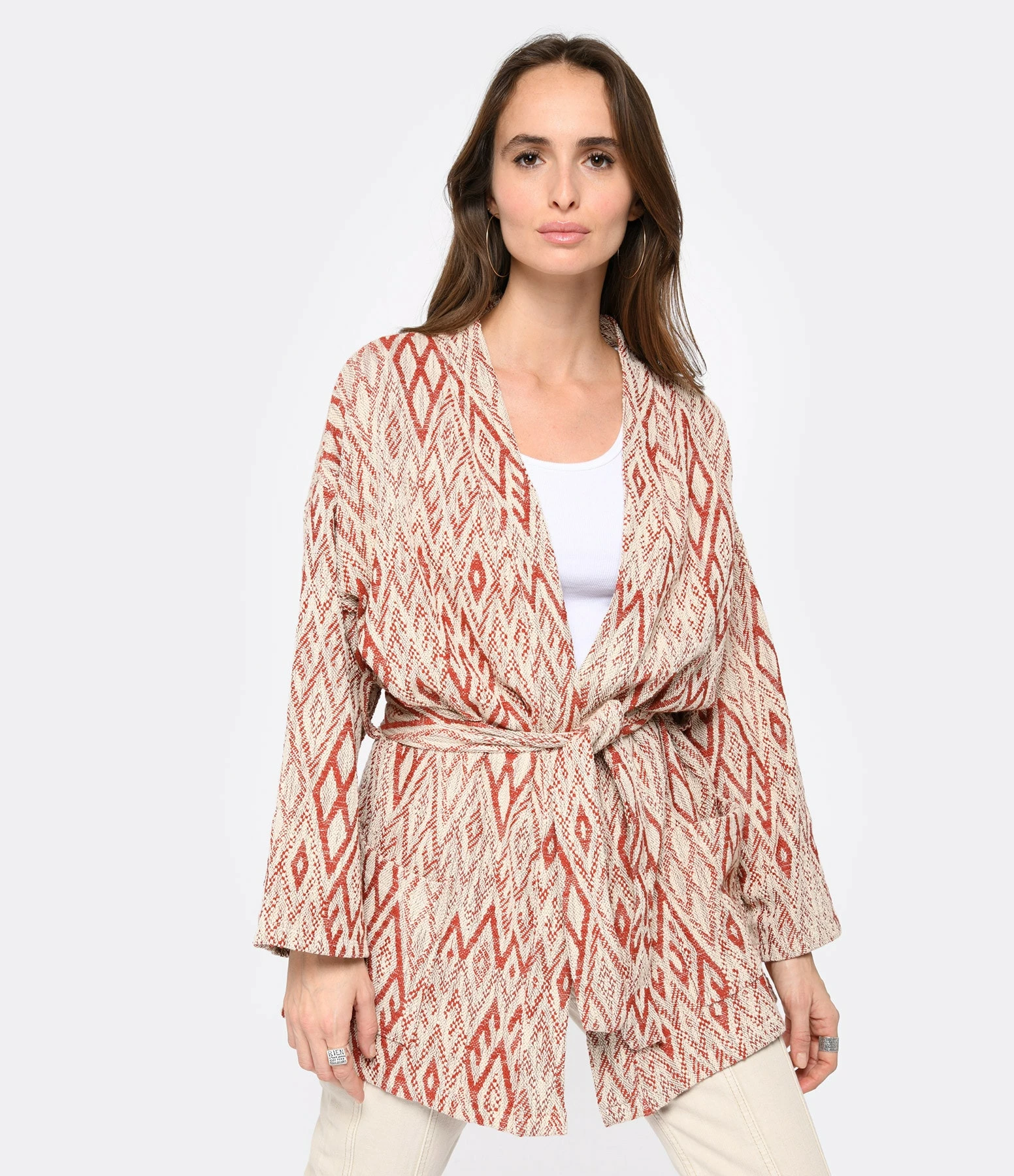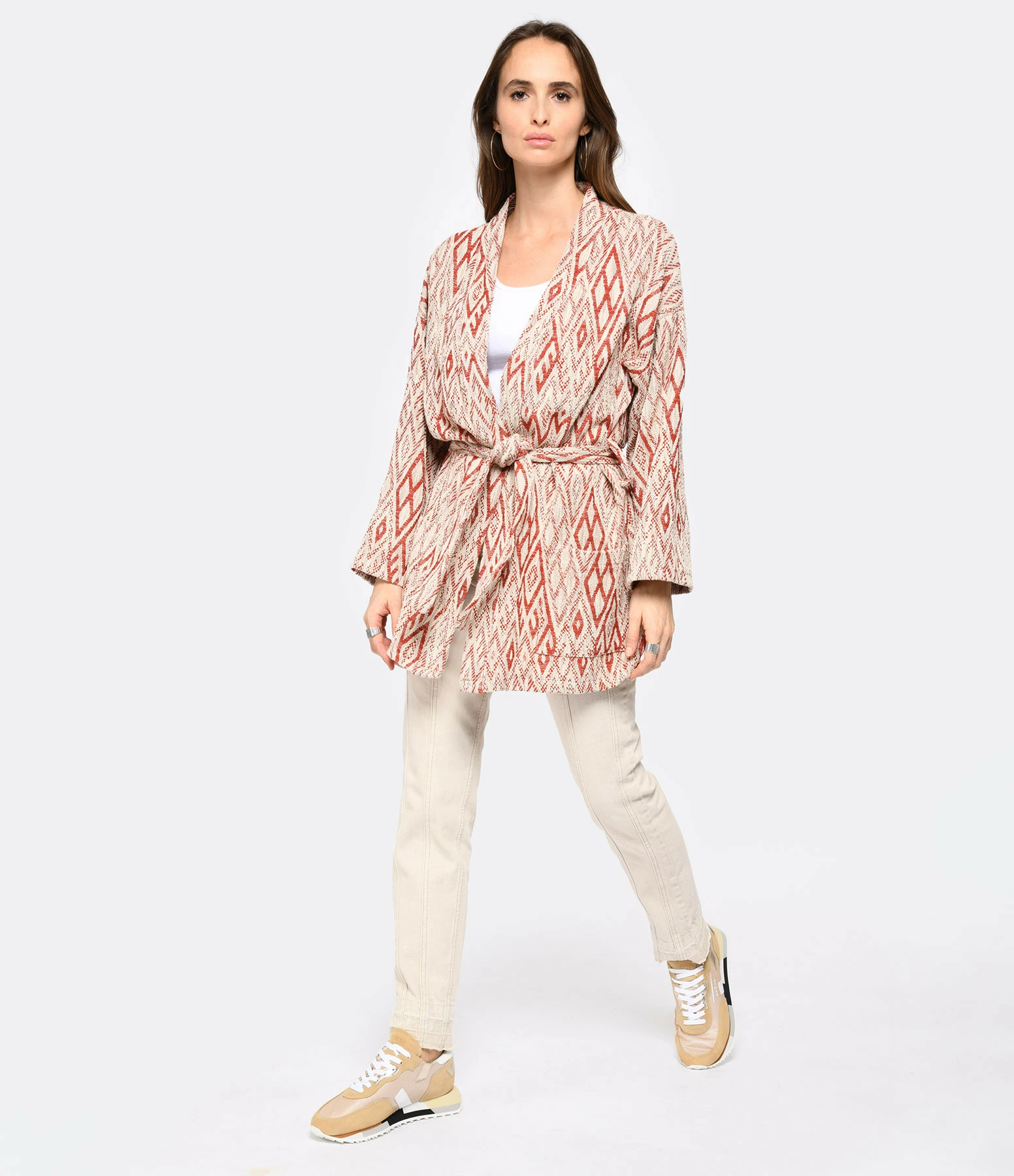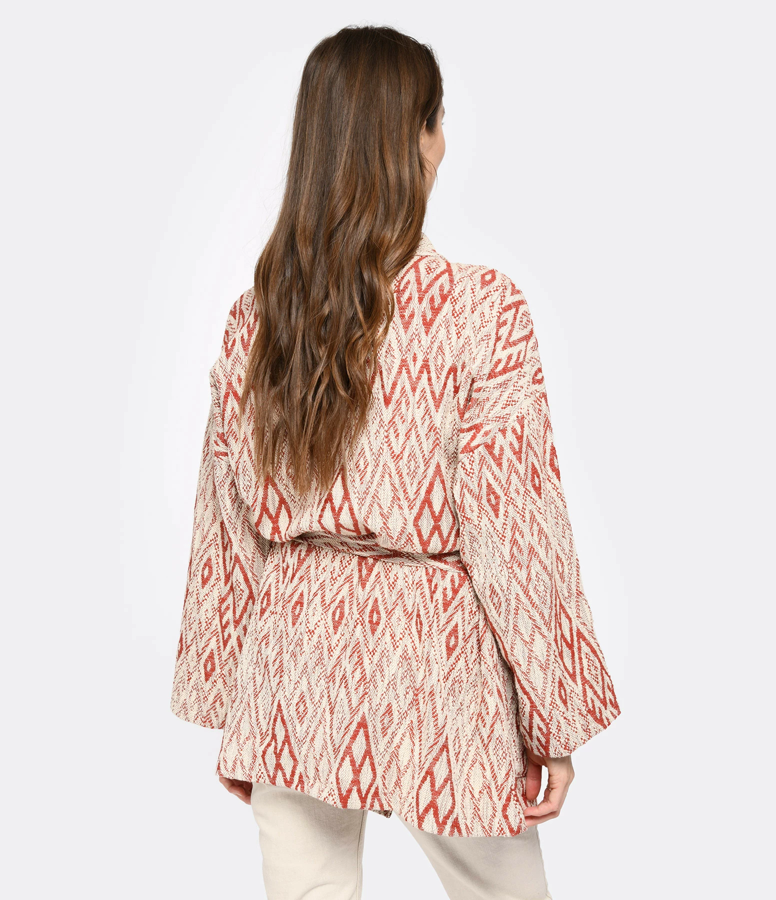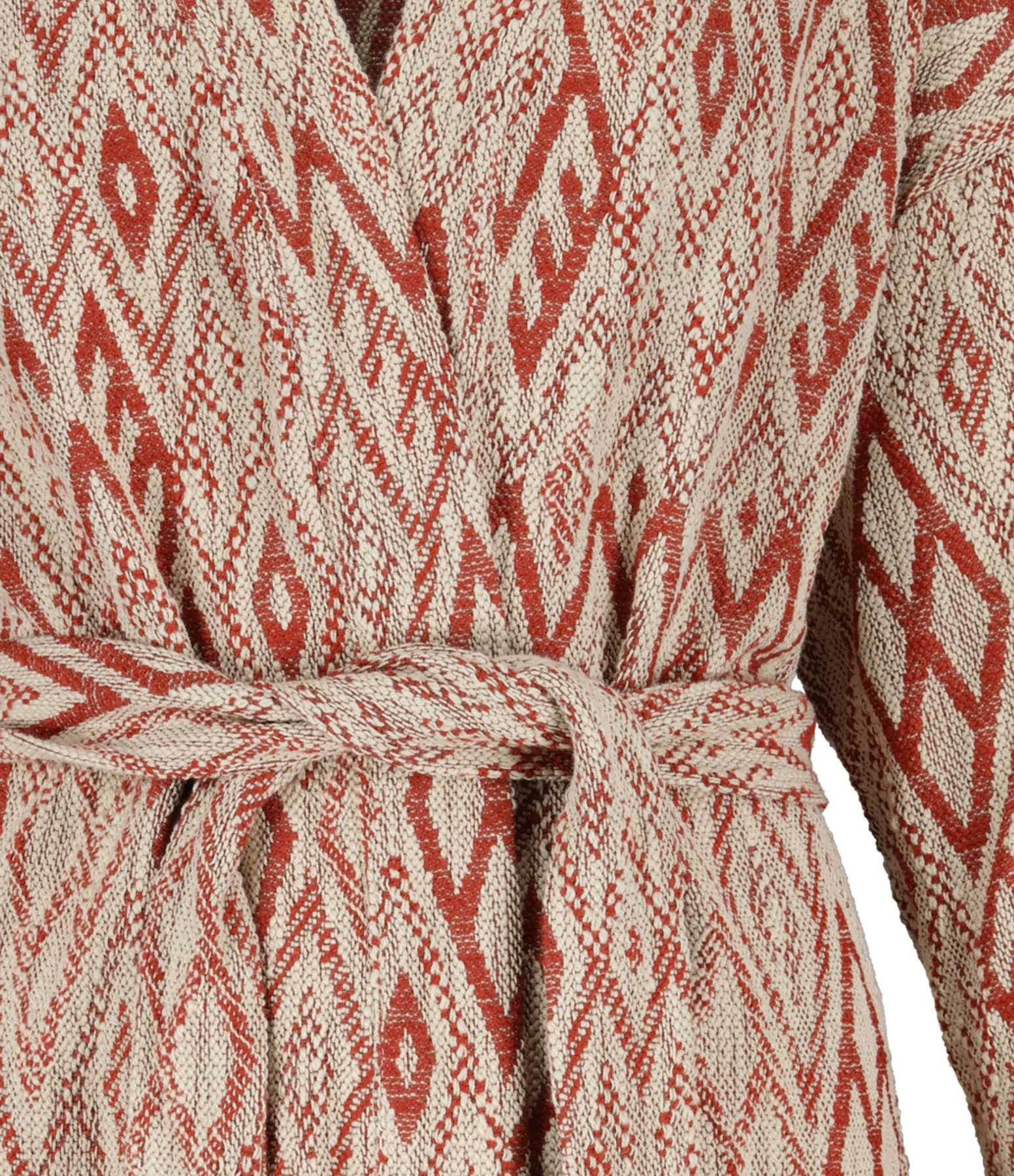 Kimono en coton à imprimé beige et rouge. Deux poches plaquées à l’avant. Liens à nouer à la taille. Col kimono.