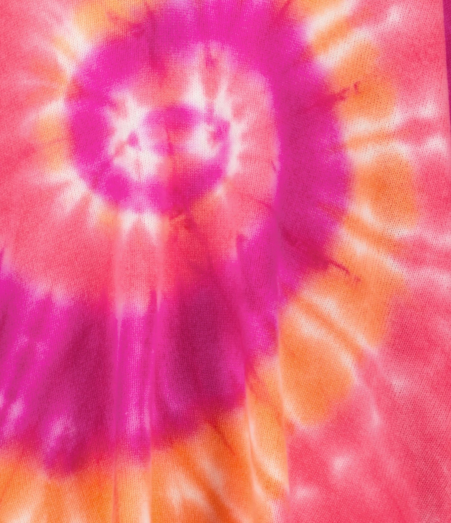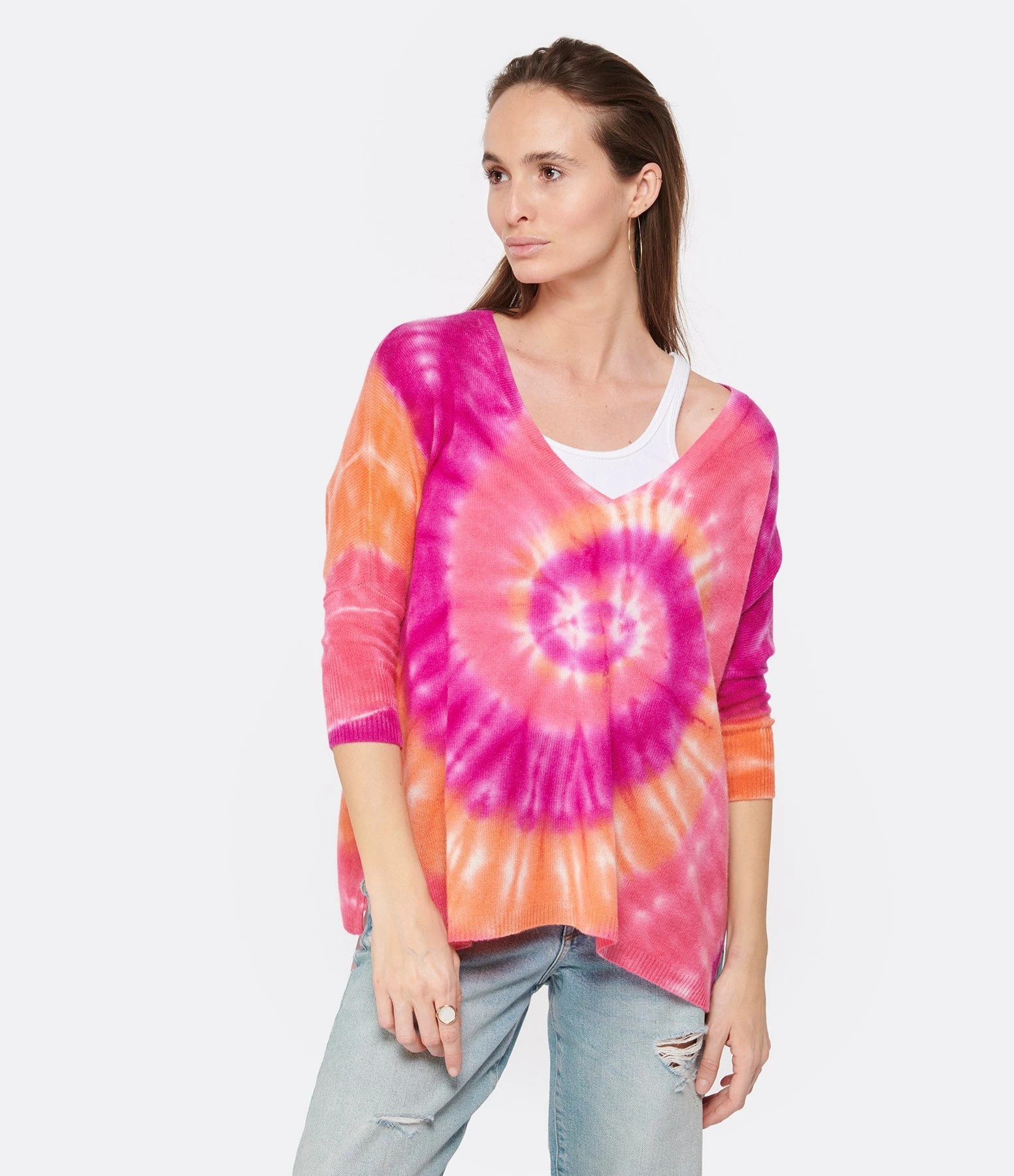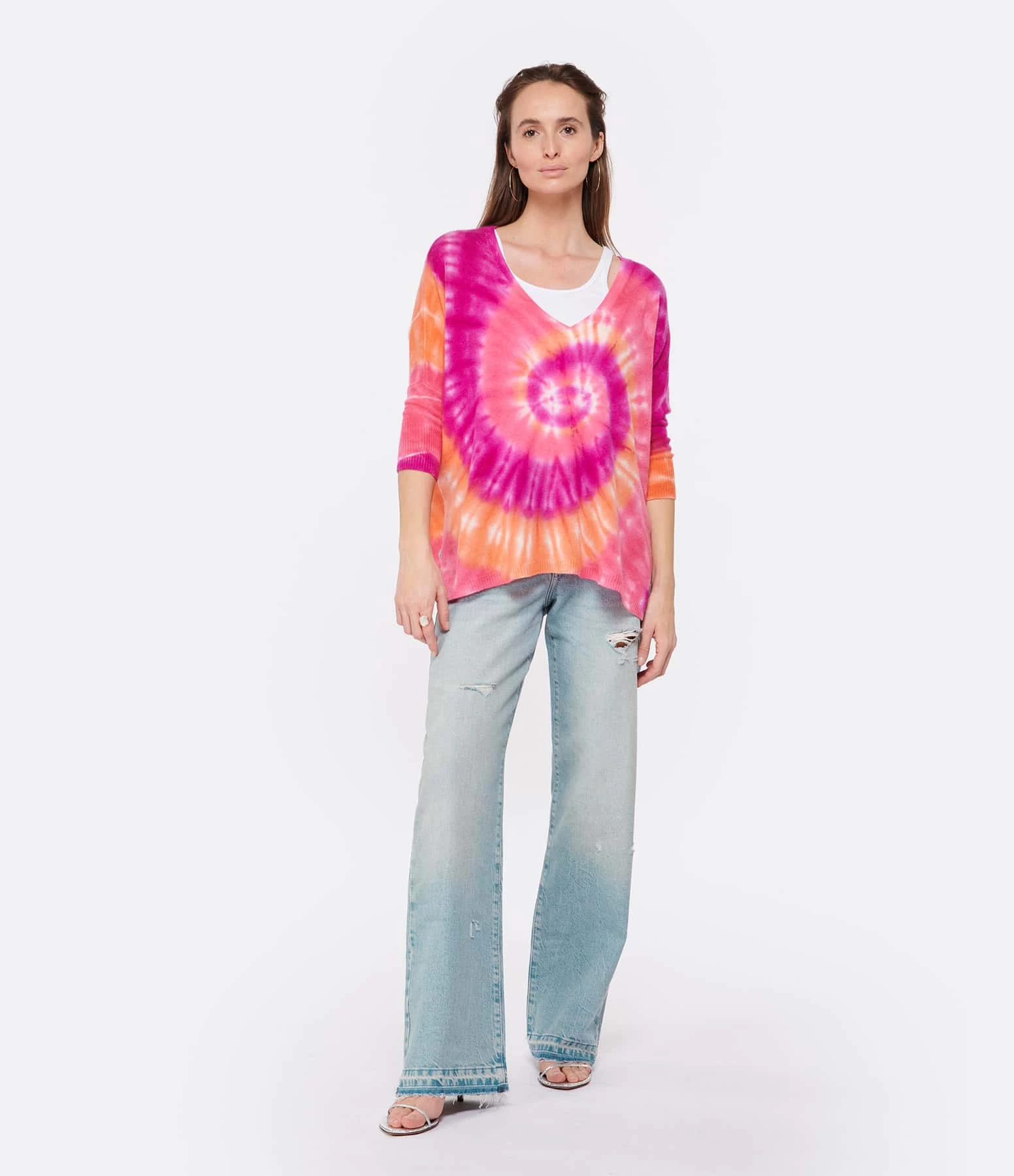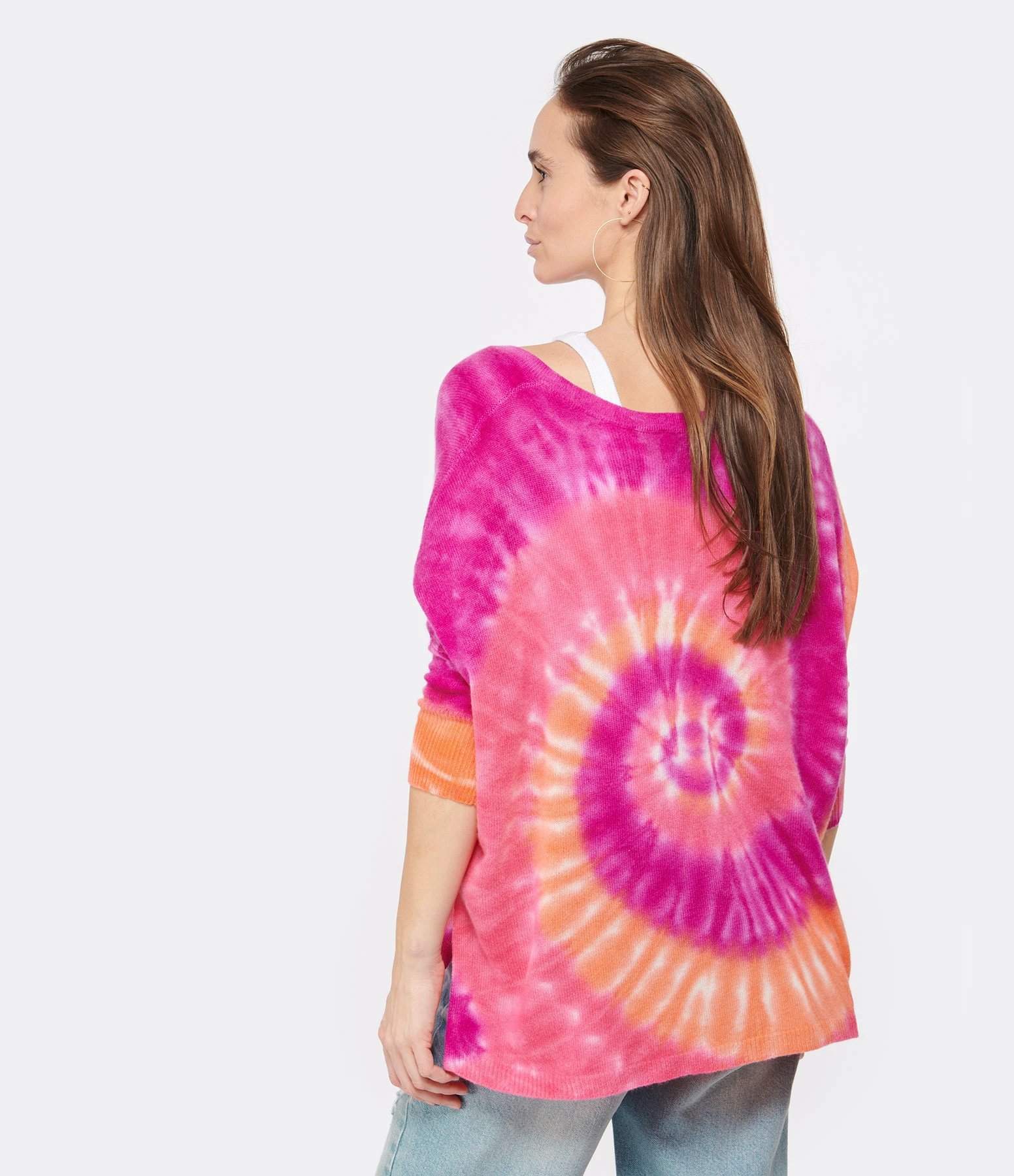 Pull en maille de cachemire à motif tie and dye dans les tons de rose. Col en V côtelé. Manches 7/8ème avec bords côtelés. Fentes latérales. Coupe overzise. Base droite côtelée.