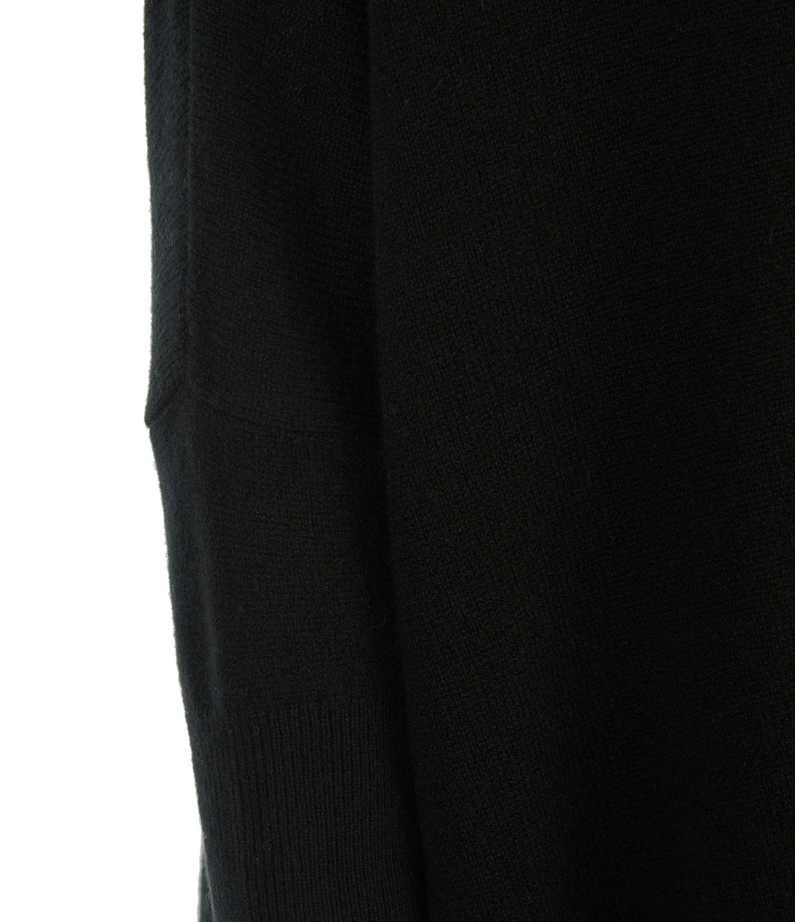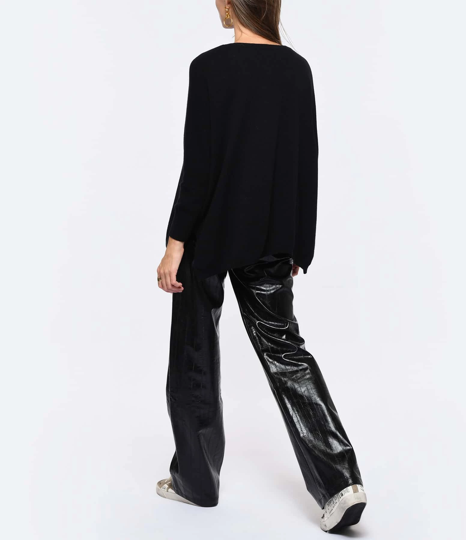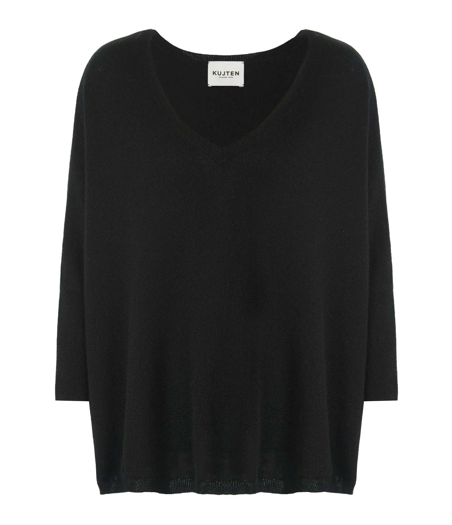 Pull en tricot jersey de cachemire noir. Col en V côtelé. Manches longues avec poignets côtelés. Fentes latérales. Coupe oversize. Base droite côtelée.