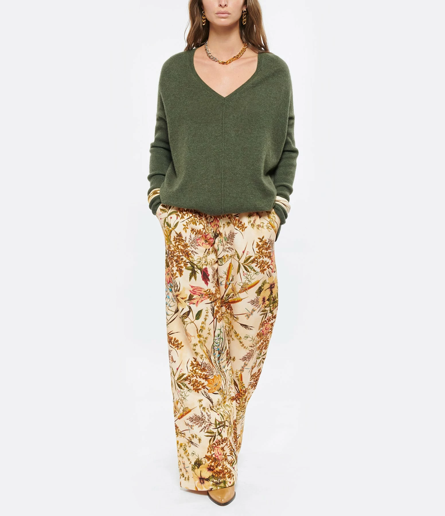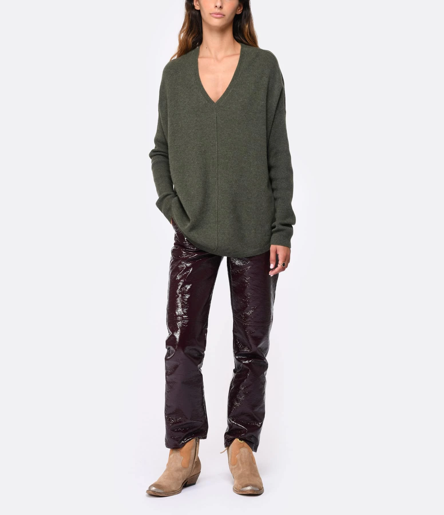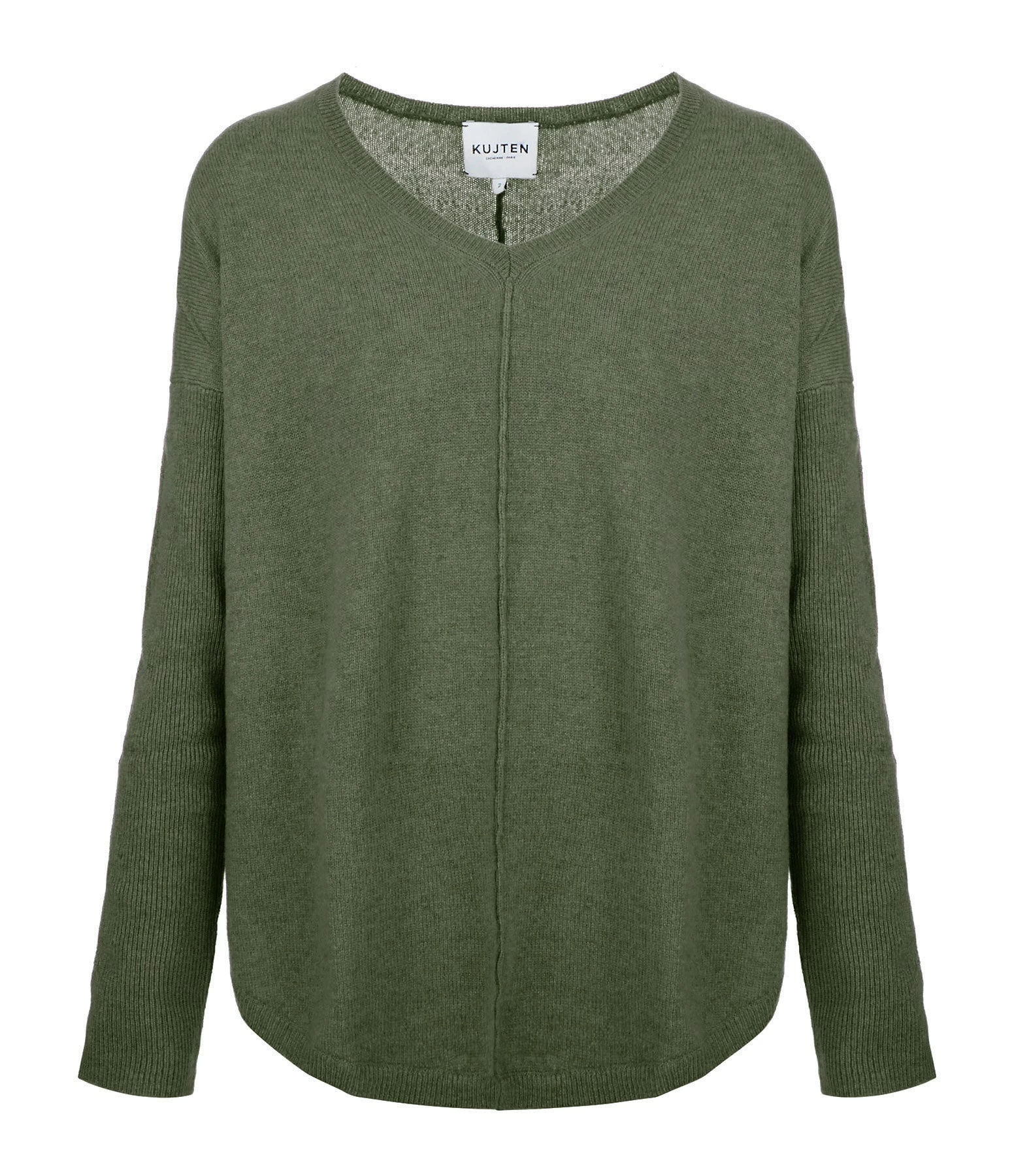 Pull en cachemire kaki. Col V. Manches longues. Coupe large. Base arrondie.