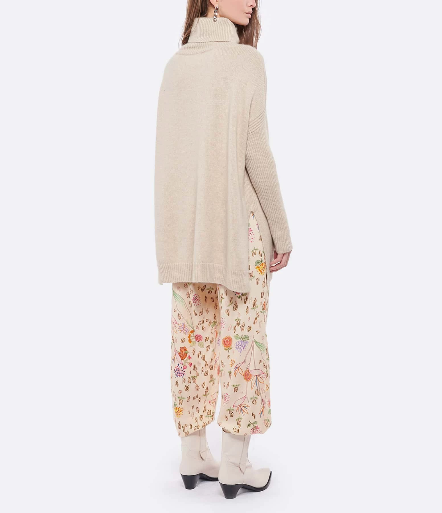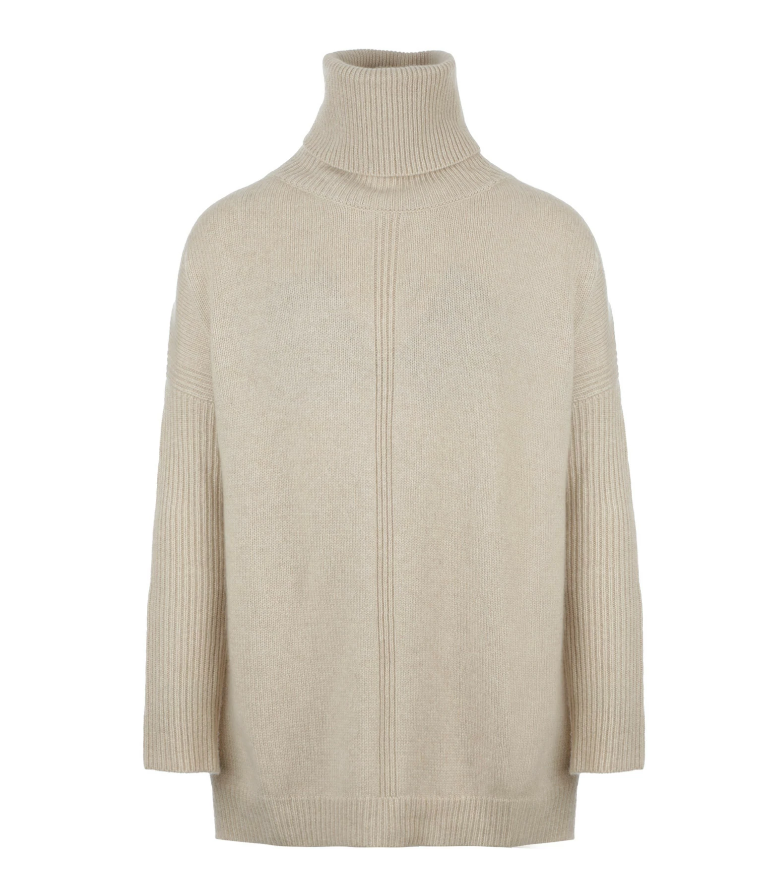 Pull à col roulé en cachemire beige. Manches longues côtelées. Col roulé. Coupe ample. Base droite. Fentes de 26 cm sur les côtés.