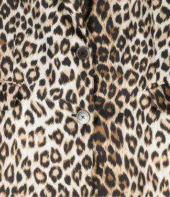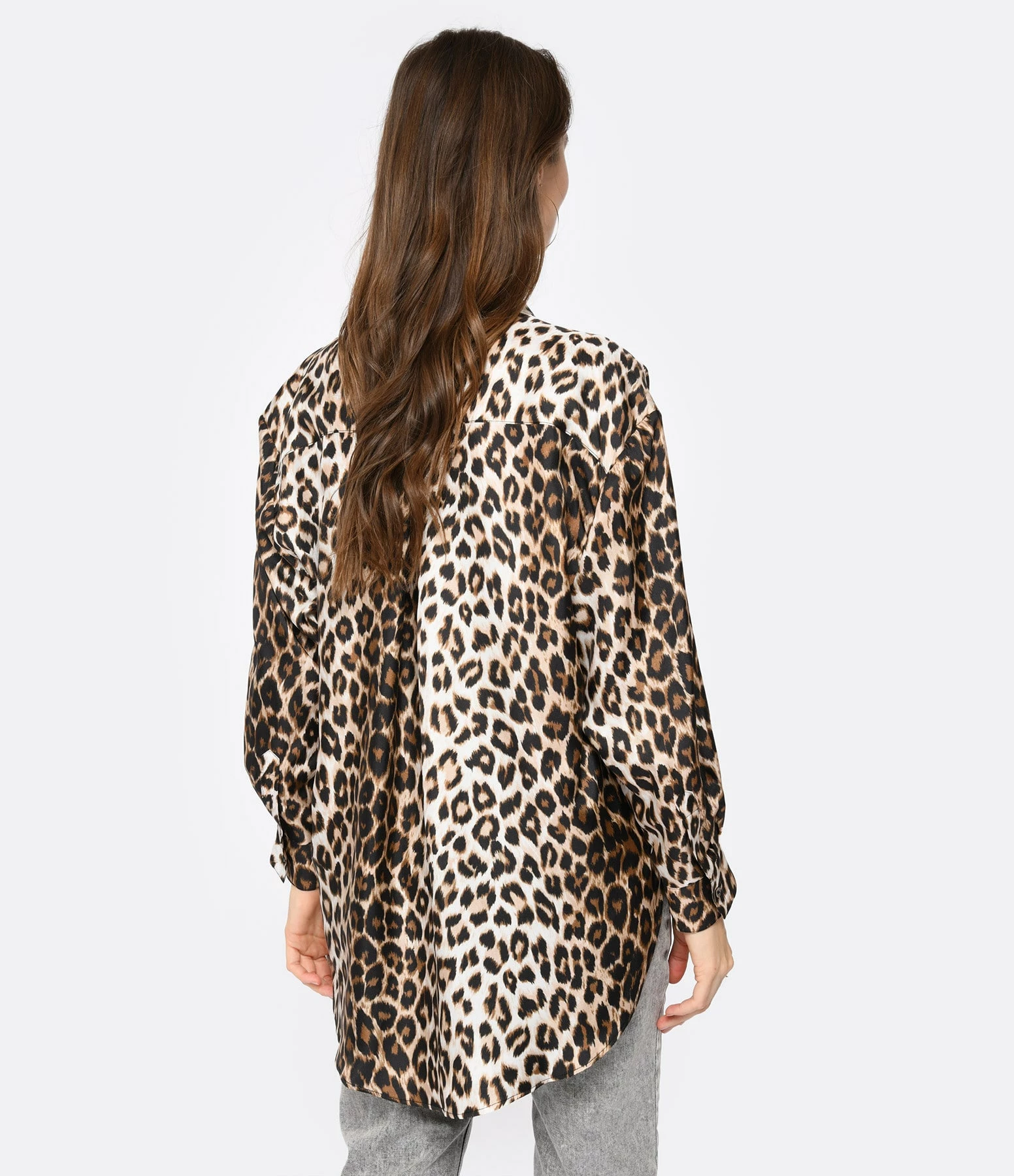 Chemise en soie imprimé léopard. Col chemisier. Poches plaquée au niveau de la poitrine. Manches longues. Fermeture boutonnée sur le devant. Coupe droite. Base arrondie.