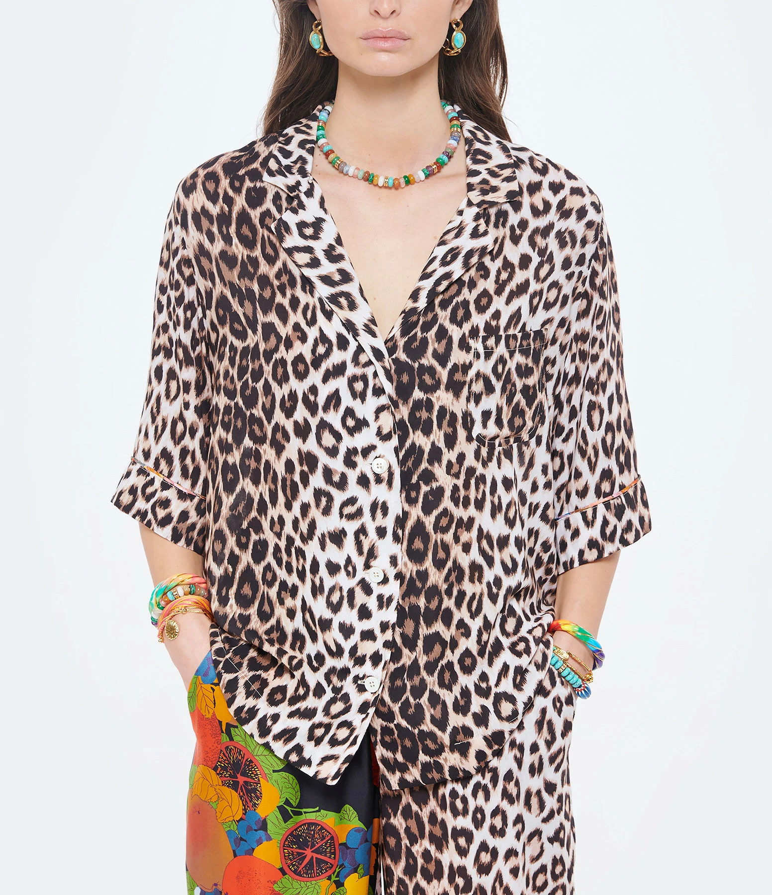 Conseil stylistique : Une chemise en soie imprimée, c’est la pièce casual chic que l’on sortira tout l’été. Avec un short en denim ou un pantalon fluide selon les occasions, osez les imprimés !