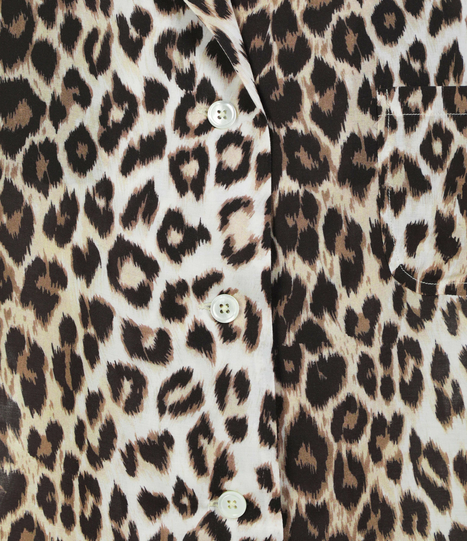 Chemise à imprimé léopard marron. Col tailleur. Manches courtes. Fermeture boutonnée. Une poche plaquée poitrine. Coupe droite. Base droite.