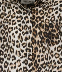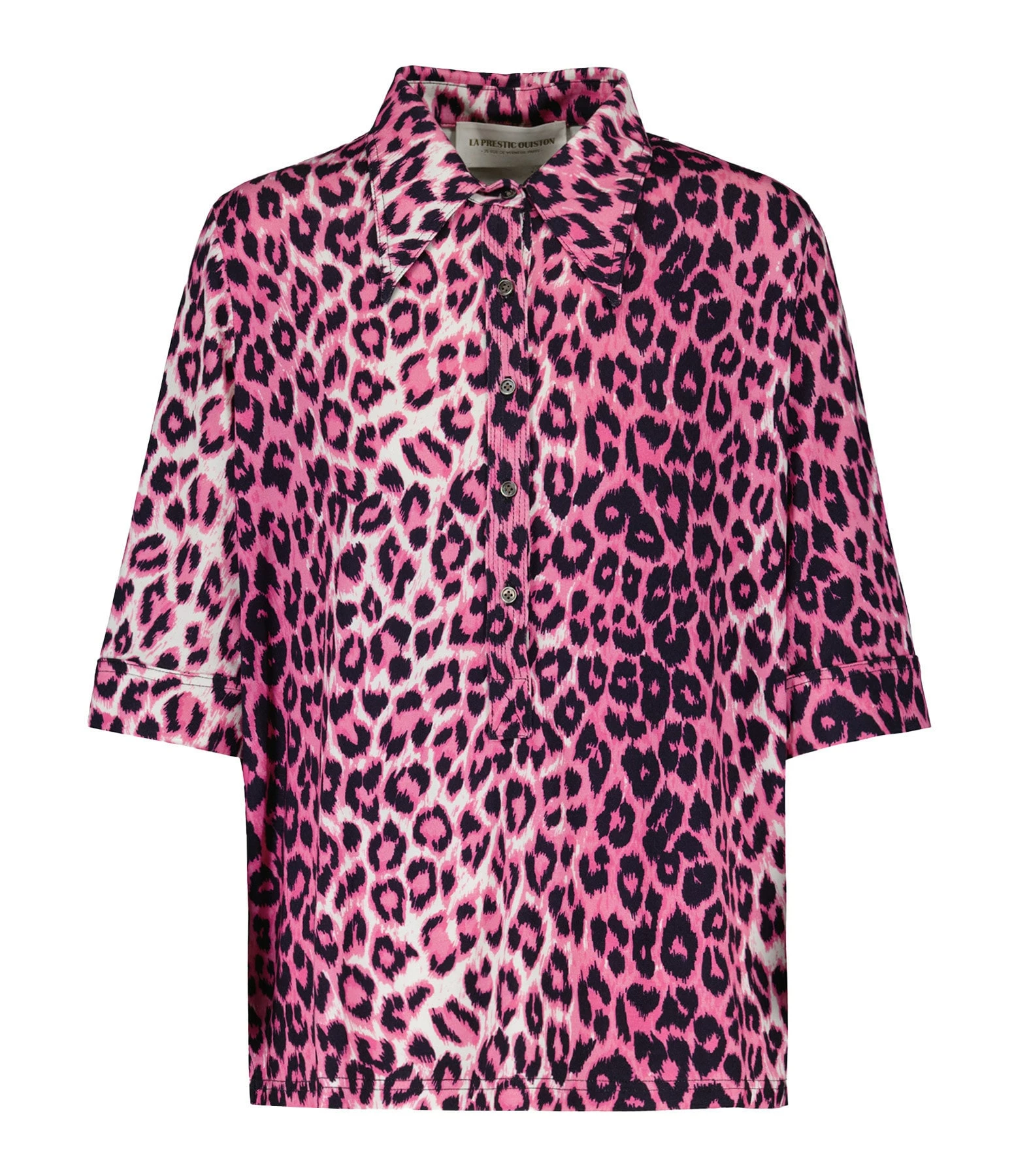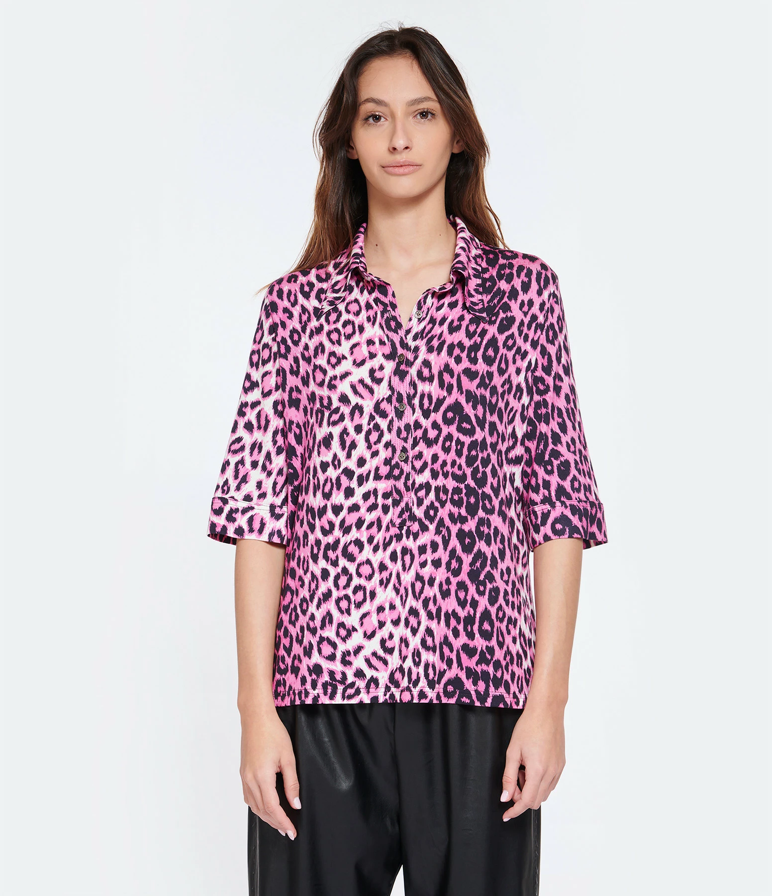 Chemise en tissu stretch à imprimé léopard rose. Col chemisier. Manches courtes avec bords rabattus. Fermeture boutonnée sur le devant. Coupe droite. Base droite.