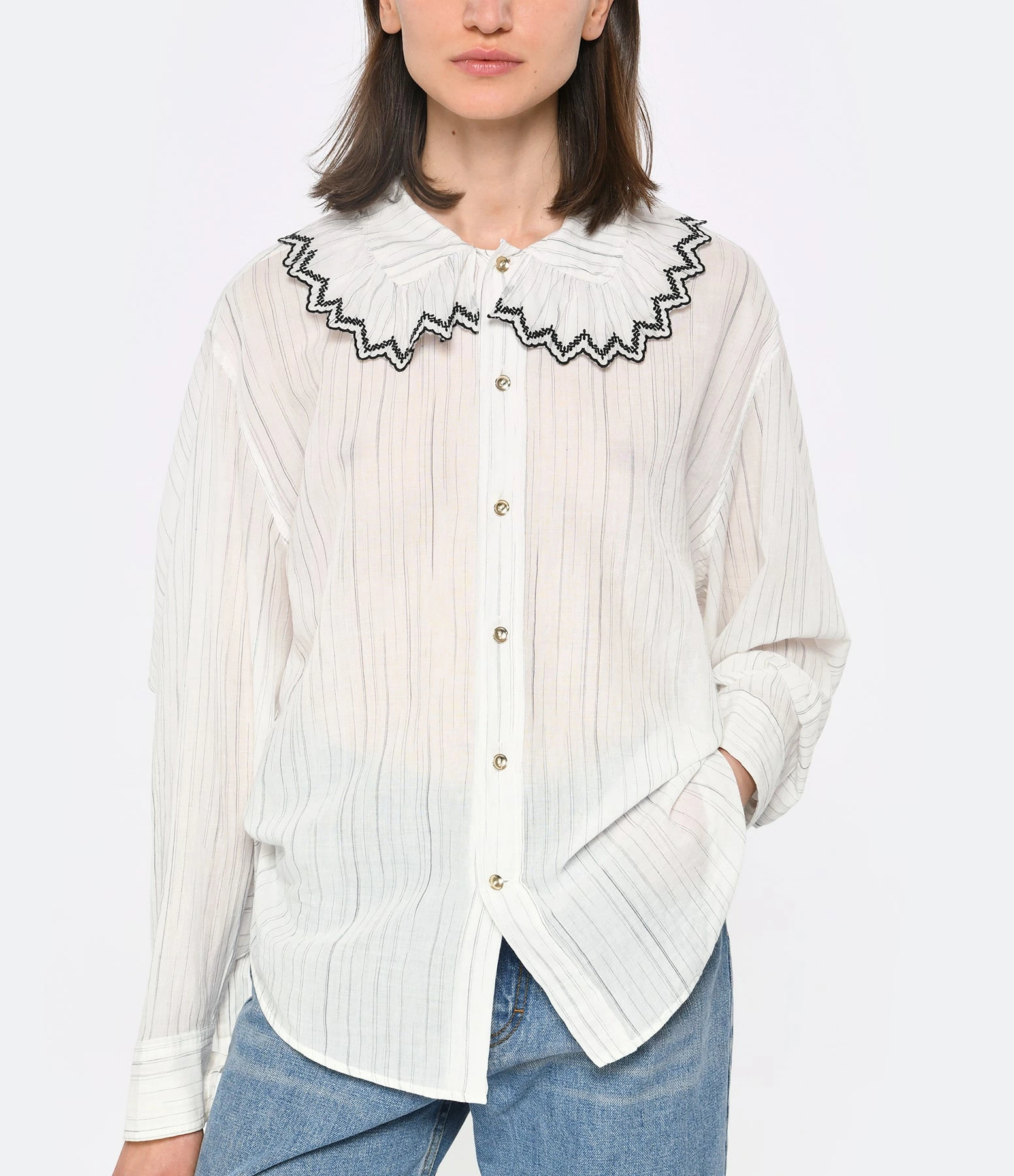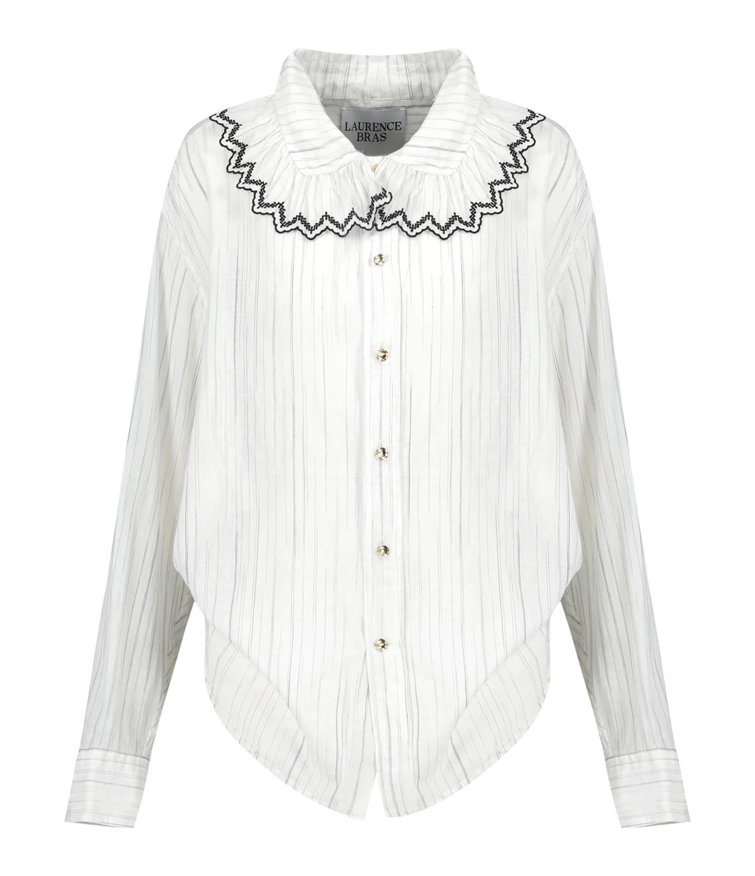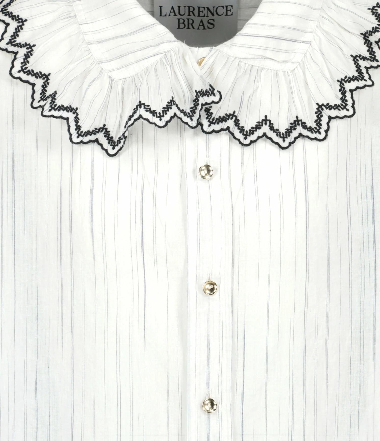 Blouse blanche en coton à fines rayures. Col rond avec broderies noires au niveau de l’encolure. Manches longues resserrées aux poignets par boutons. Fermeture par boutons dorés sur le devant. Coupe droite. Base arrondie.