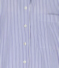 Blouse en coton bleu à rayures. Encolure arrondie boutonnée. Manches longues avec fentes et poignets boutonnés et froncés. Fermeture boutonnée sur le devant se terminant en fente. Épaules et dos froncés. Fentes latérales. Coupe ample. Base arrondie.