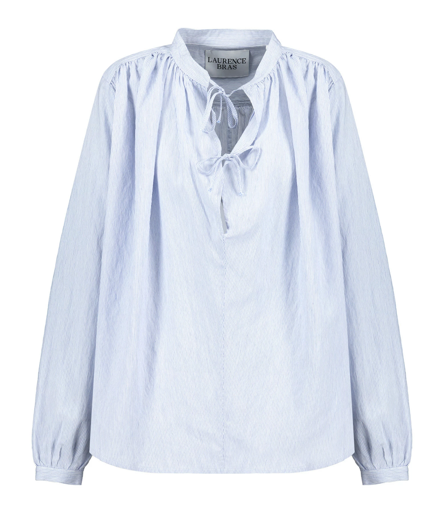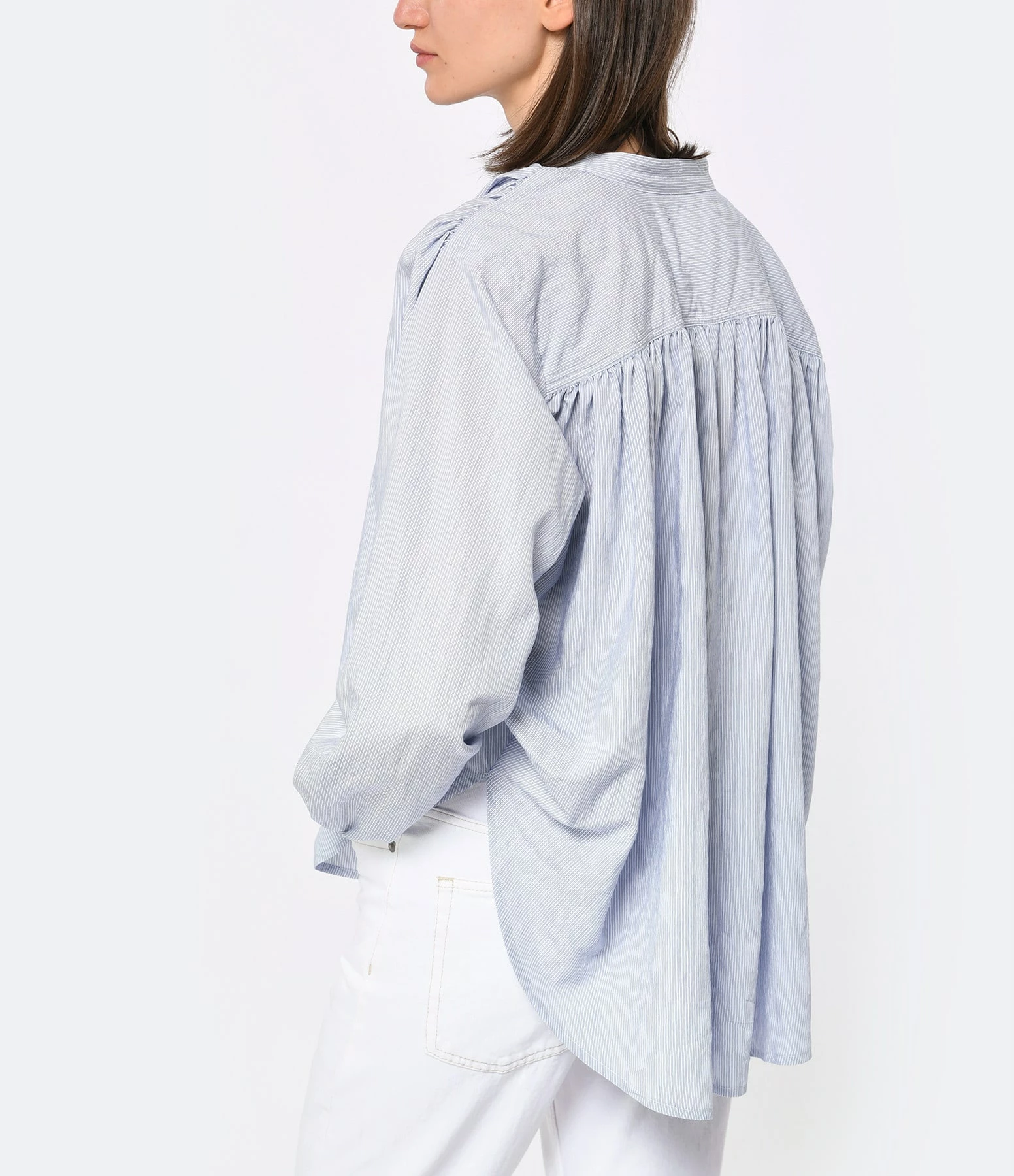 Blouse fluide à rayures bleues. Col mao. Encolure nouée par des liens. Epaules et dos froncés. Manches longues resserrées par boutons. Coupe droite. Base droite.