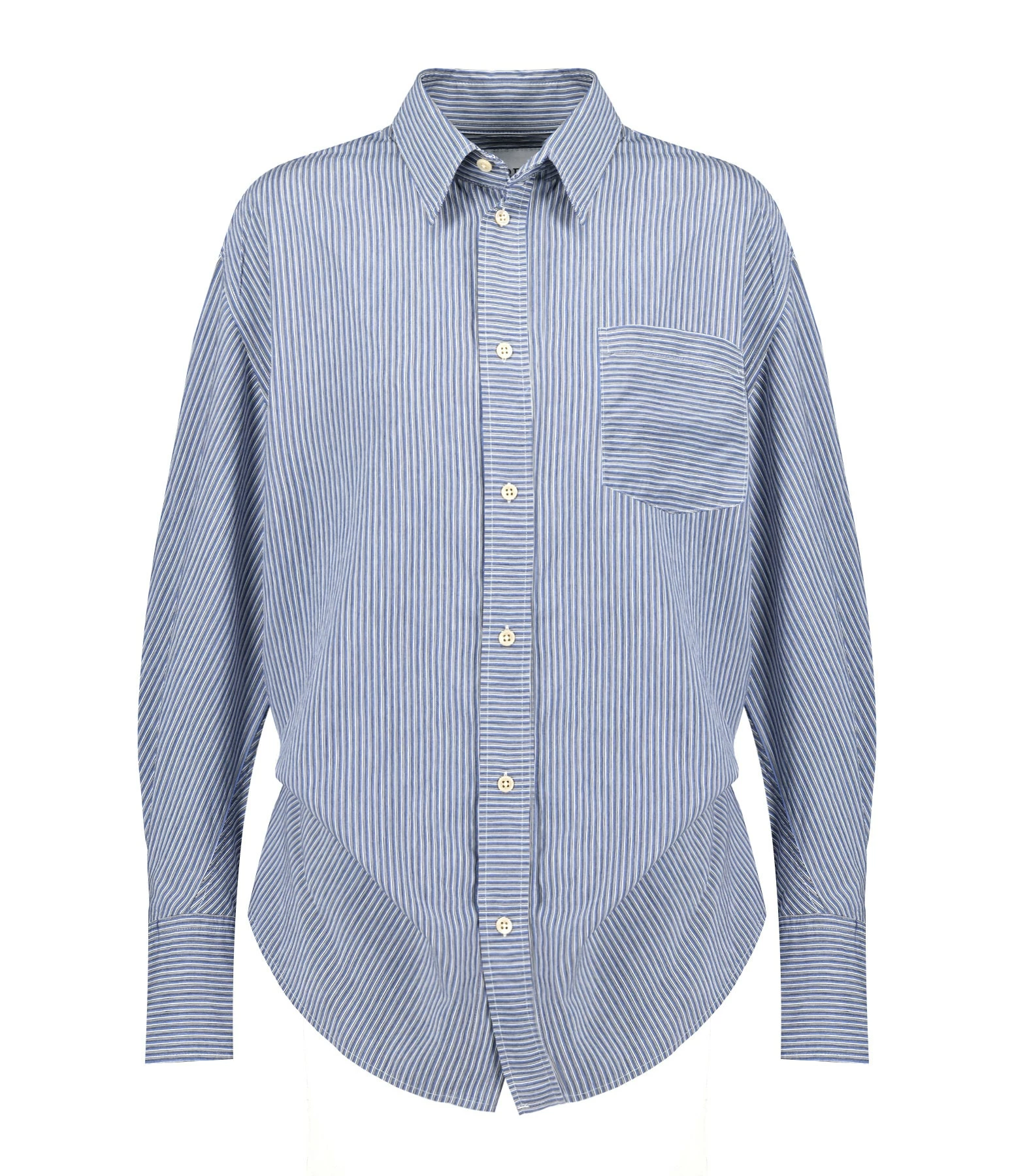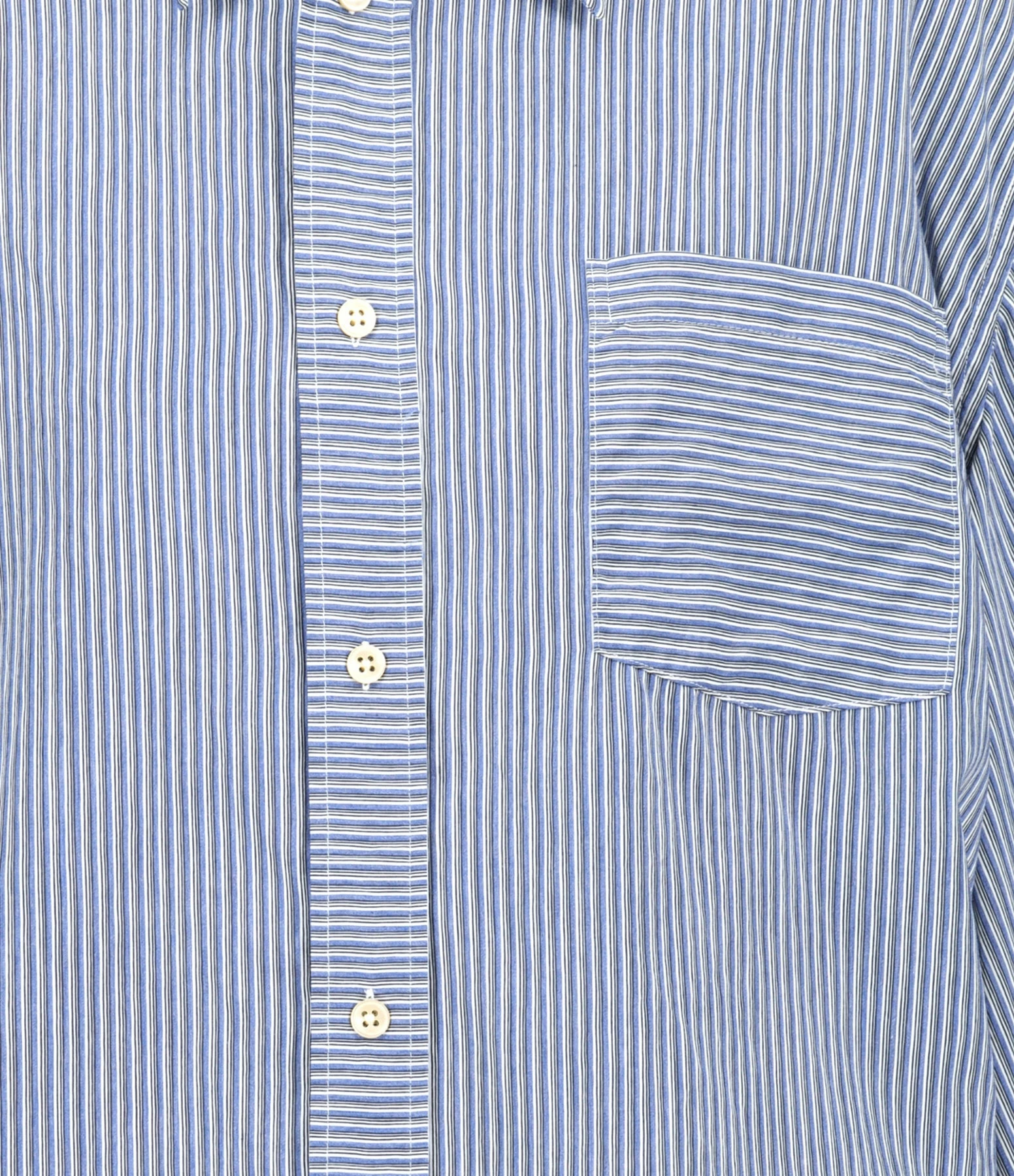 Chemise oversize à rayures bleues. Manches longues chauve-souris avec poignets resserrés par boutons. Col chemisier. Une poche plaquée poitrine. Coupe oversize. Base droite.