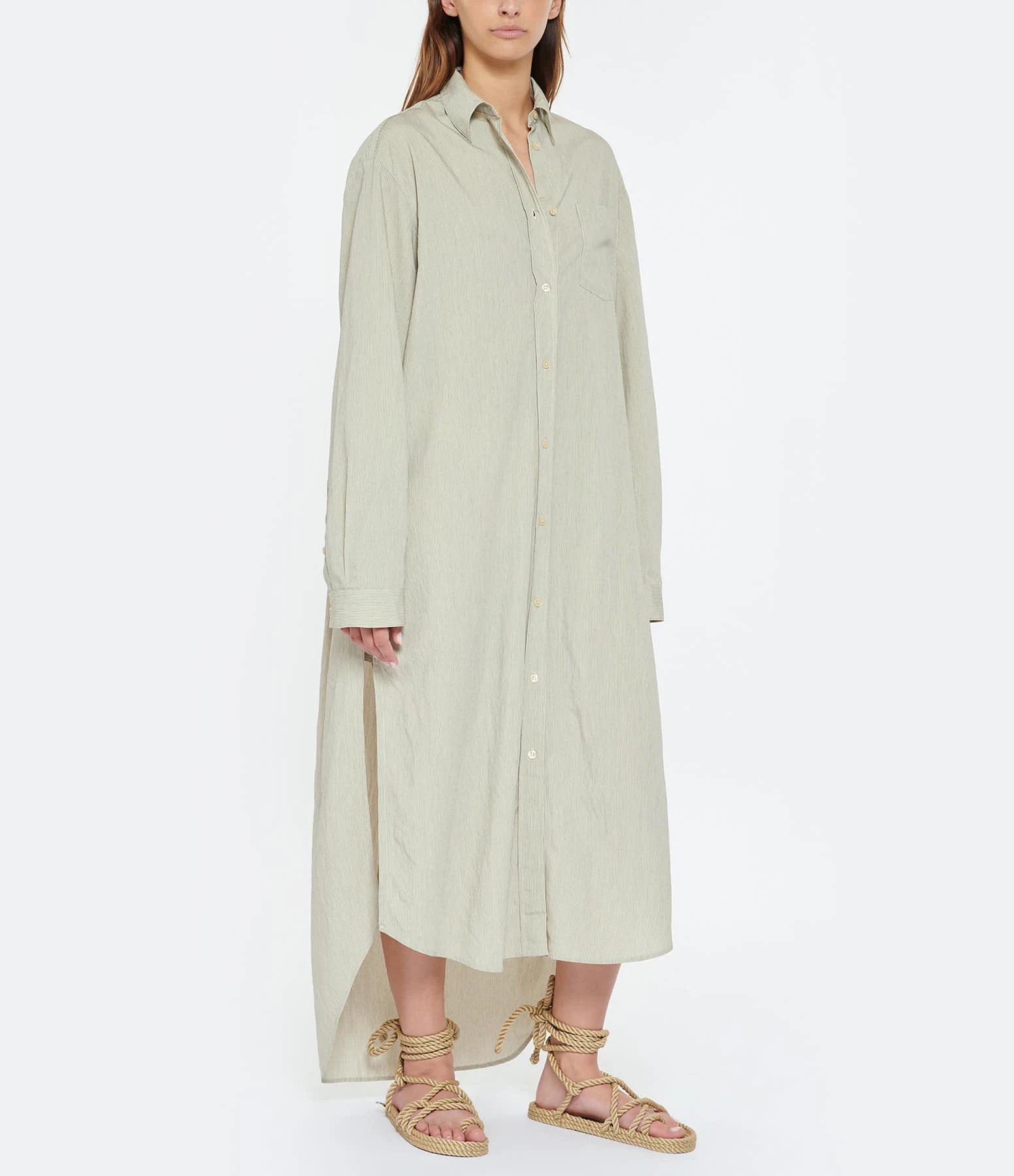 Robe chemise longue en coton à rayures bleues et blanches. Manches longues boutonnées aux poignets. Col chemisier. Fermeture par boutons sur le devant. Fentes latérales au bas. Une poche plaquée poitrine. Coupe droite. Base droite.