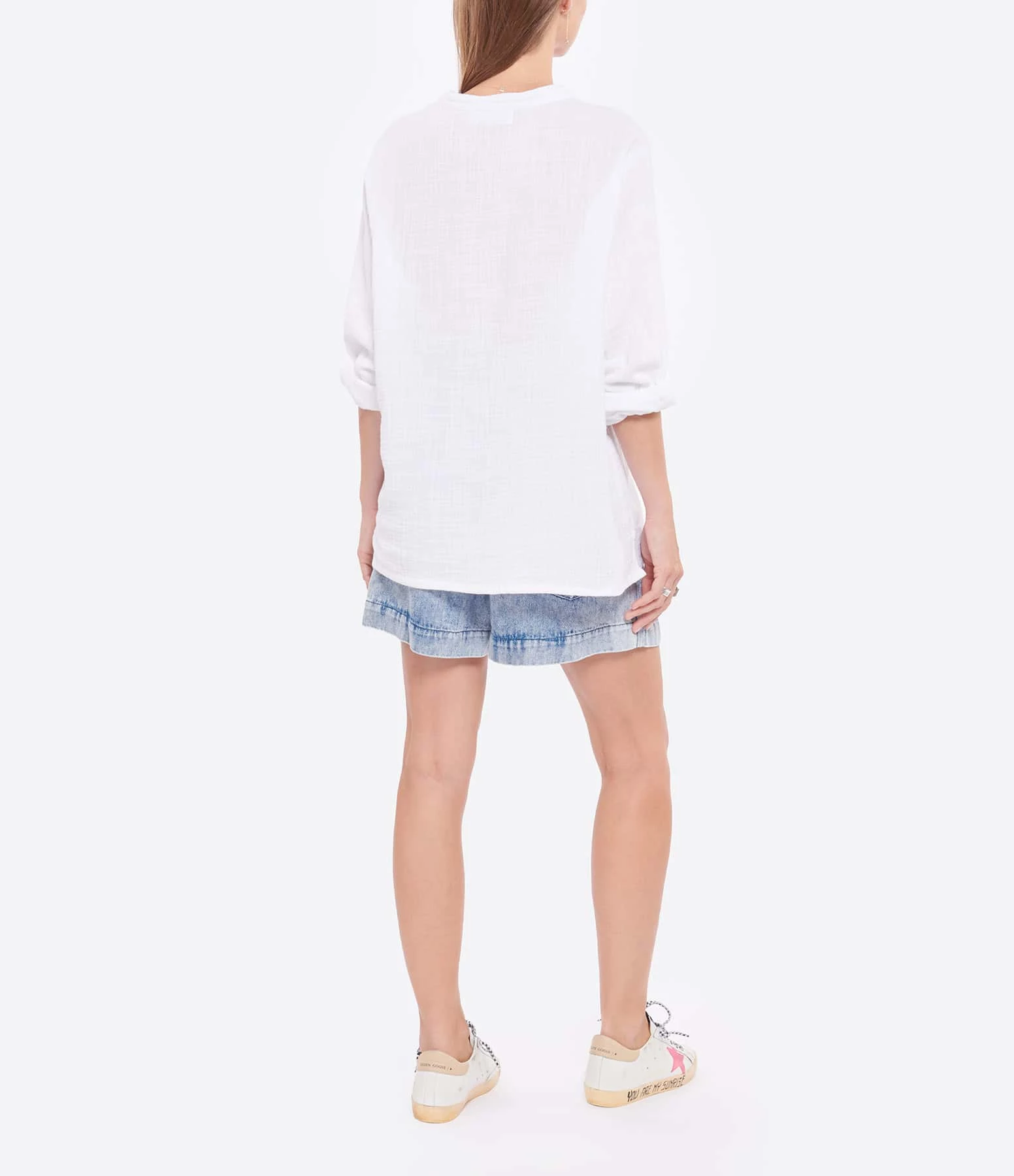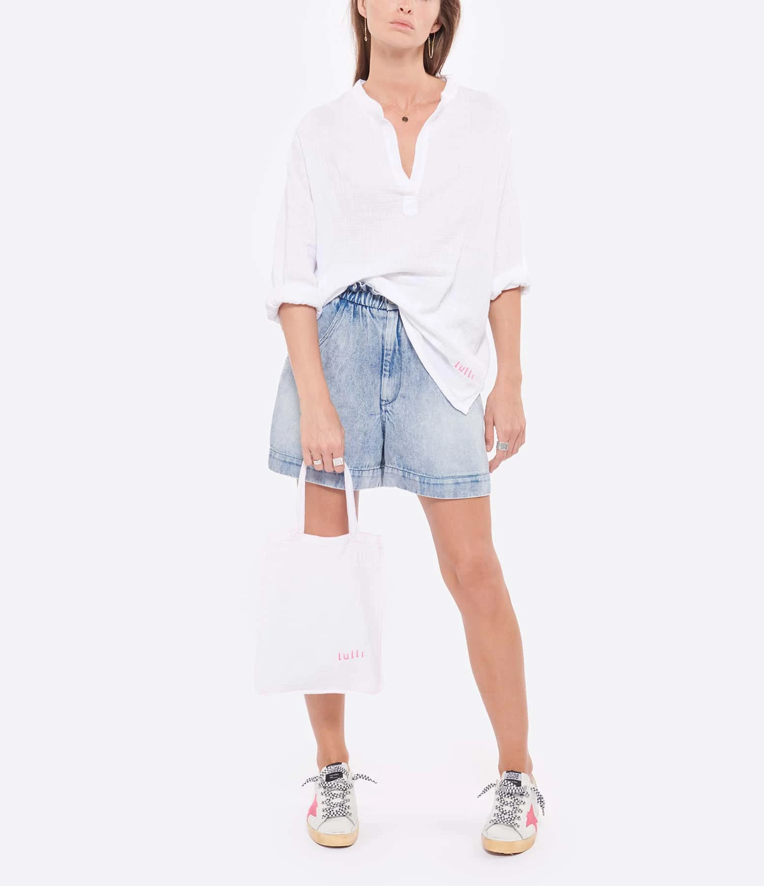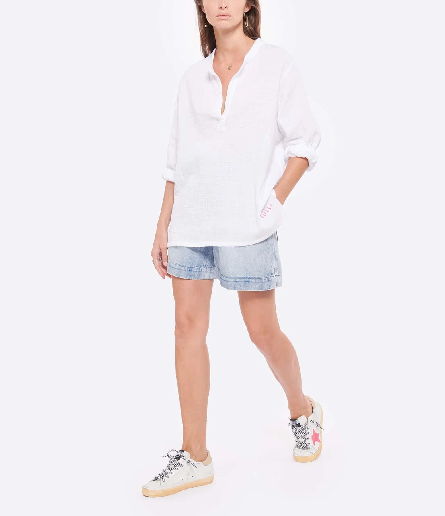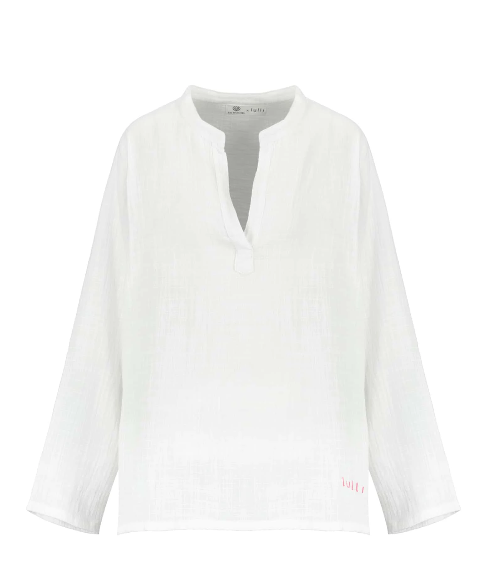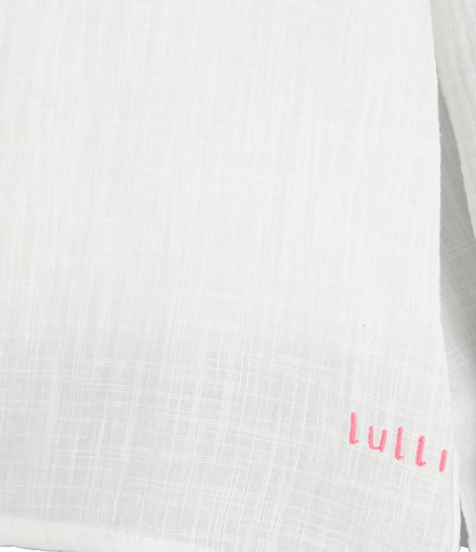 Blouse en coton blanc. Encolure en fente. Manches longues. Broderie “LULLI” en rose sur le bas du vêtement. Fentes latérales. Coupe droite ample. Base droite.