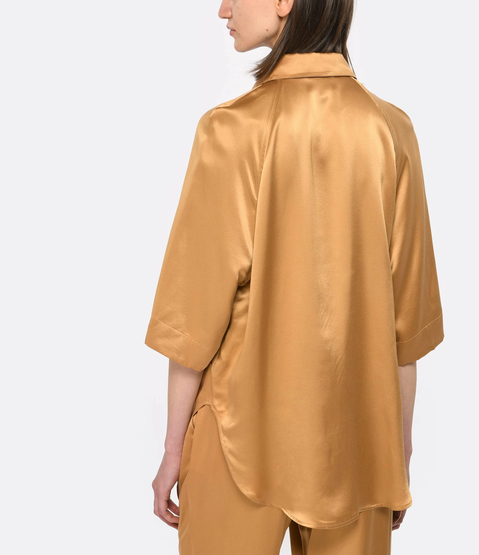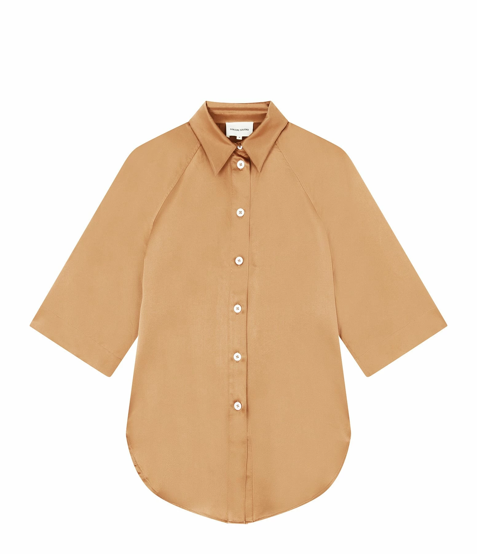 Chemise en soie camel. Col chemisier. Fermeture par boutons sur le devant. Manches courtes. Coupe droite. Base arrondie.