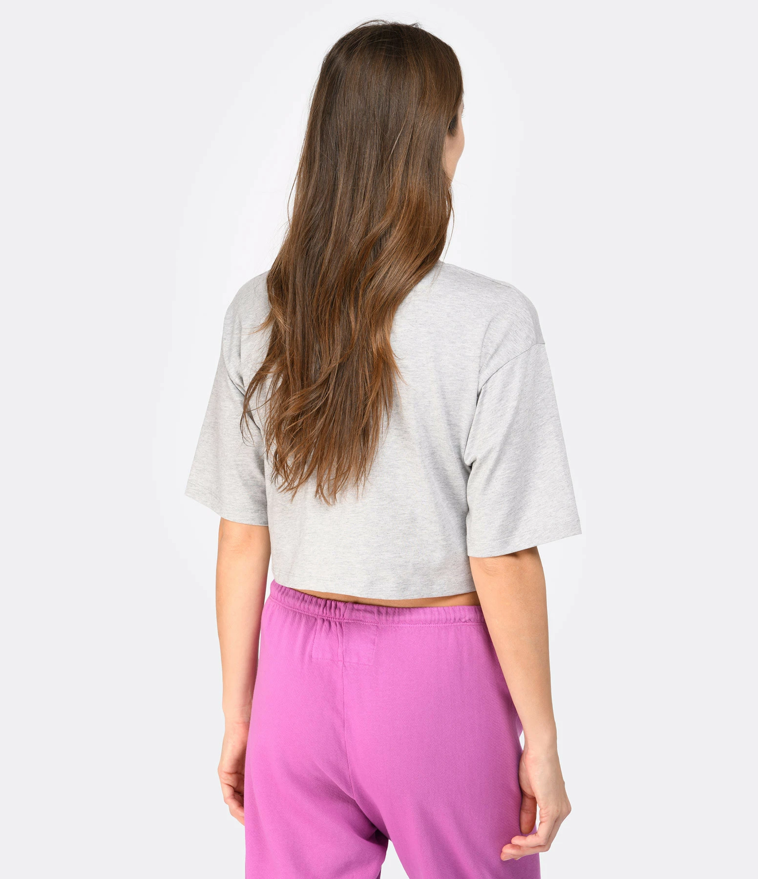 Tee-shirt en coton gris chiné avec le logo coquillage brodé ton sur ton sur le devant. Col rond côtelé. manches courtes. Coupe droite. Longueur raccourcie. Base droite.