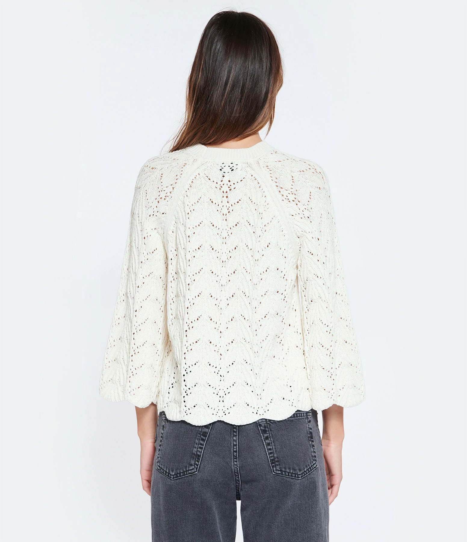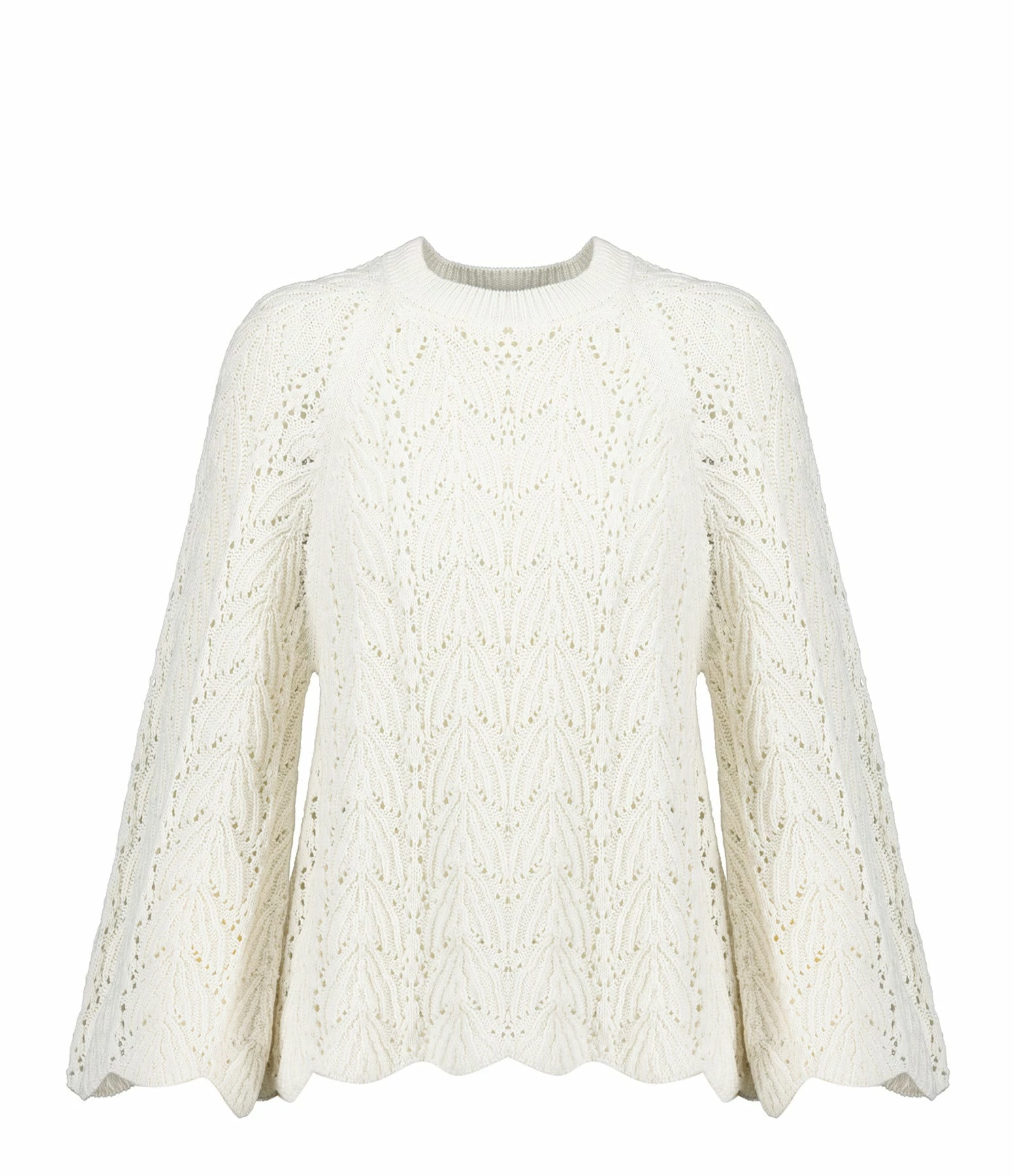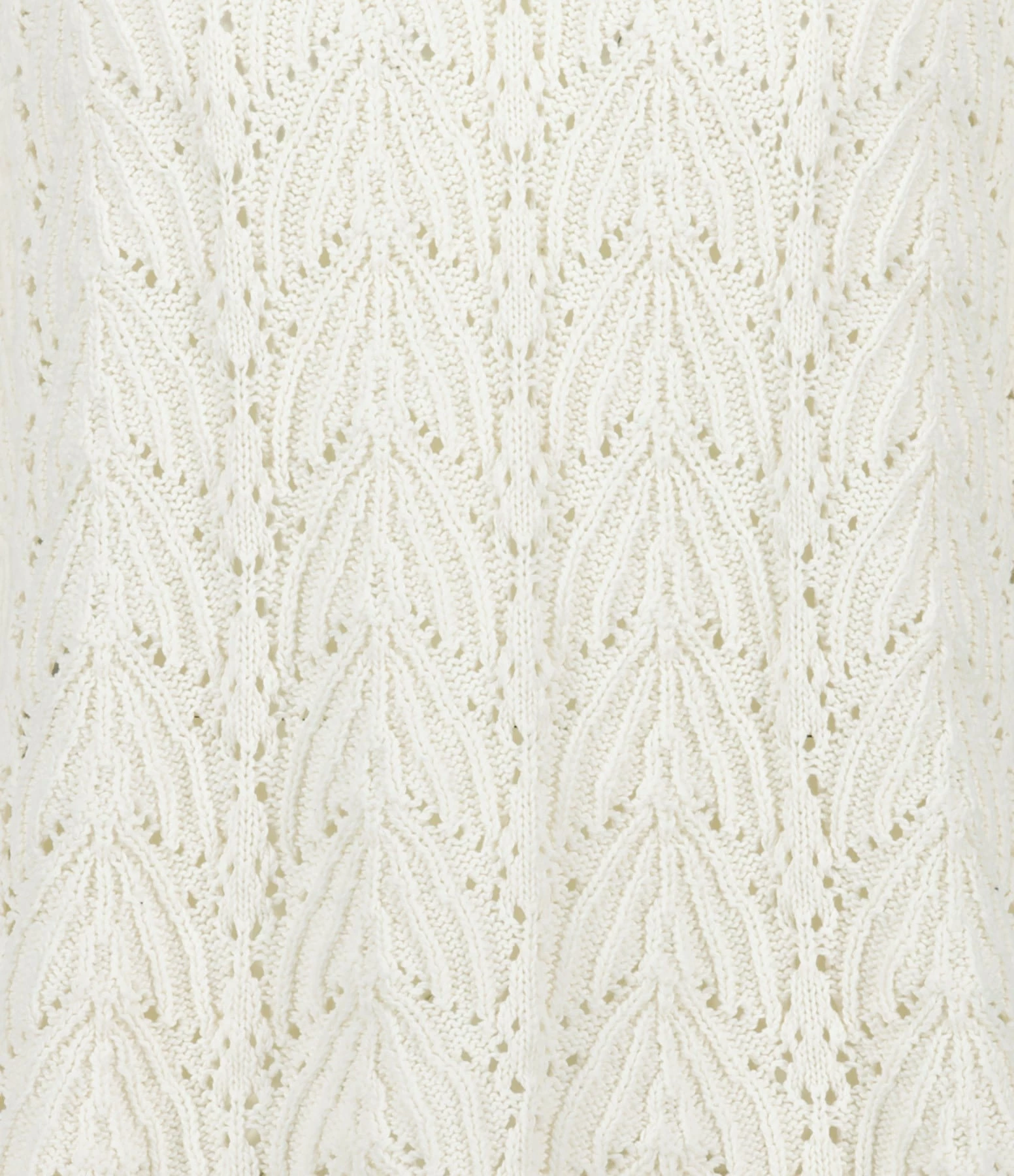 Top en coton crocheté ivoire. Col rond côtelé. Manches longues évasées avec extrémités ondulées. Coupe droite. Base légèrement ondulée.