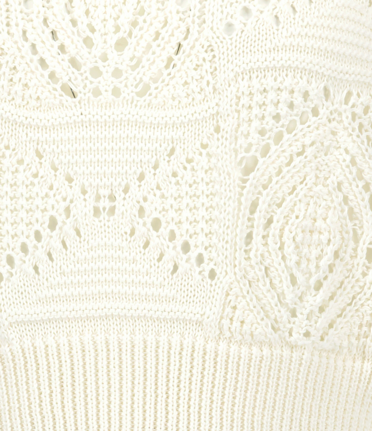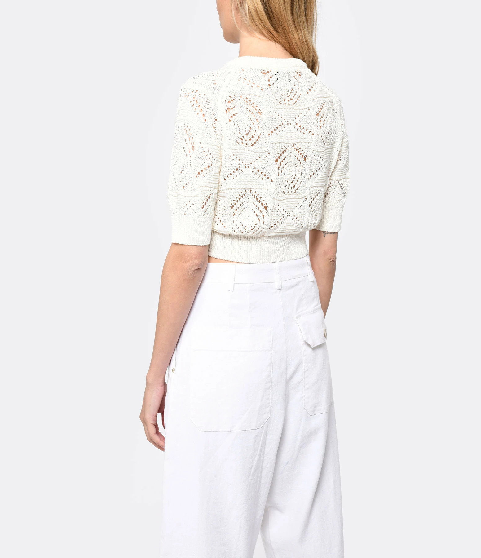 Top court en crochet ivoire. Ajouré. Col rond. Manches courtes. Coupe droite. Base droite.