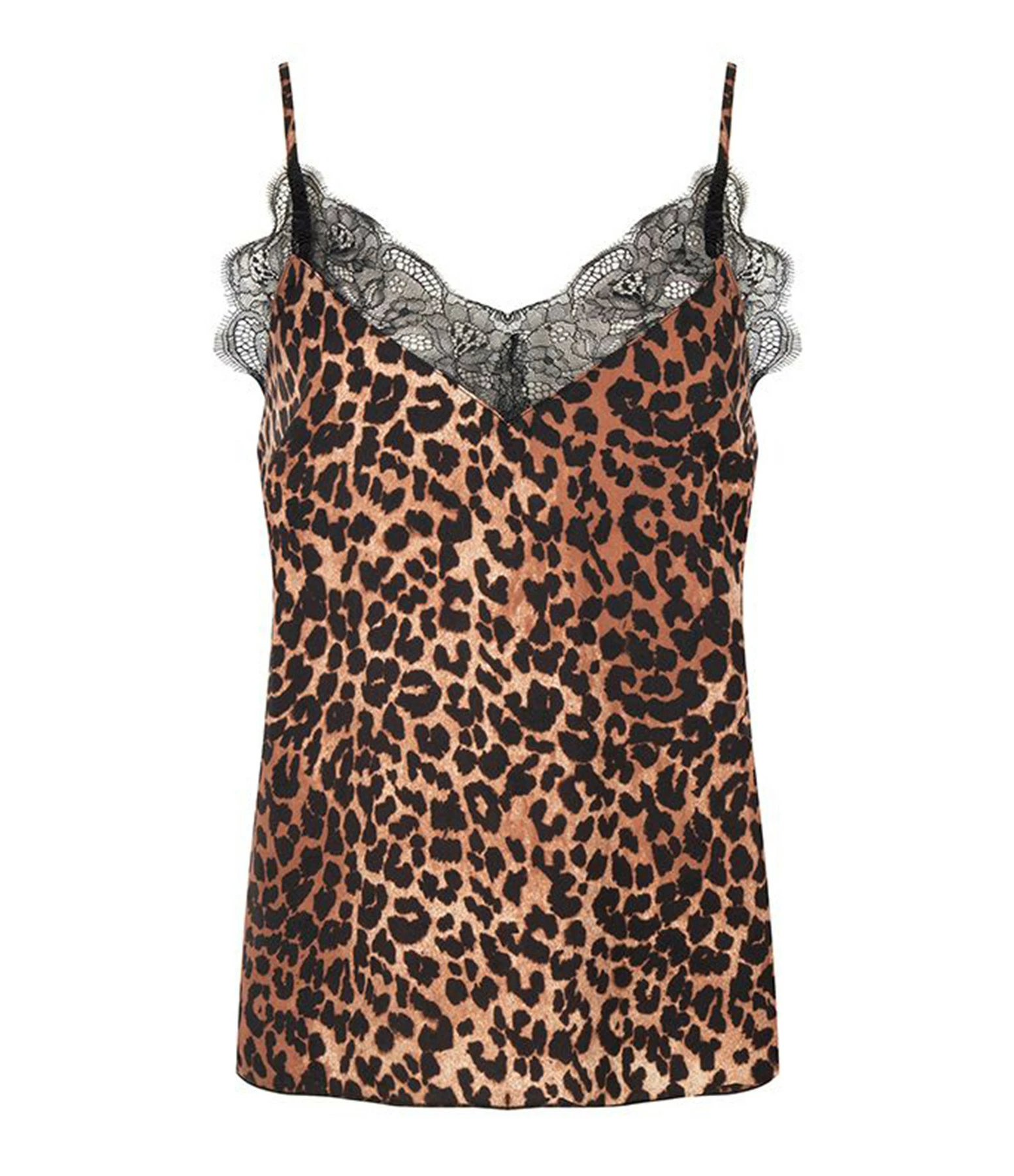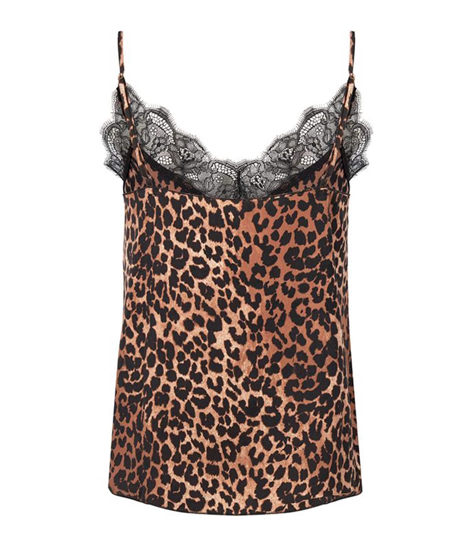 Top à fines bretelles réglables à imprimé léopard orné de dentelles sur le décolleté. Base droite légèrement fendue sur les cotés (4 cm). Non doublé.