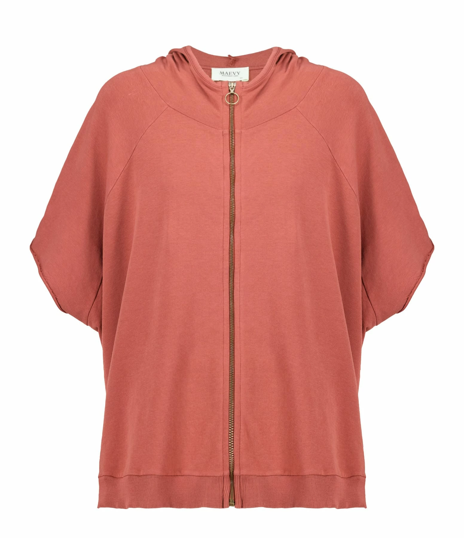 Sweatshirt à capuche en coton rouge brique à manches courtes. Fermeture par zip. Coupe oversize. Base droite.