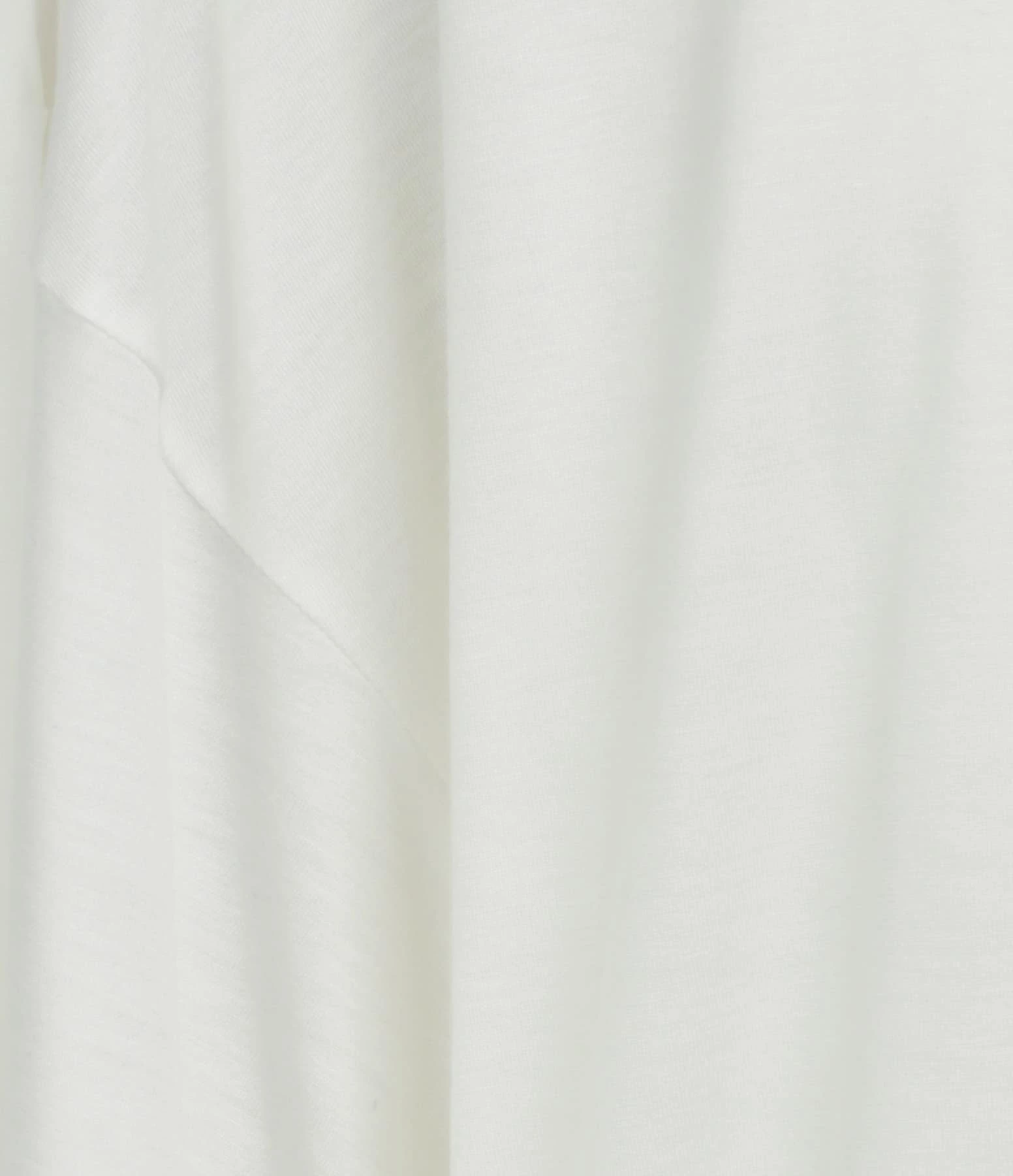 Tee-shirt en bambou blanc. Col en V. Manches courtes. Coupe oversize. Base droite. Non doublé.