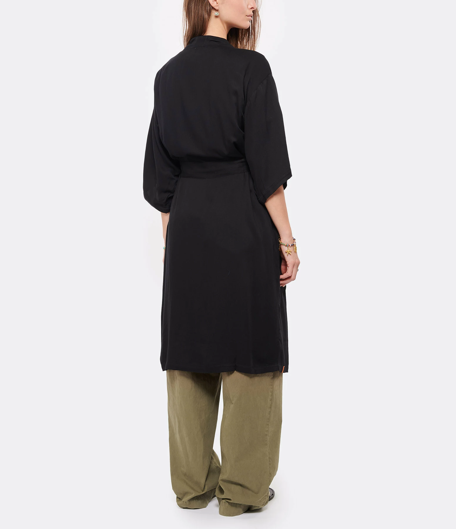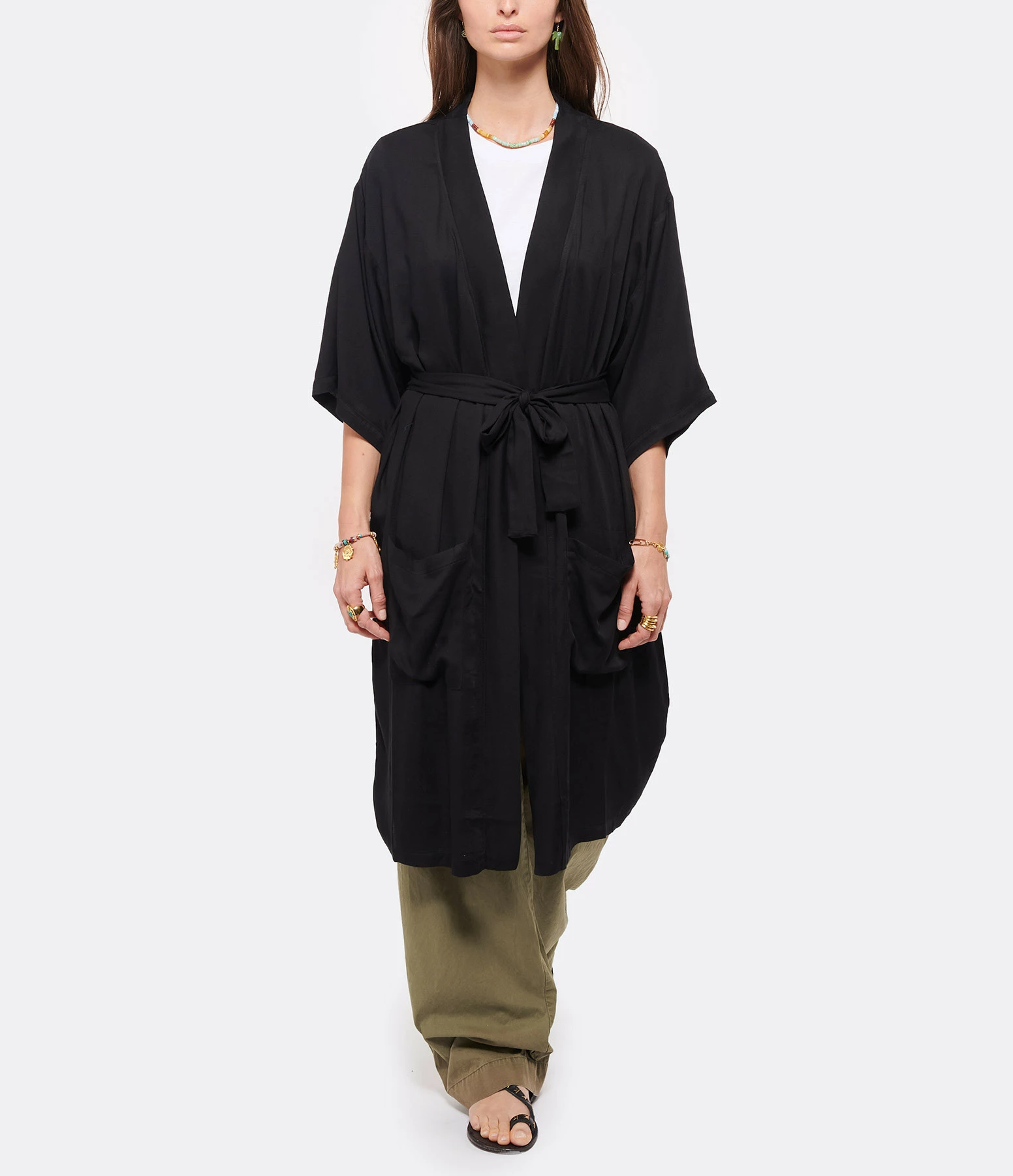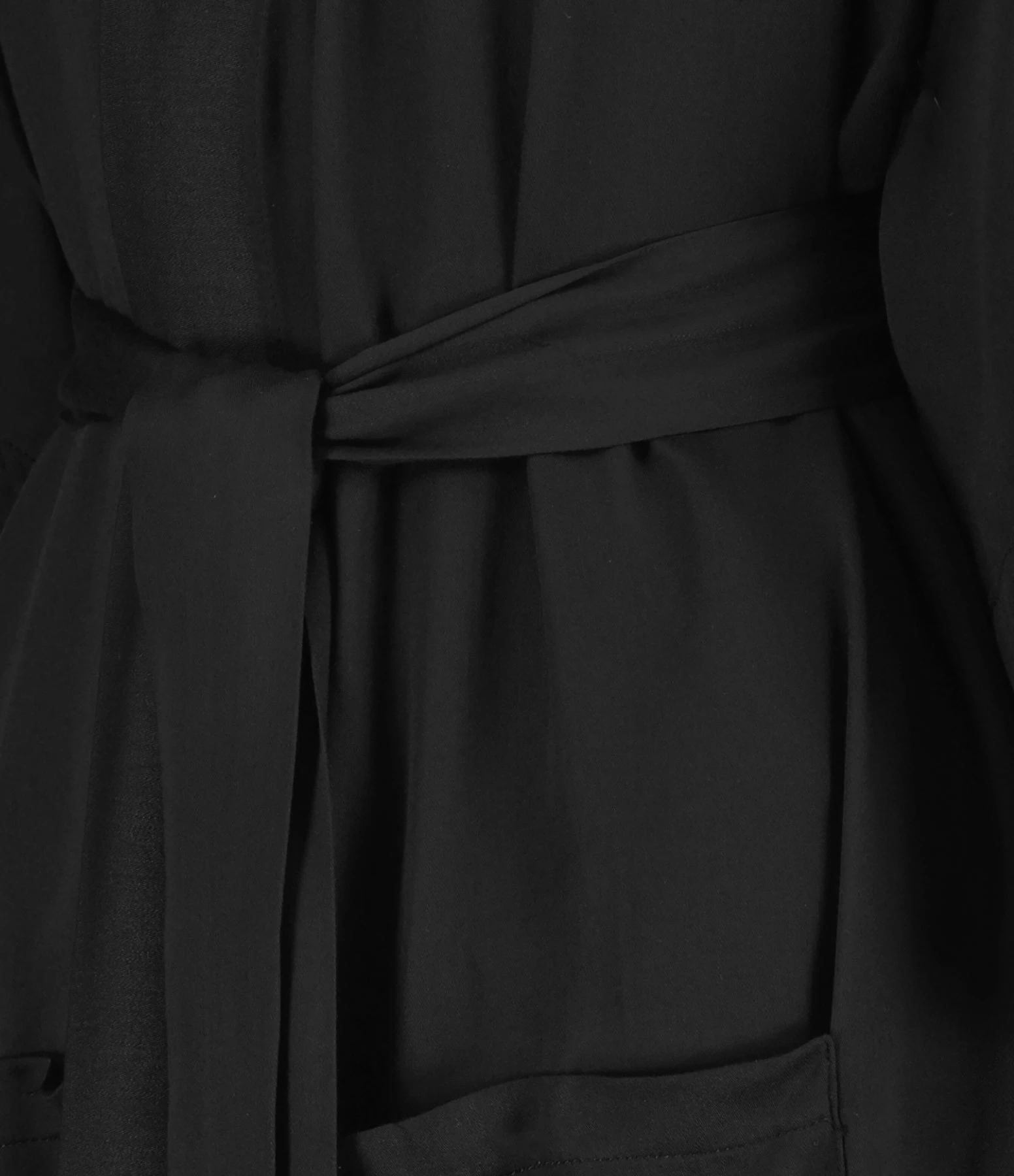 Veste longue noire. Ceinture intégrée à nouer a la taille. Deux poches plaquées sur les côtés. Manches 3/4. Coupe ample. Base droite.