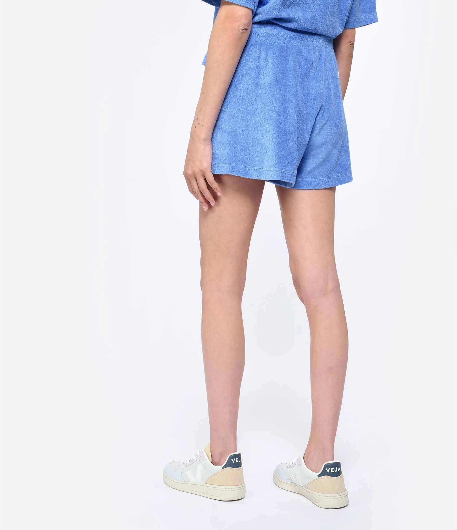 Short bleu en éponge. Broderie palmier et “CLUB VACANCES” au bas. Taille élastiquée avec cordons de serrage. Deux poches à l’avant. Coupe droite. Base droite.