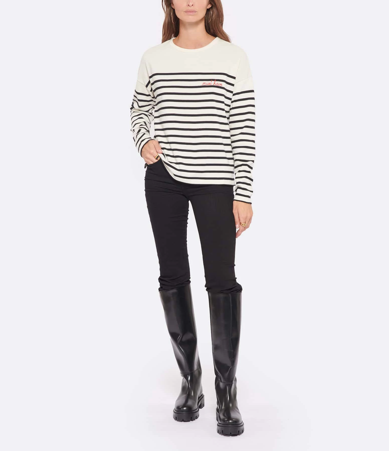 Marinière en coton écru à rayures noires. Broderie “must have” côté cœur. Manches longues. Col rond. Coupe droite. Base droite.