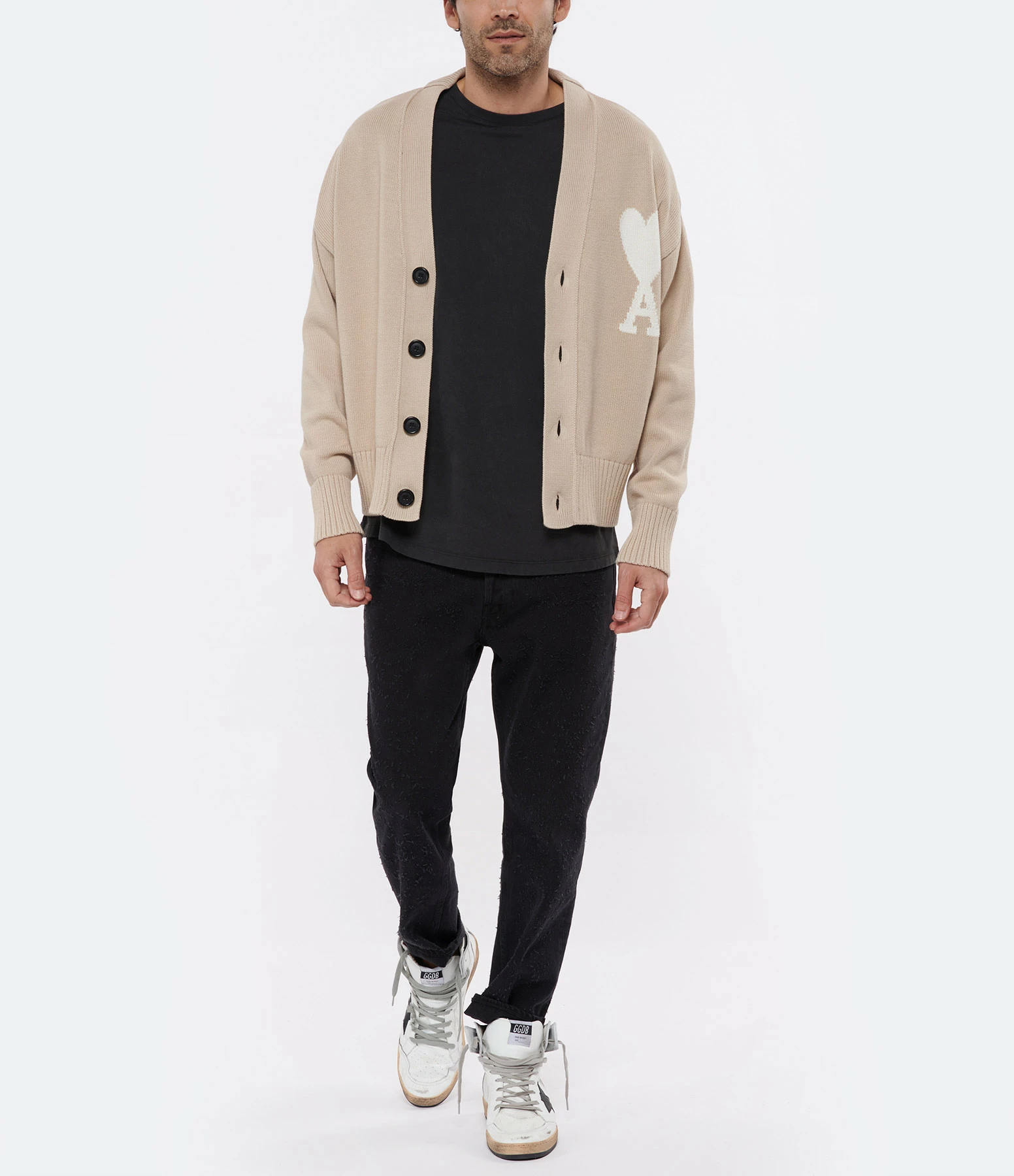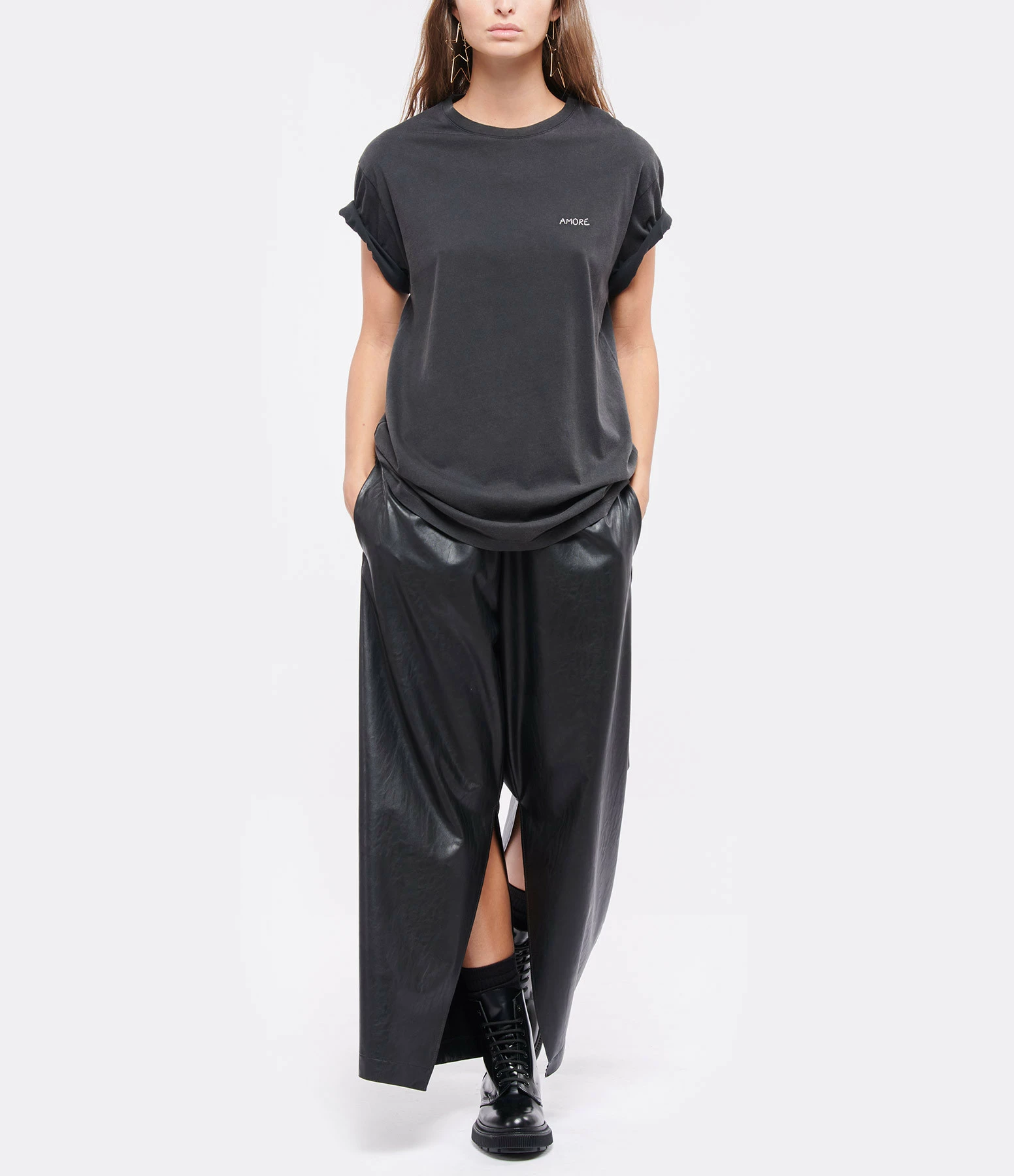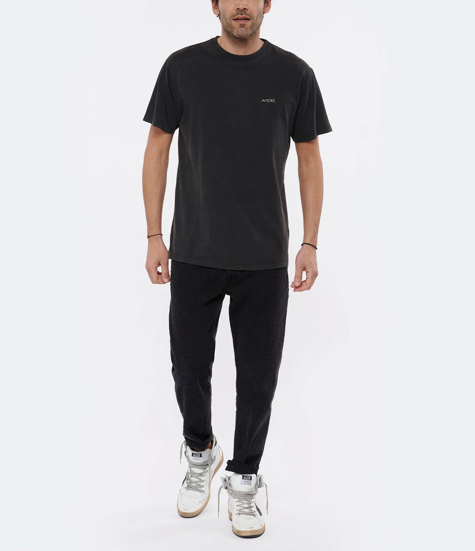 Tee-shirt en coton gris foncé. Broderie gris clair “AMORE” côté cœur. Col rond. Manches courtes. Coupe droite. Base droite.