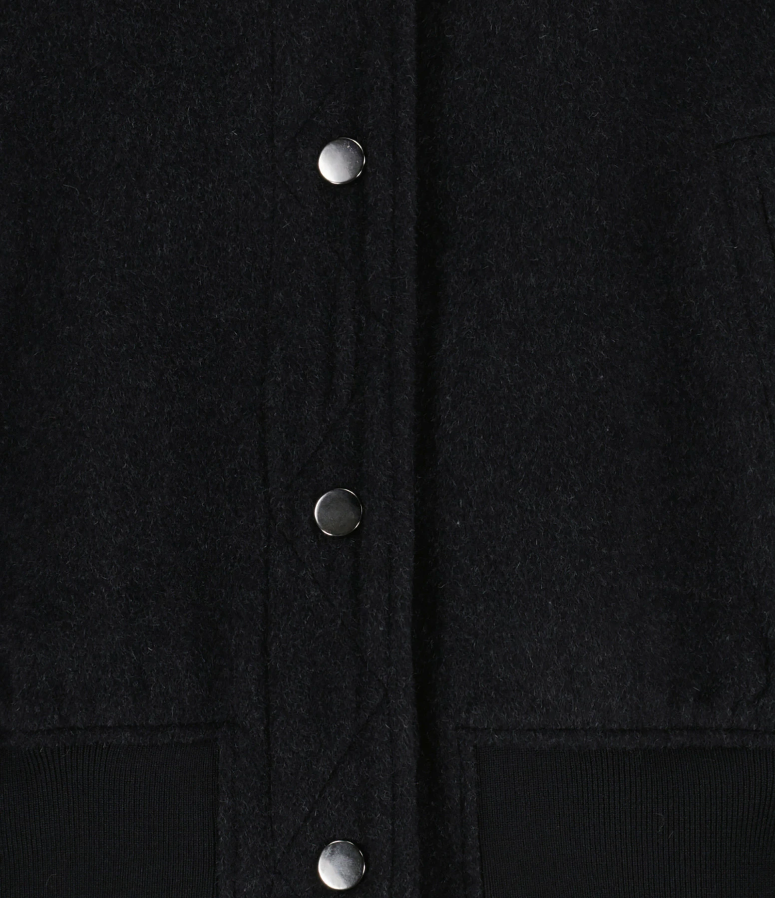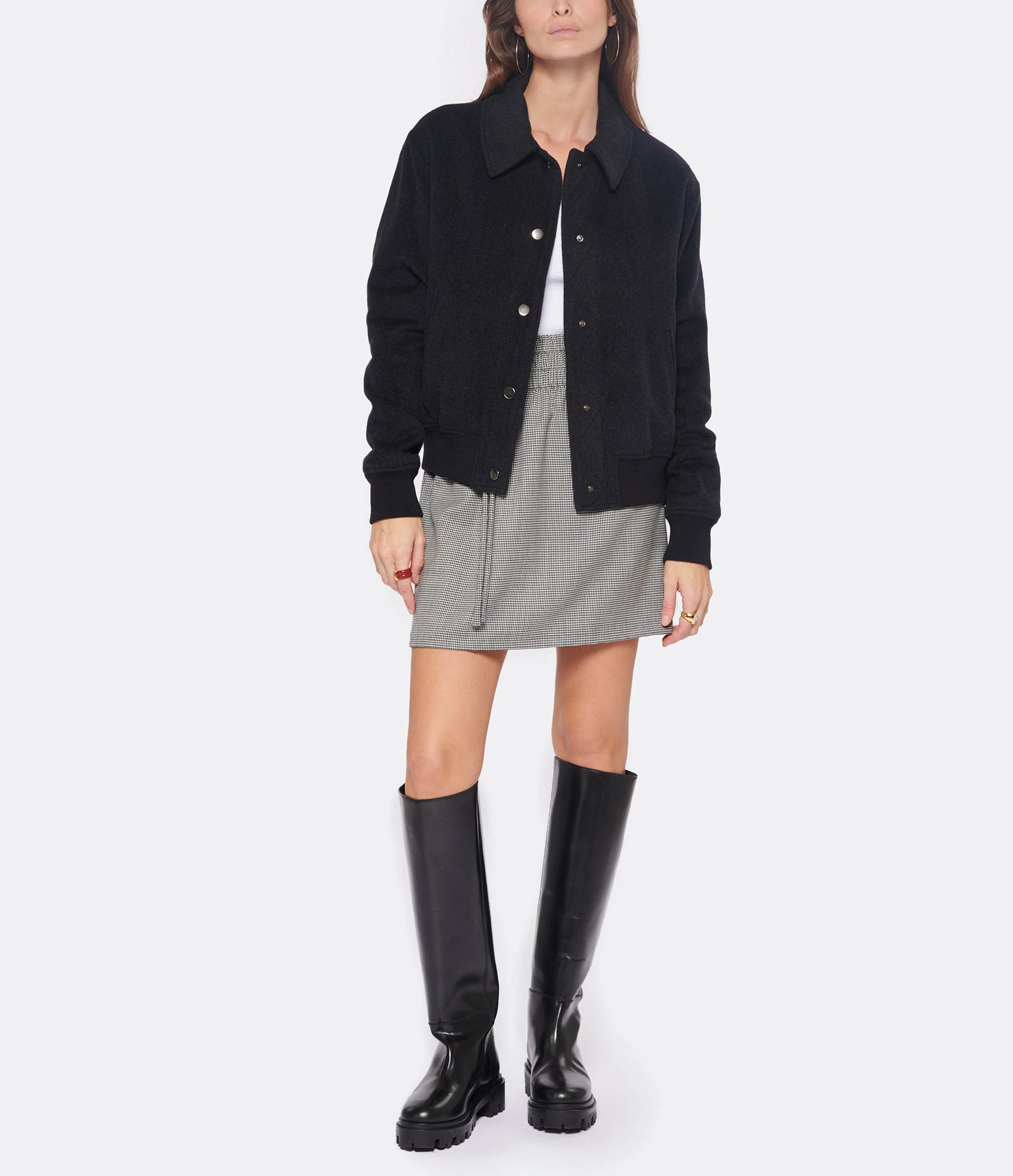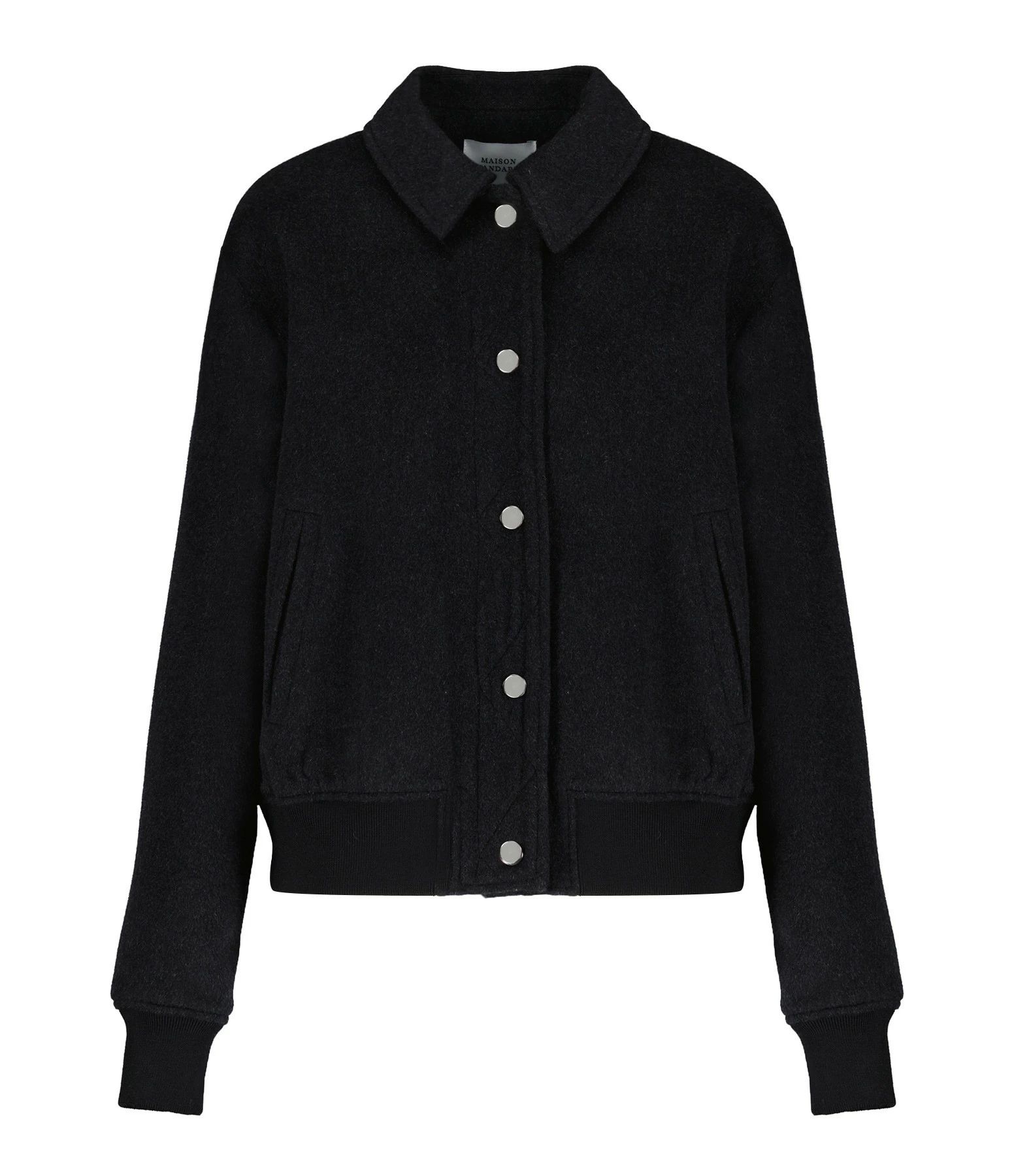 Blouson en laine mélangée gris anthracite. Col chemisier. Manches longues avec poignets en maille côtelée. Fermeture pressionnée sur le devant. Boutons pression argenté. Deux poches passepoilées sur le devant. Coupe droite. Base droite en maille côtelée. Doublé et rembourré.