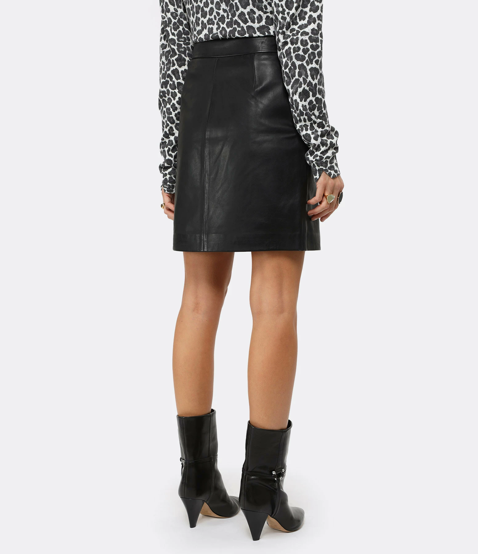 Jupe courte en cuir noir. Fermeture par un zip sur le côté. Coupe droite et base droite. Doublée.