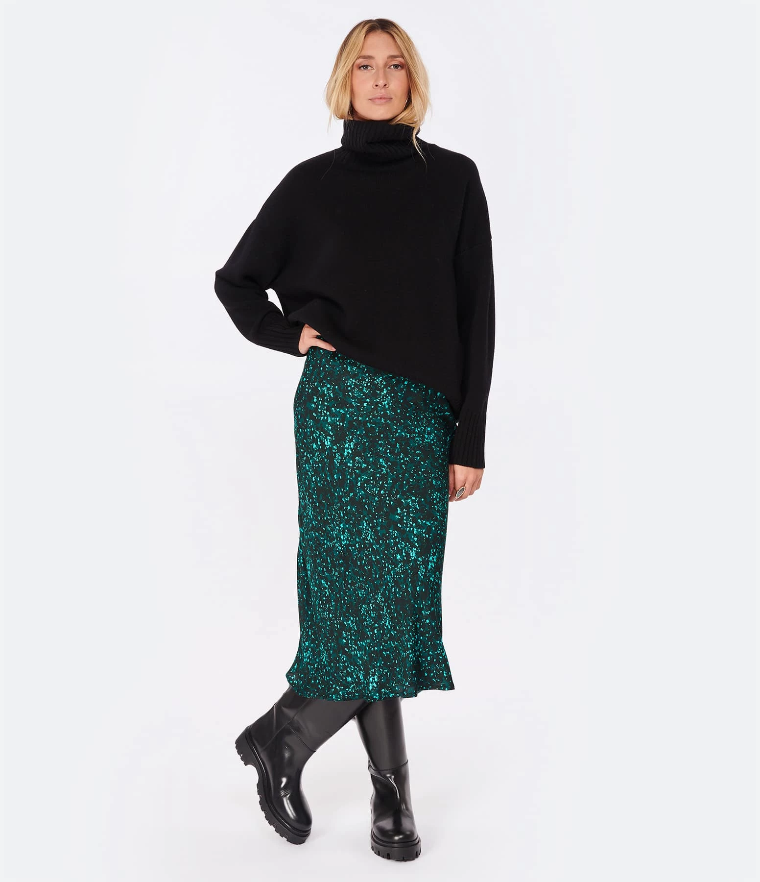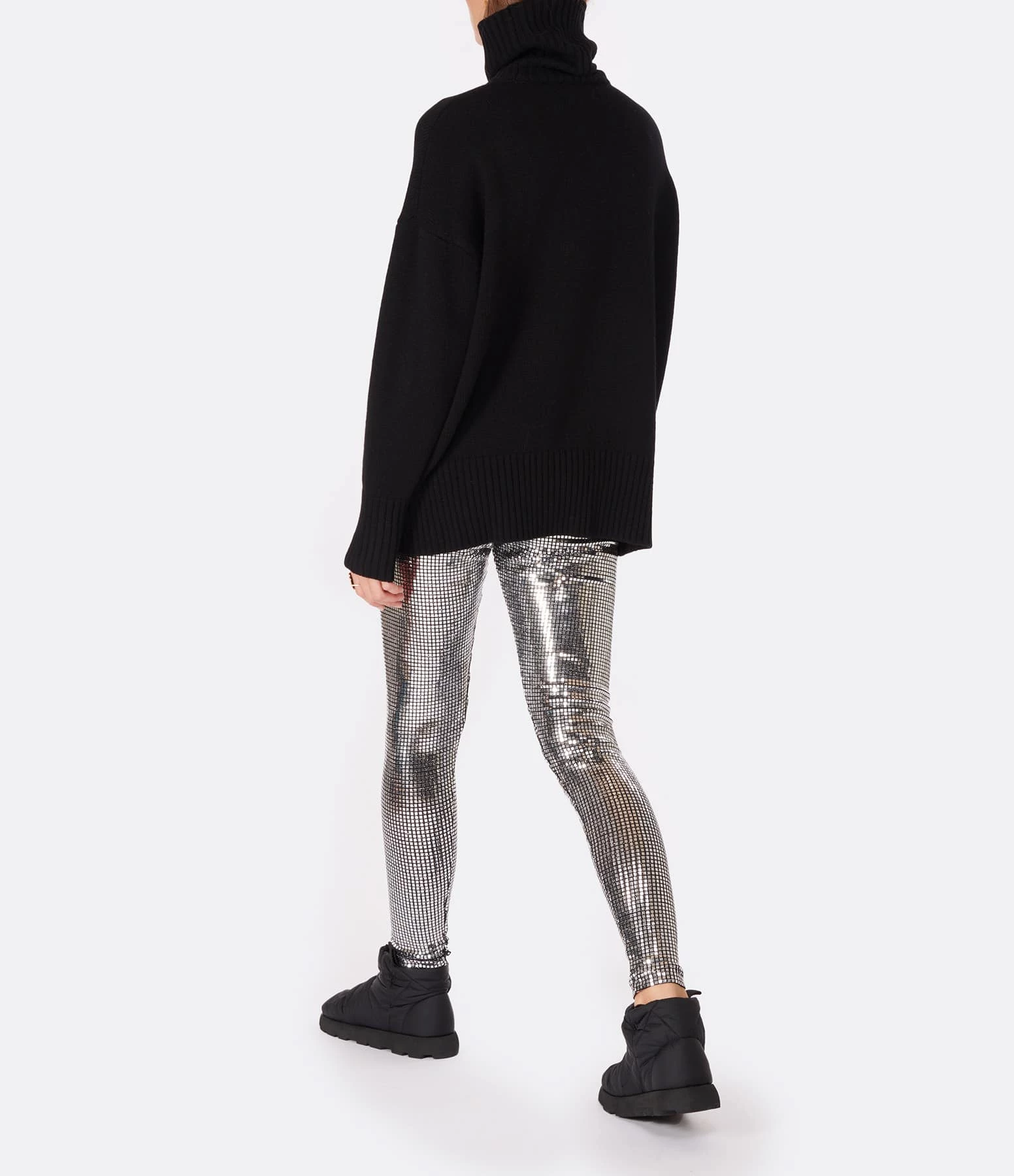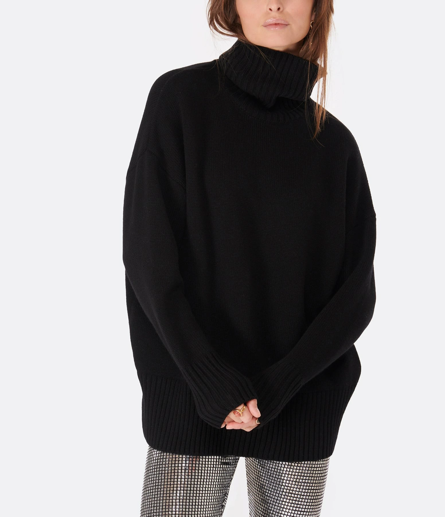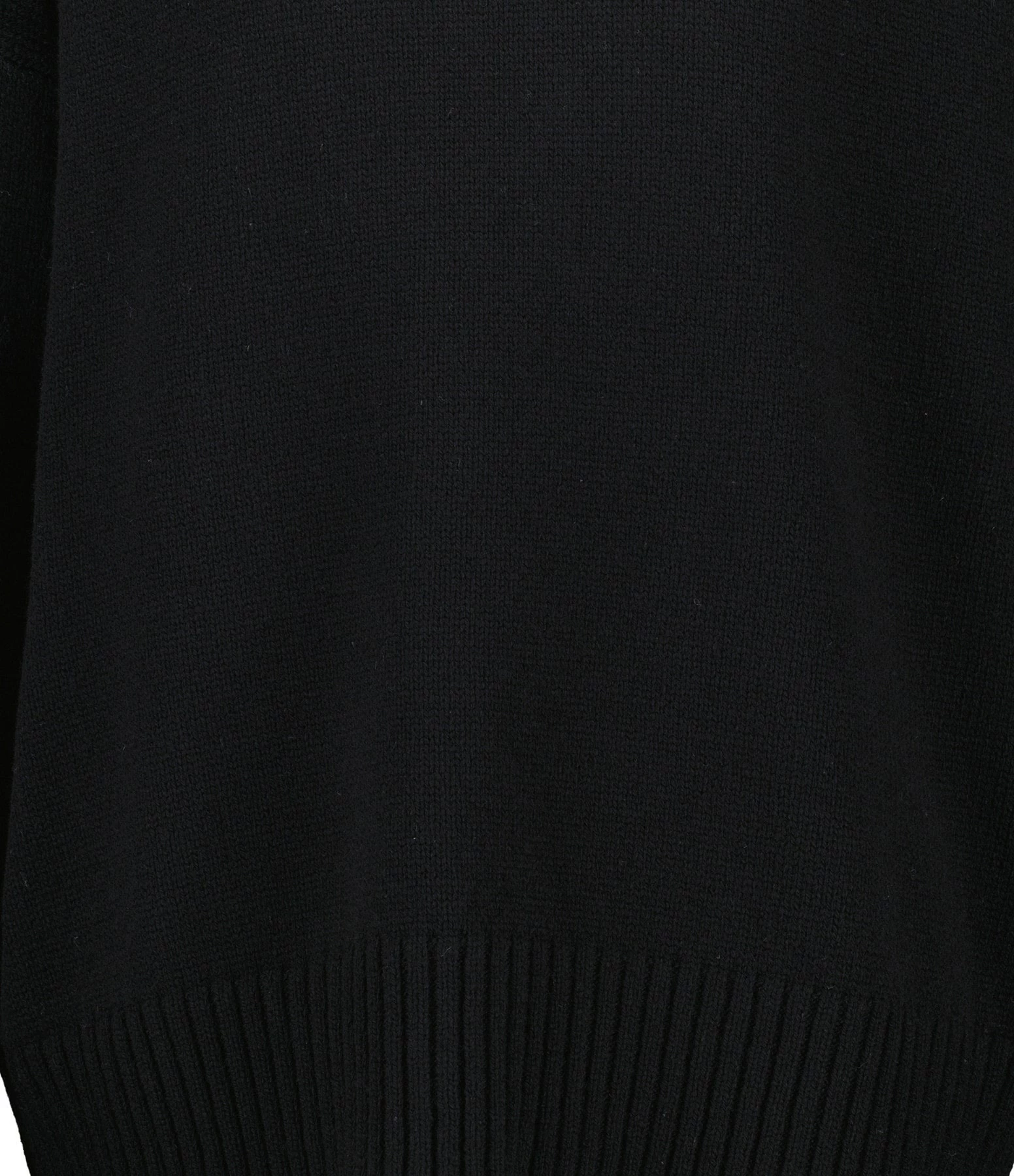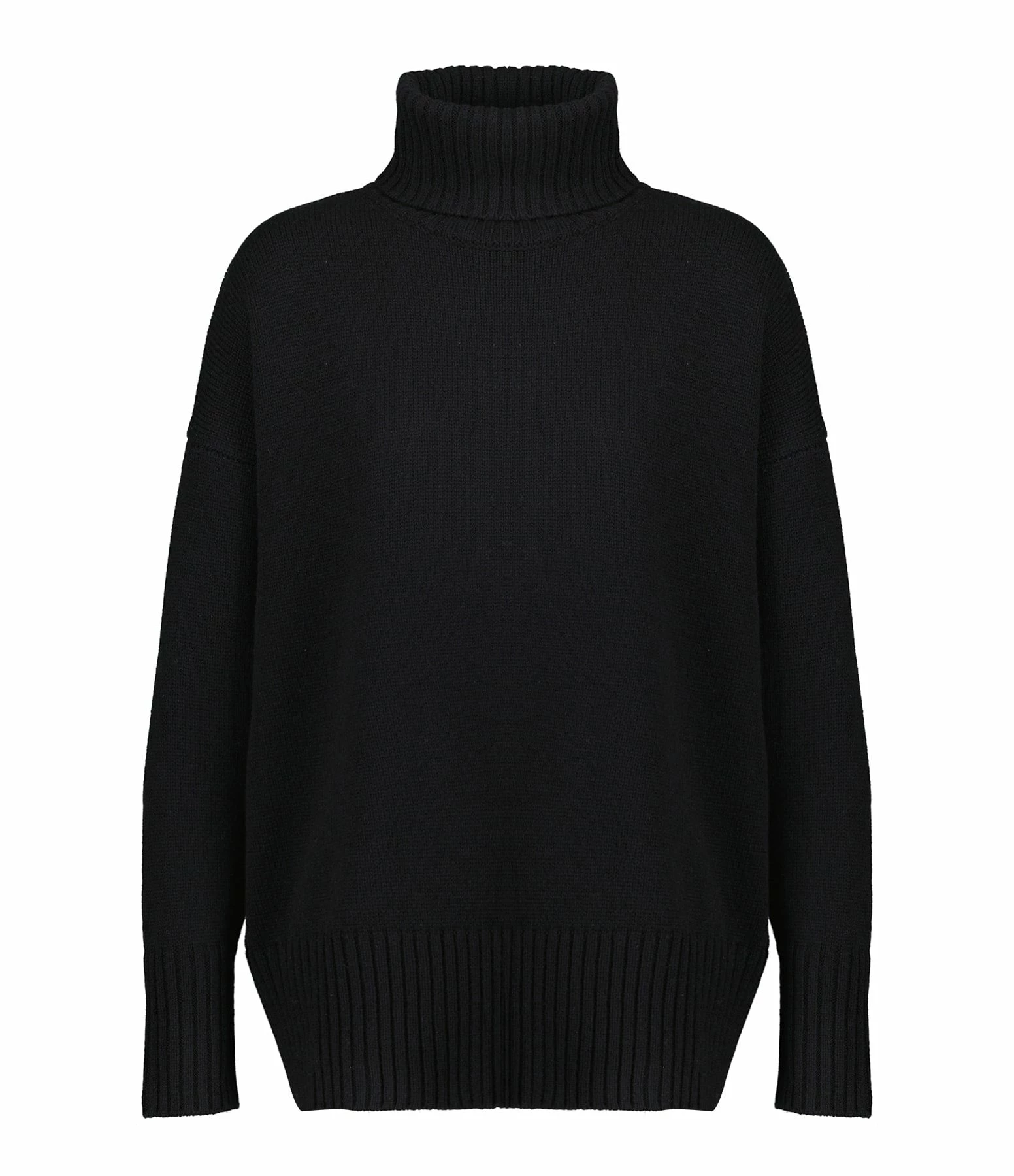 Pull en maille de laine noir. Col montant côtelé. Manches longues avec poignets côtelés. Coupe ample. Base droite côtelée.