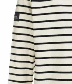Pull en maille torsadée de laine écru. Col montant côtelé. Manches longues avec poignets côtelés. Coupe ample. Base droite côtelée.