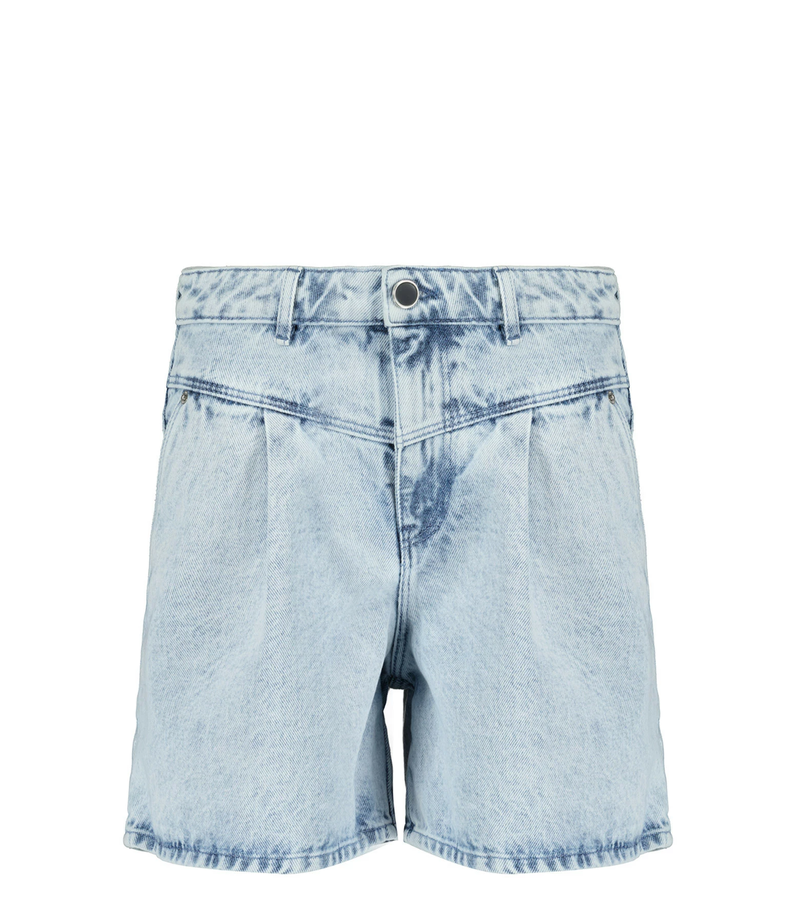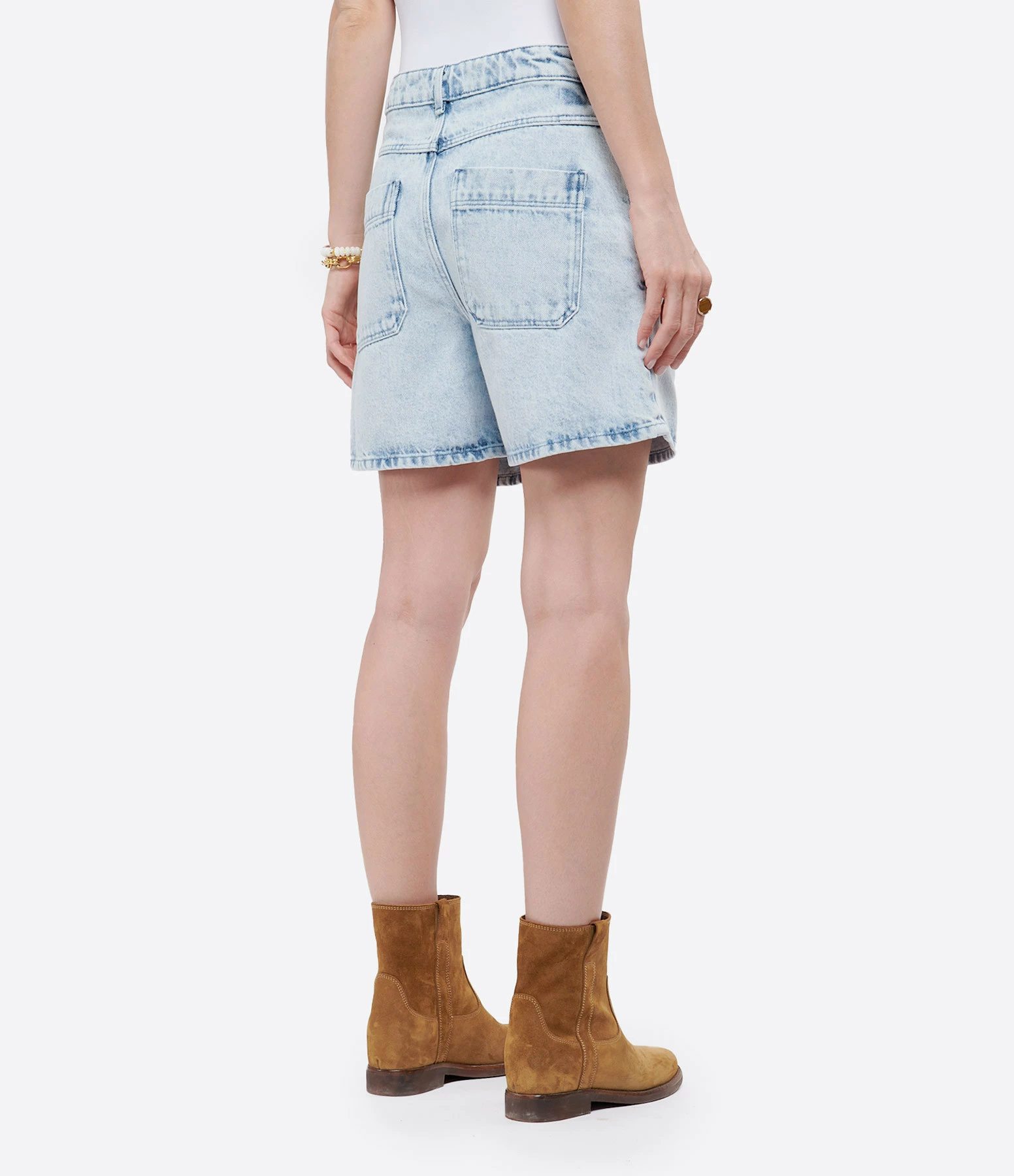 Short en denim bleu délavé. Taille haute avec passants pour ceinture. Fermeture par zip et bouton. Quatre poches.