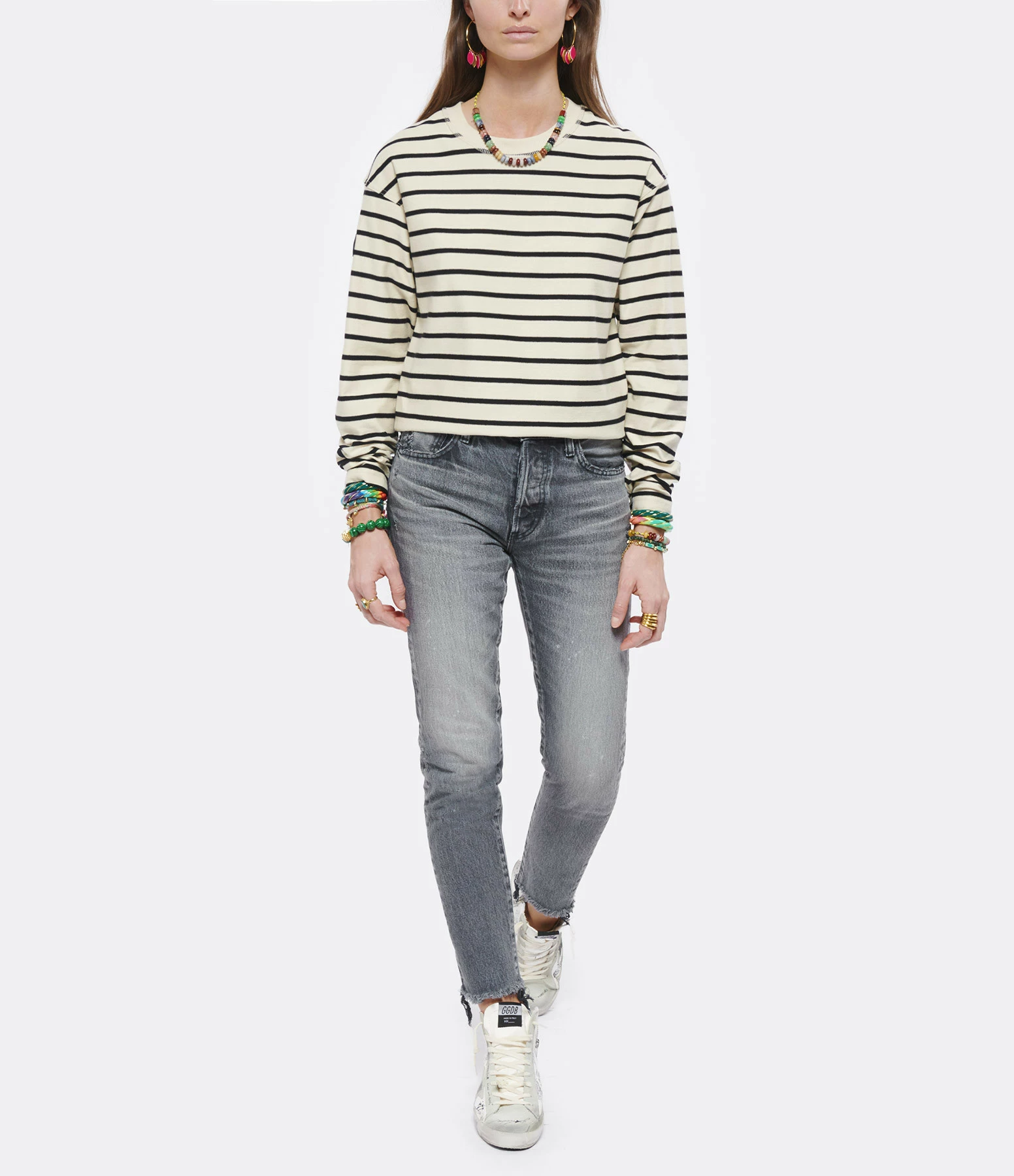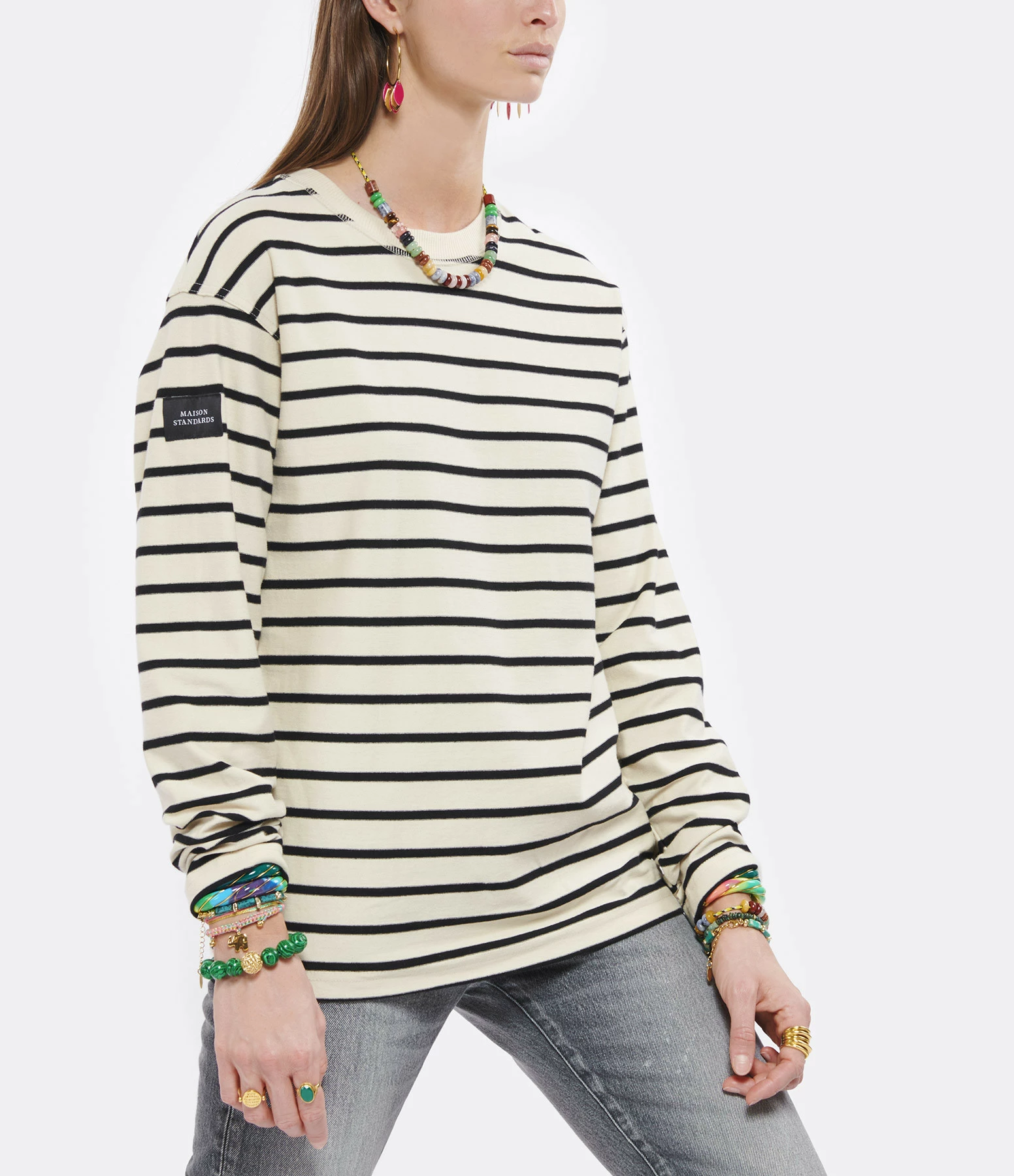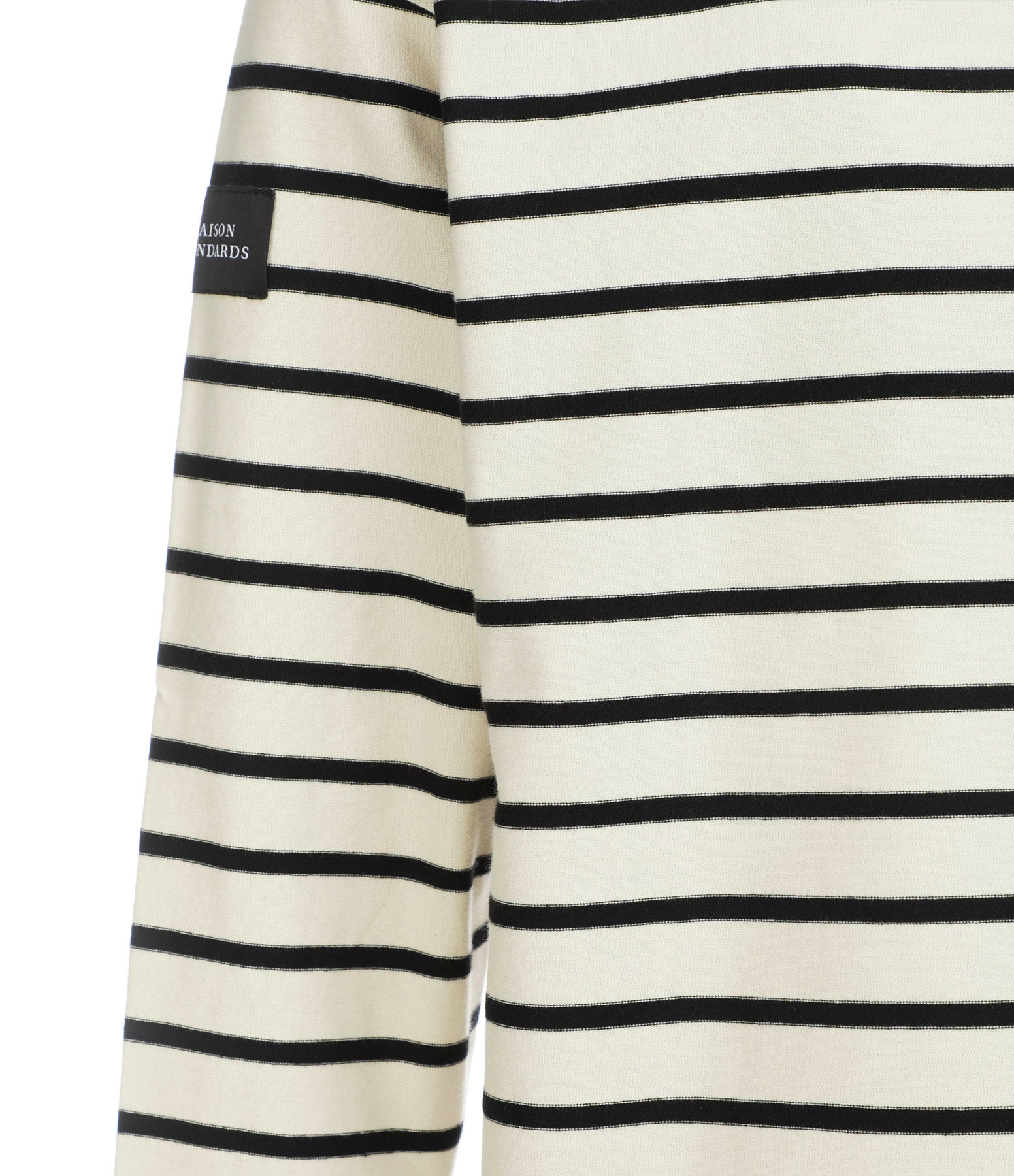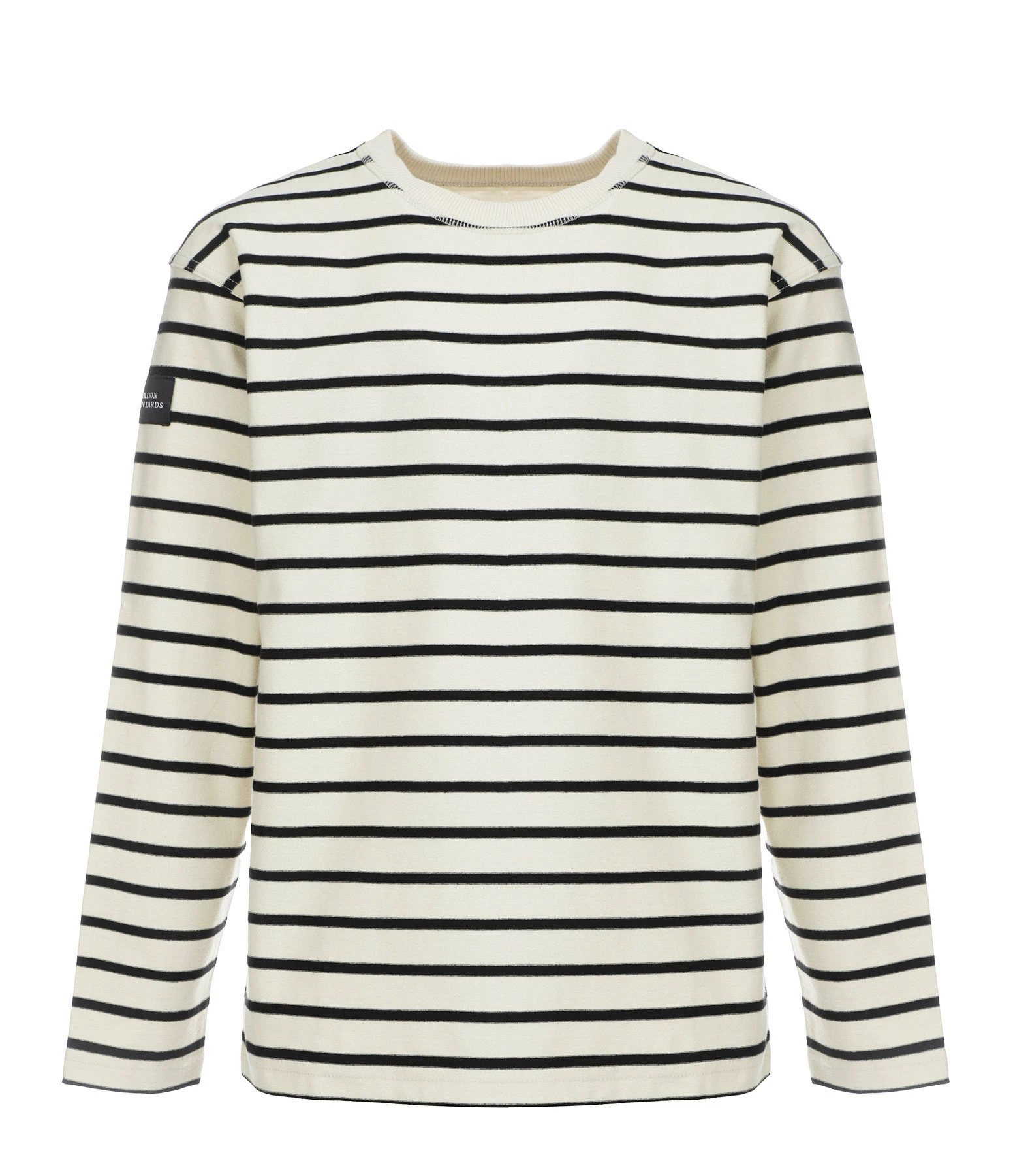 Tee-shirt en coton beige à rayures noires. Manches longues. Col rond côtelé. Coupe droite. Base droite.