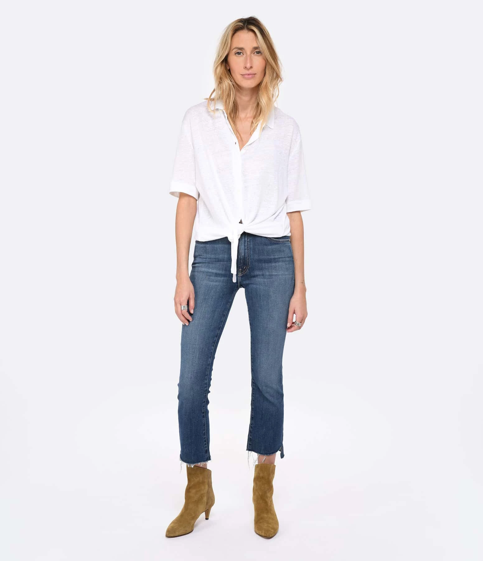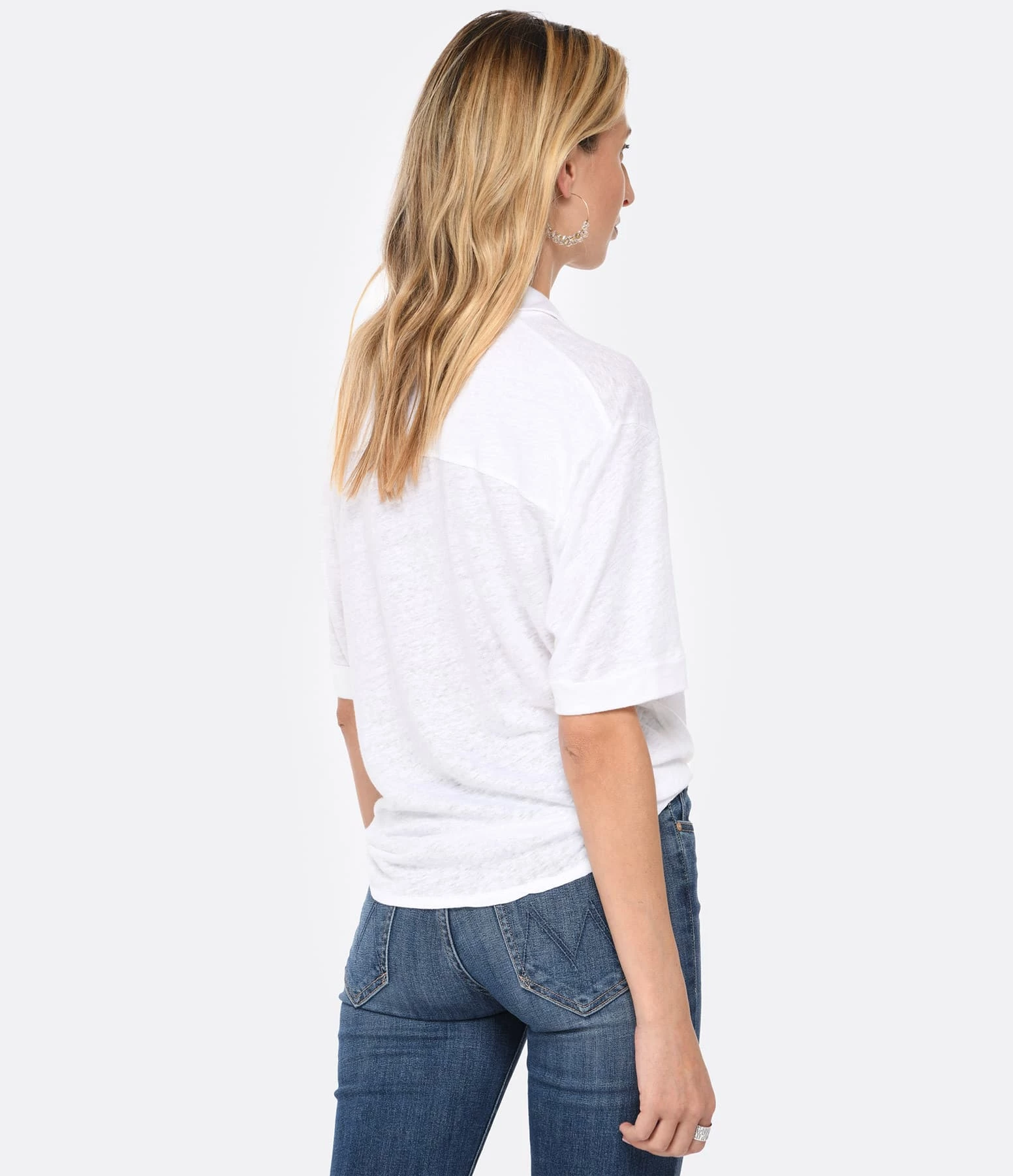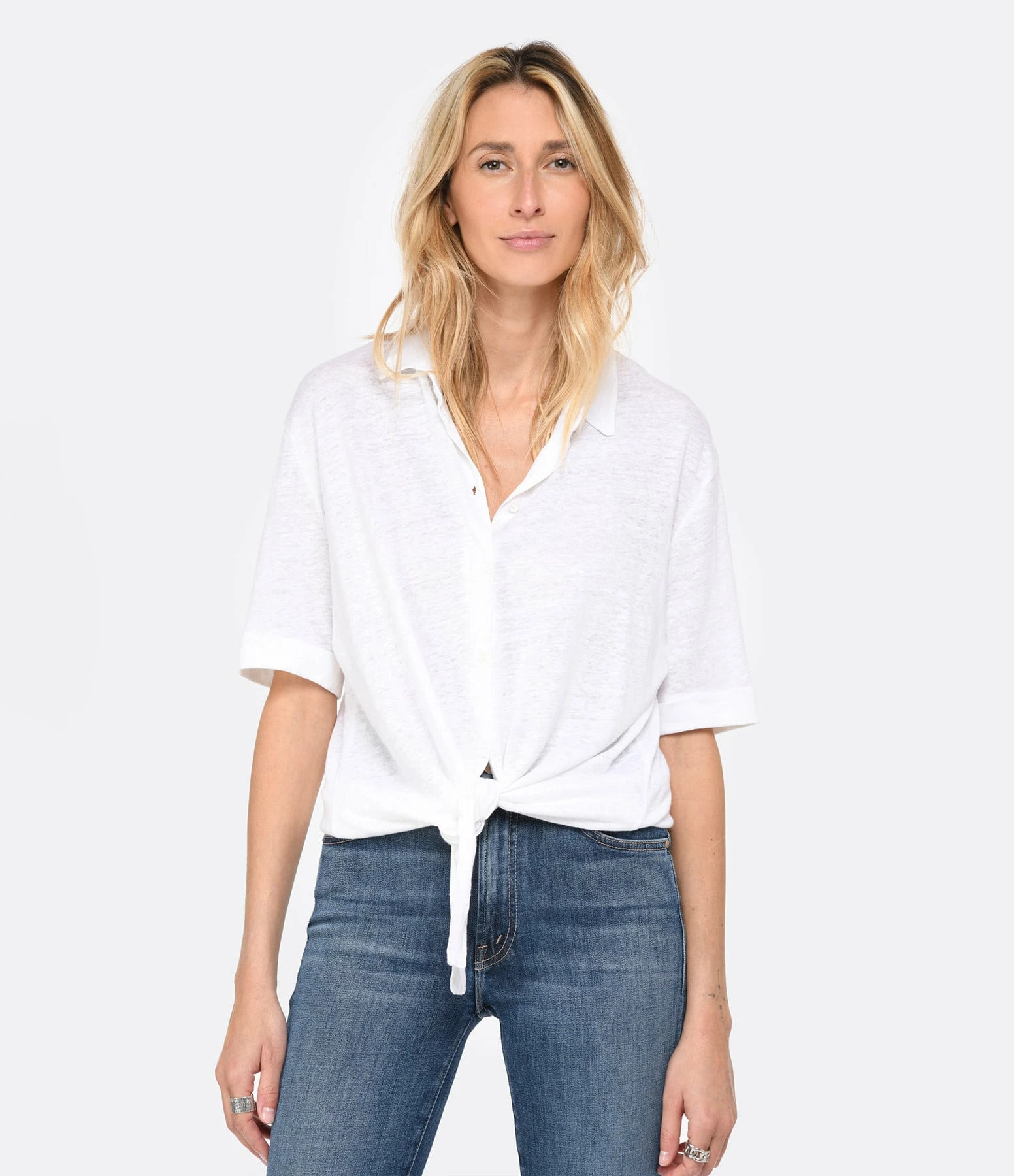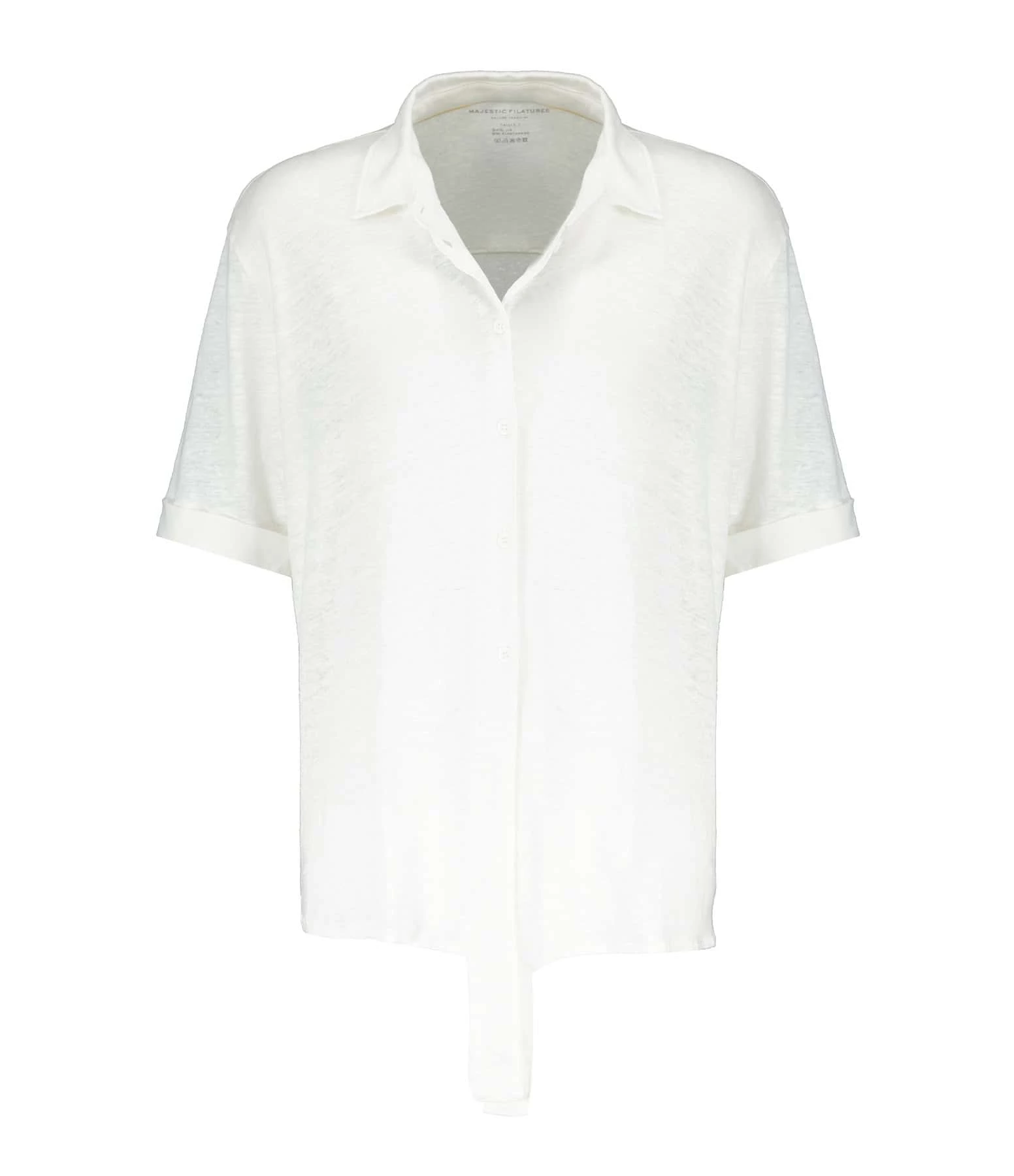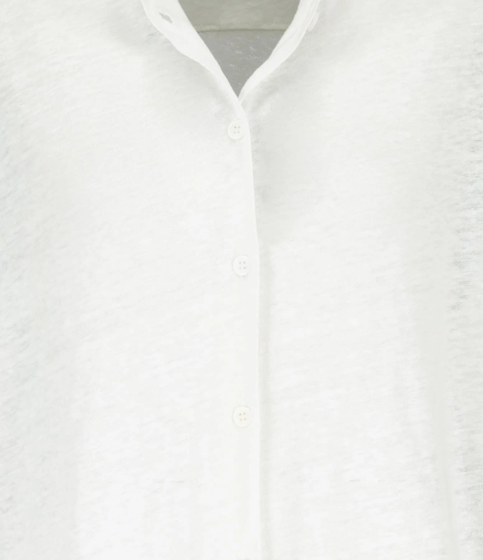Chemise en lin blanc. Col chemisier. Manches courtes. Fermeture par boutons. Coupe droite. Base droite avec liens à nouer. Non doublé.