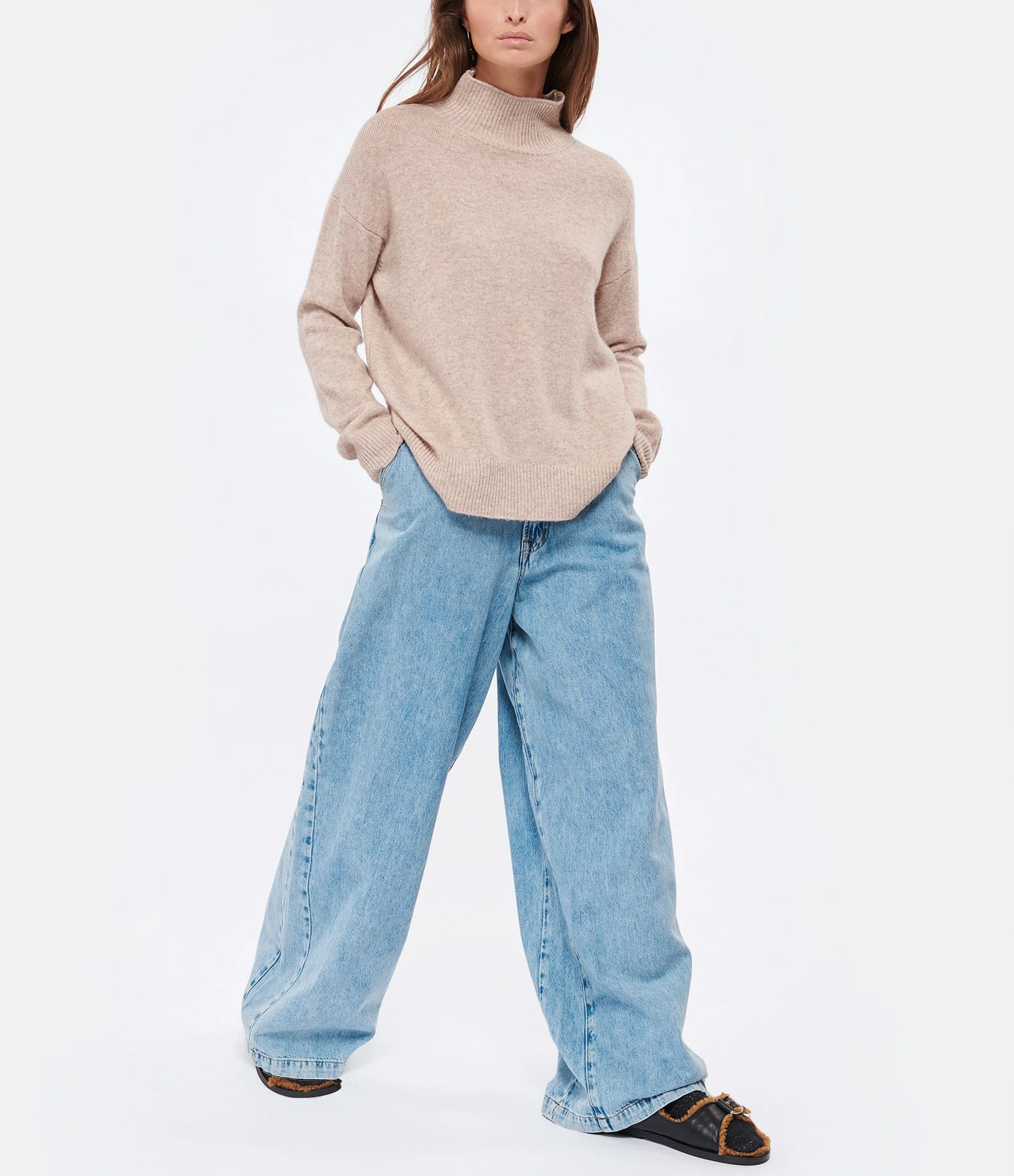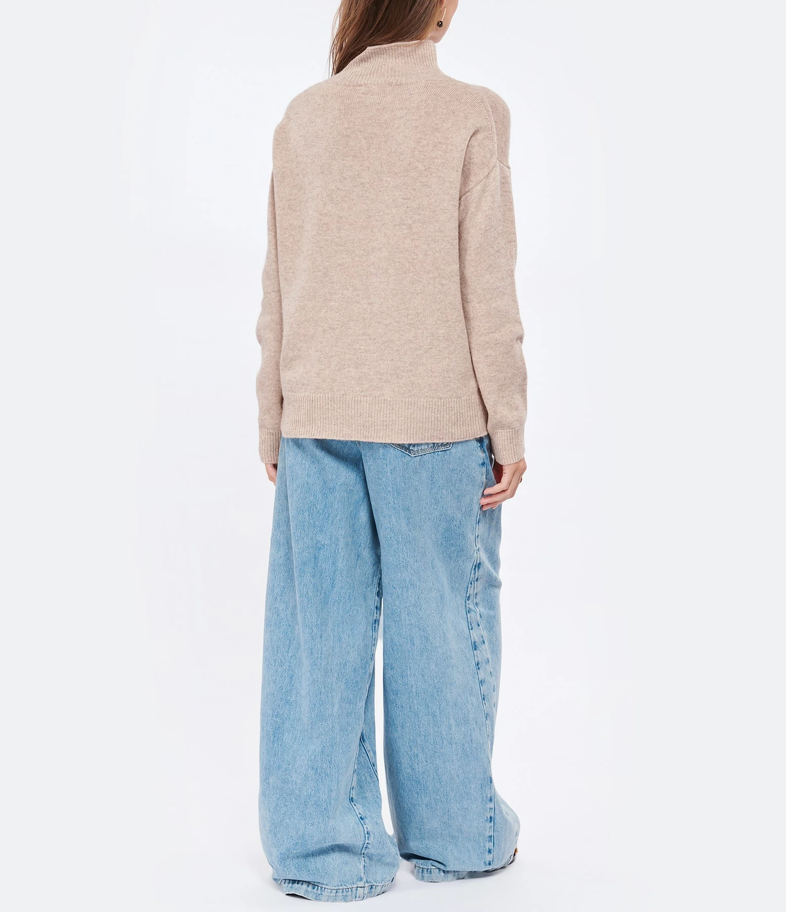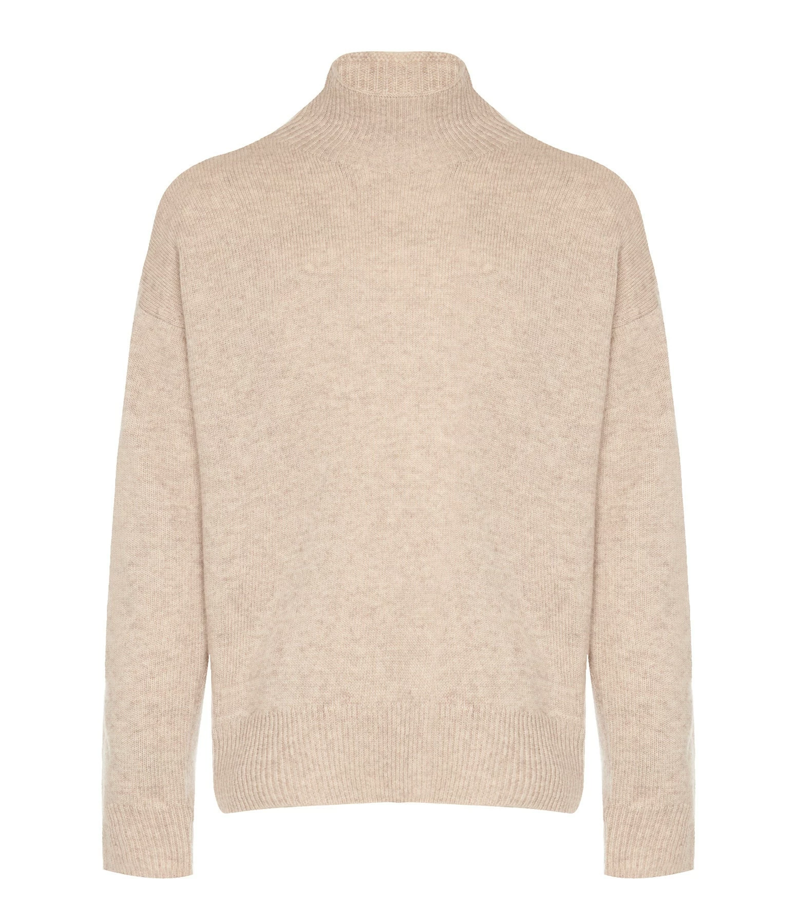 Pull en maille de laine et cachemire mélangés beige rosé. Col montant côtelé. Manches longues avec poignets côtelés. Coupe ample. Base droite côtelée.