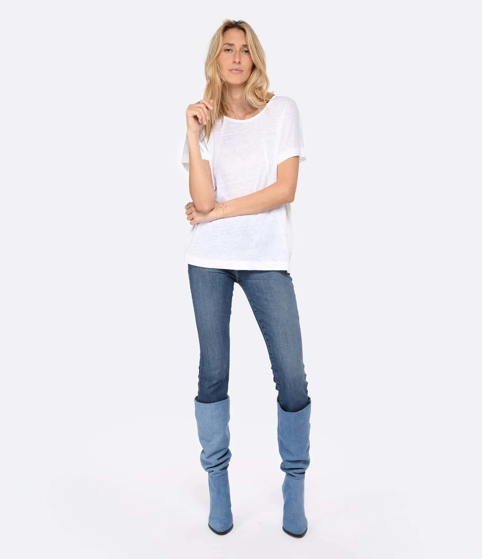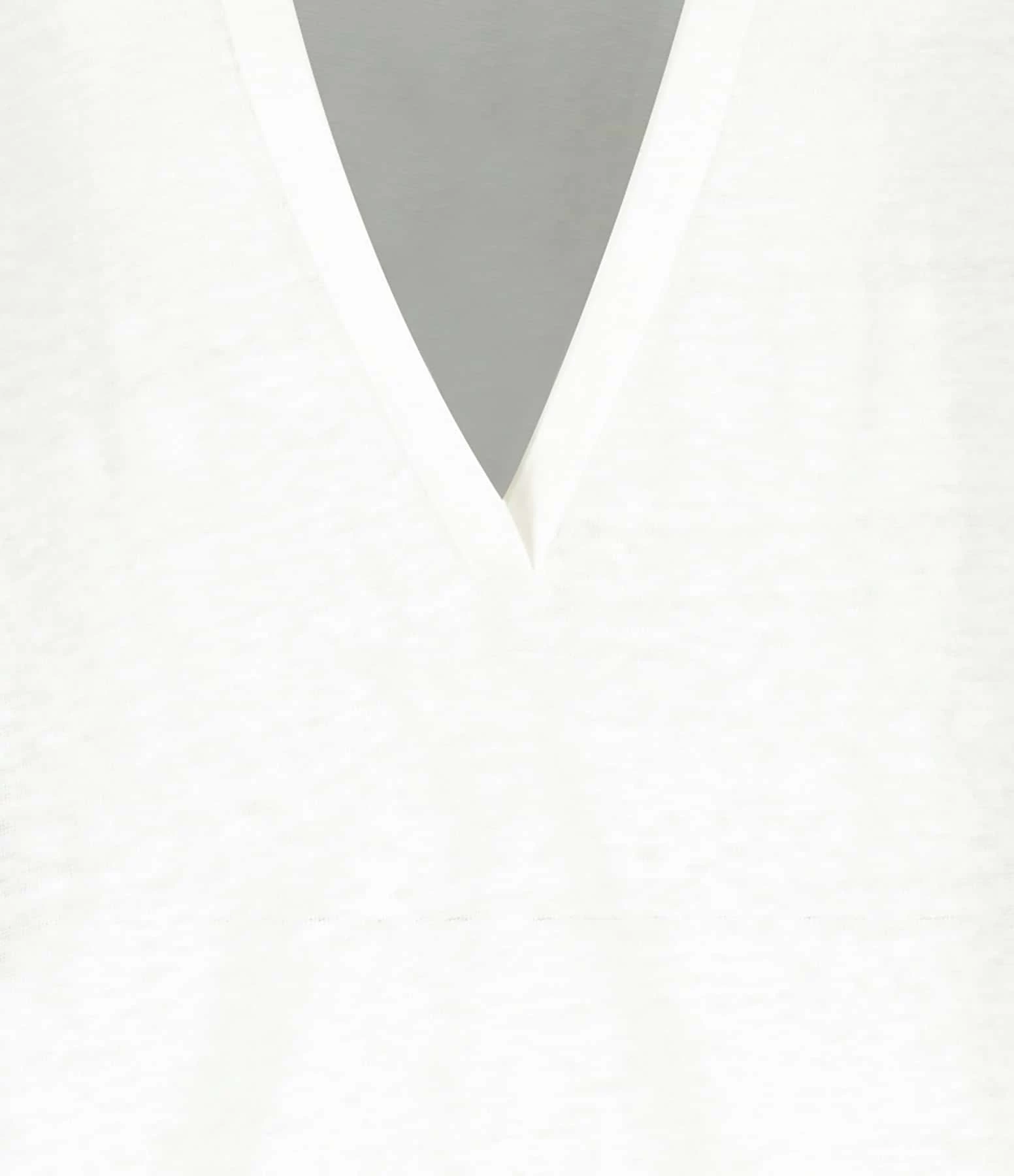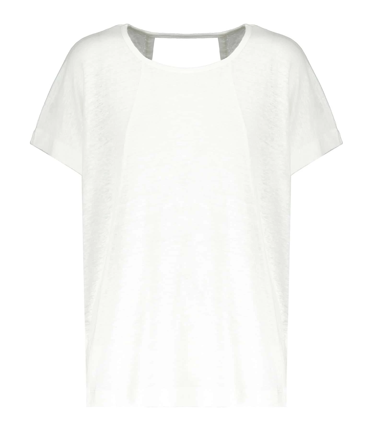 Tee-shirt en lin blanc. Col rond. Décolleté en V dans le dos. Manches courtes. Coupe droite. Base droite.