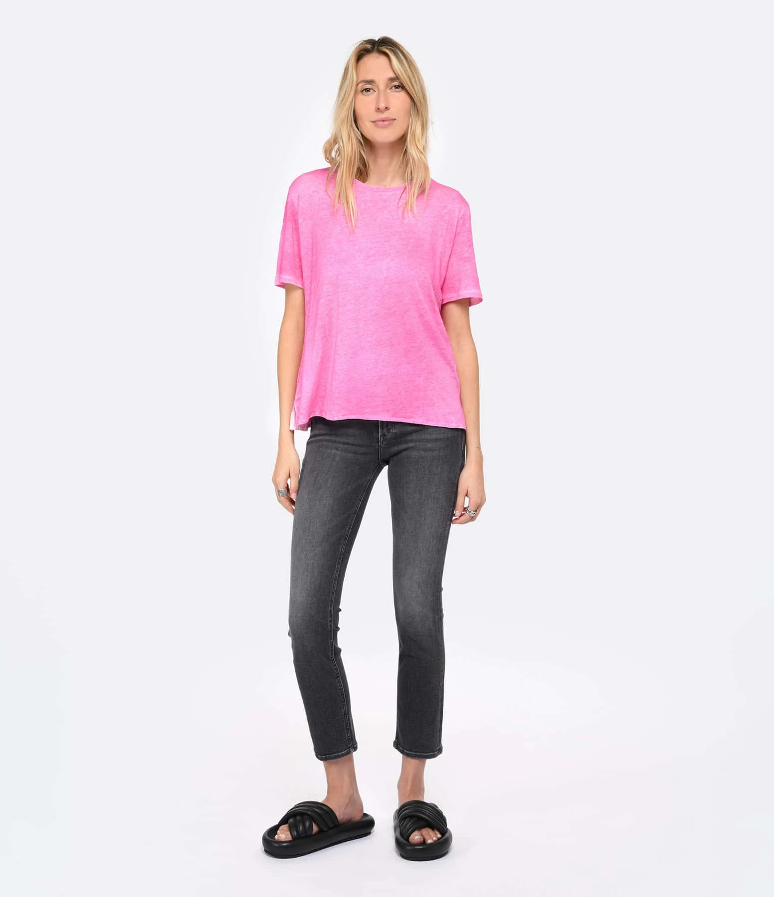 Tee-shirt manches courtes en lin rose. Col rond. Coupe droite. Base droite.