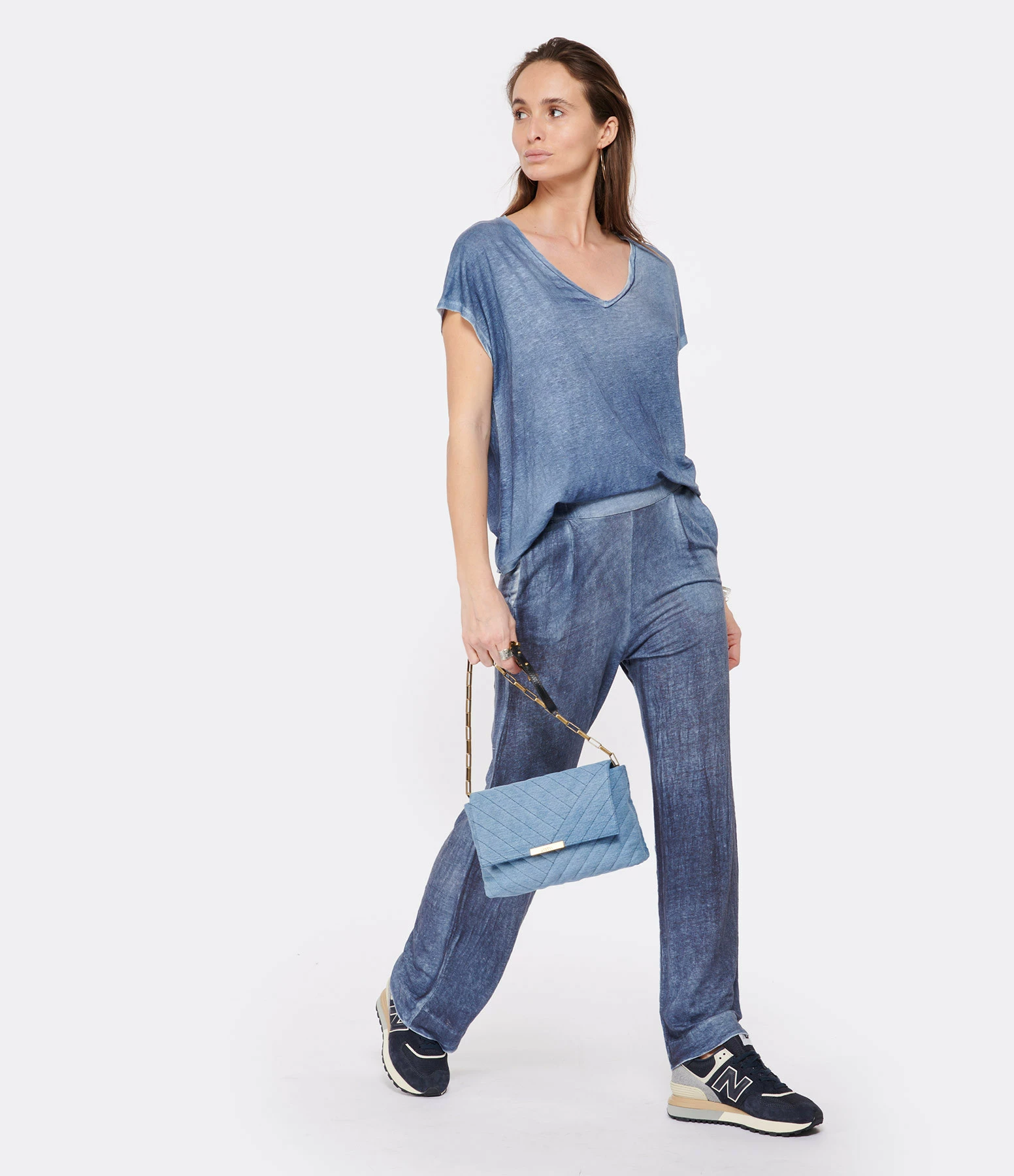 Tee-shirt manches courtes en lin bleu. Coupe large. Col en V. Base droite légèrement plus longue à l’arrière.