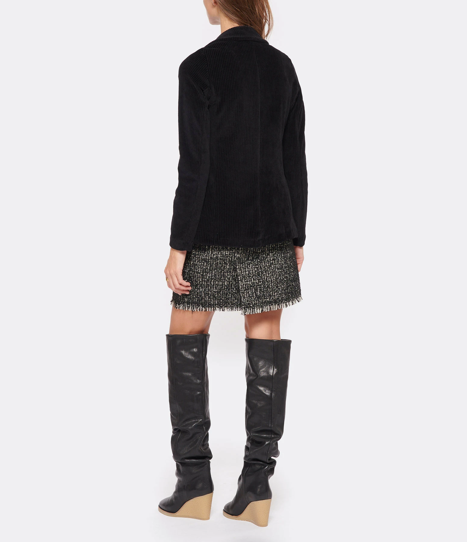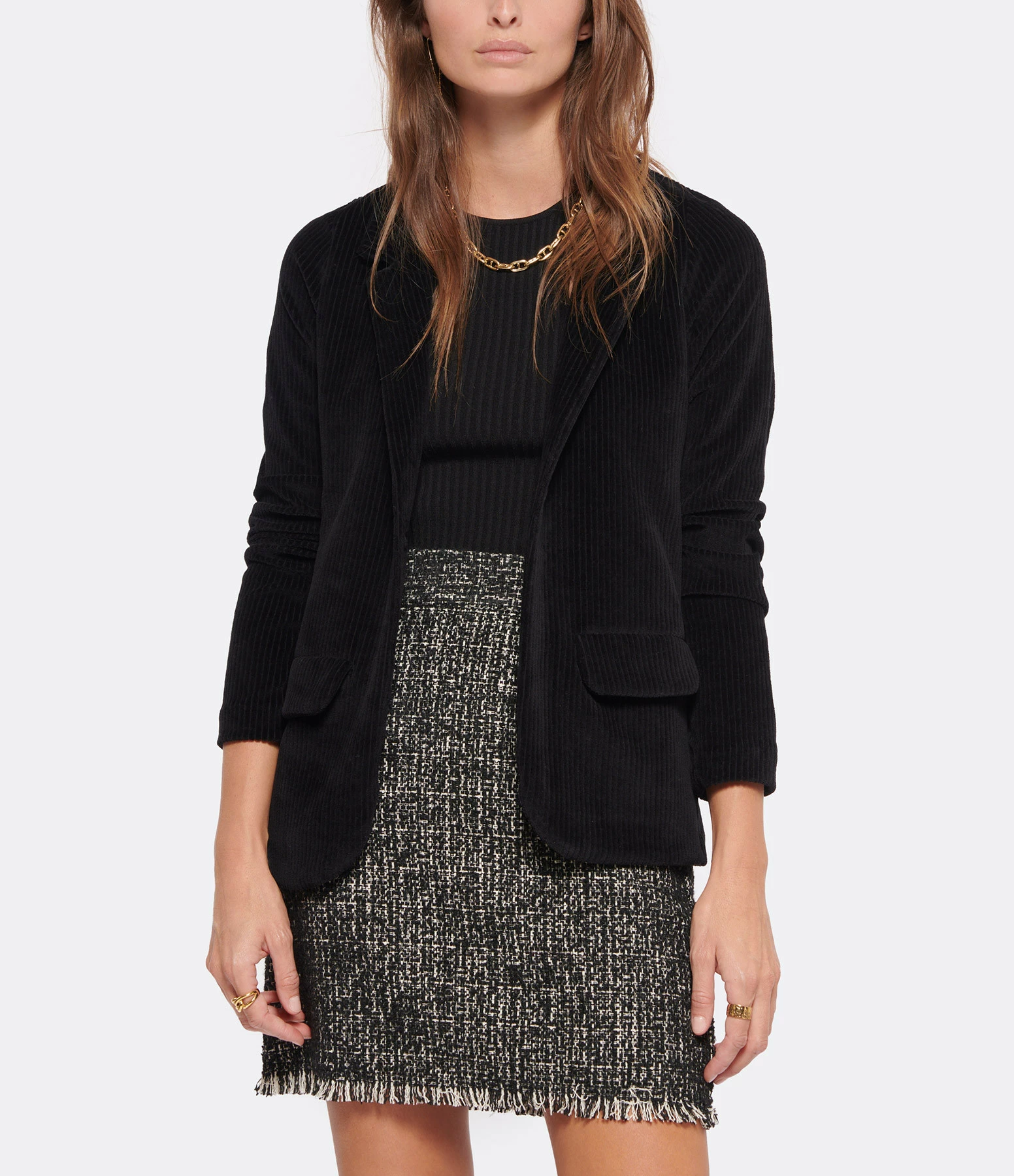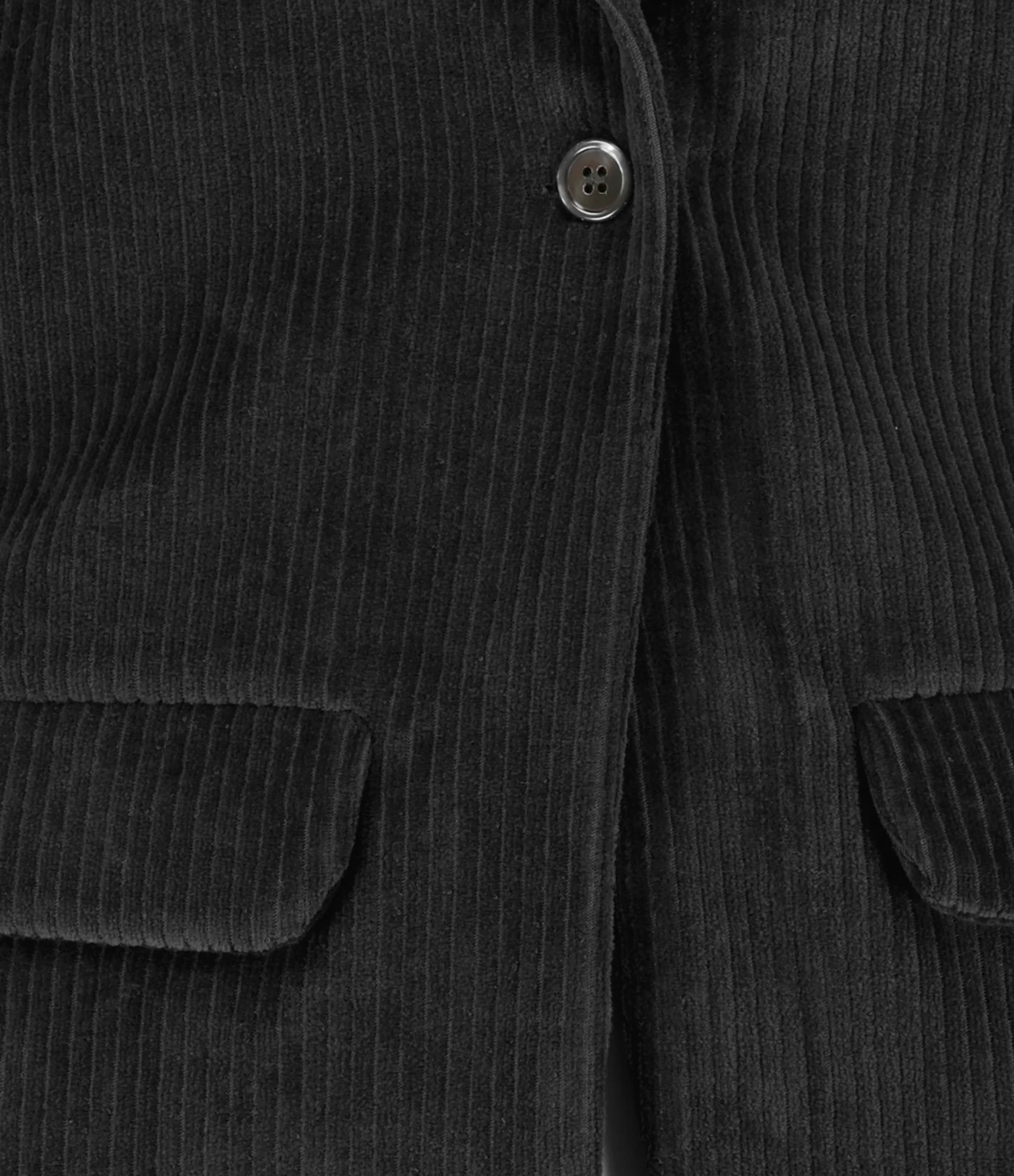 Veste blazer en velours côtelé de coton noir. Col tailleur cranté. Manches longues tailleur. Fermeture boutonnée simple sur le bouton. Bouton effet corne. Deux poches à rabat sur le devant. Coupe droite. Base arrondie.