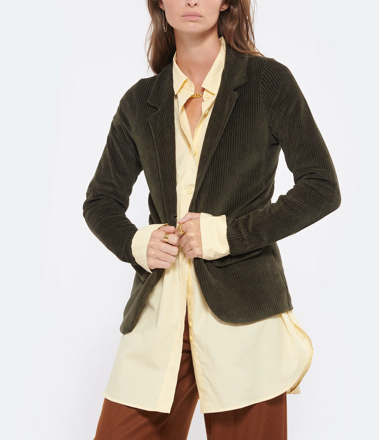 Veste blazer en velours côtelé de coton vert. Col tailleur cranté. Manches longues tailleur. Fermeture boutonnée simple sur le bouton. Bouton effet corne. Deux poches à rabat sur le devant. Coupe droite. Base arrondie.
