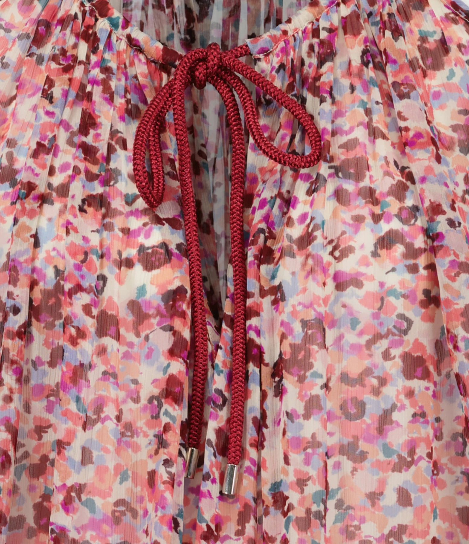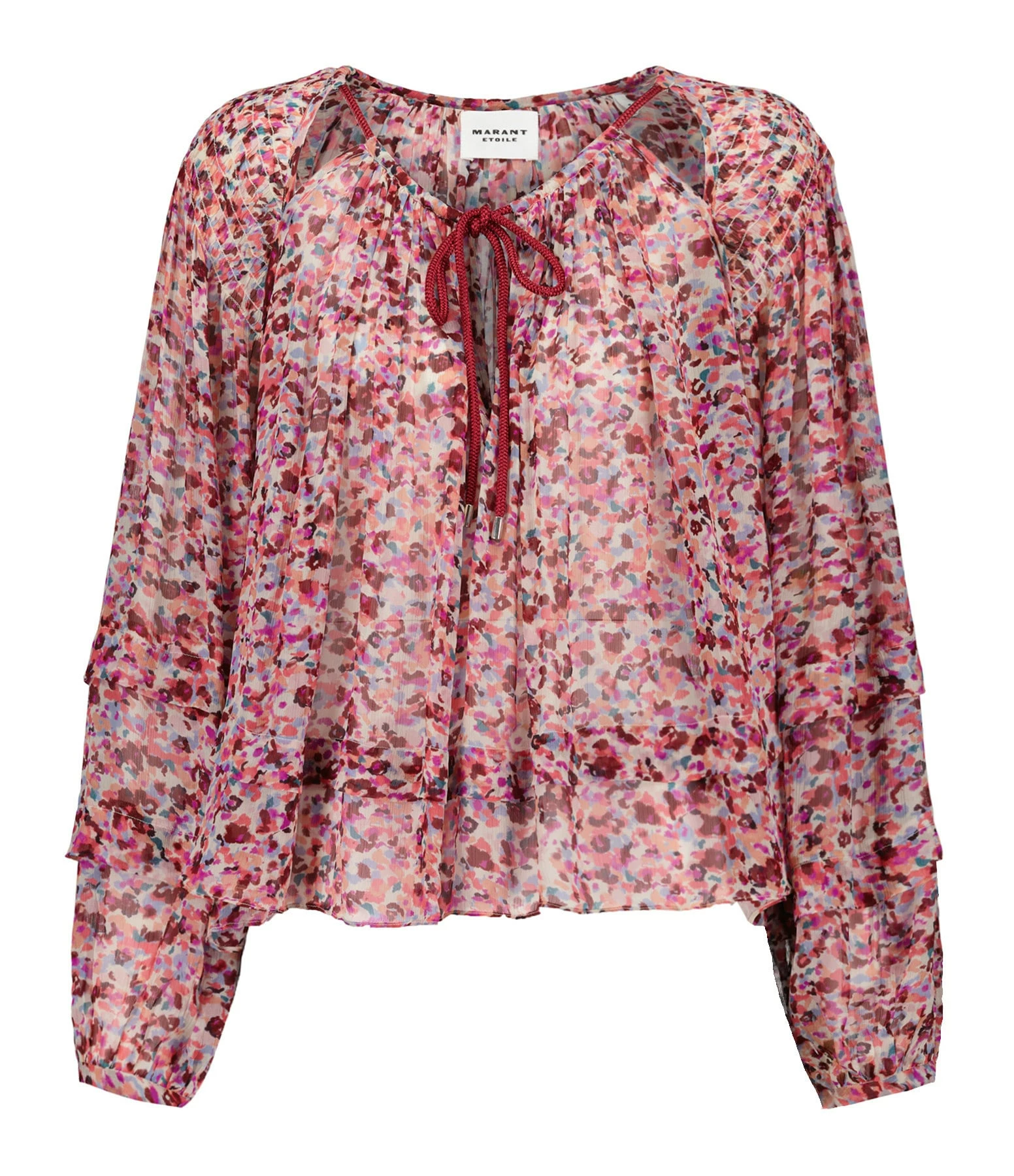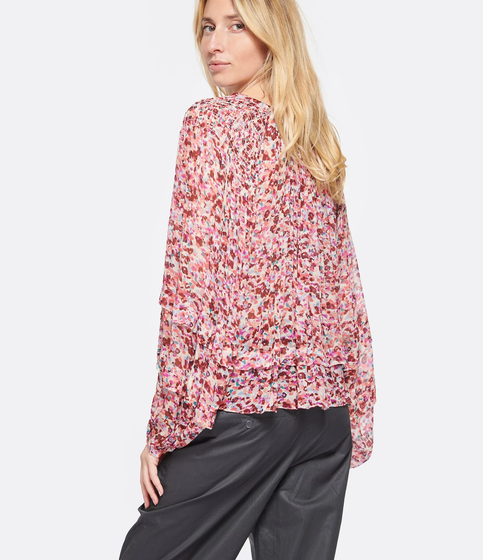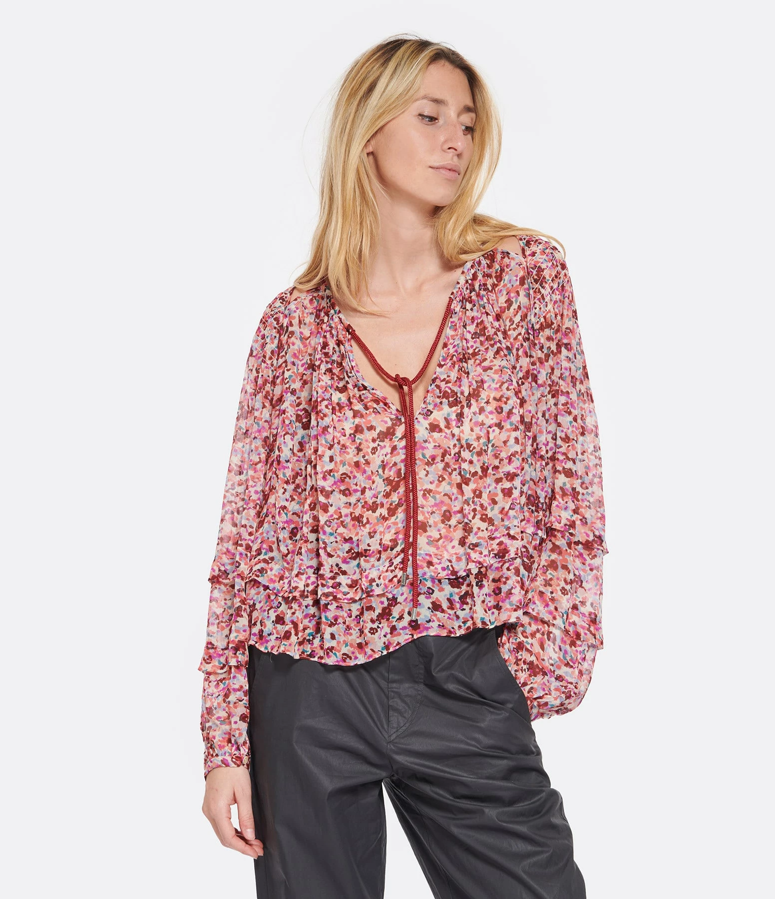 Blouse froncée et volantée à imprimé vert. Col rond à encoche avec liens de serrage framboise. Manches longues bouffantes. Coupe ample. Base arrondie volantée.