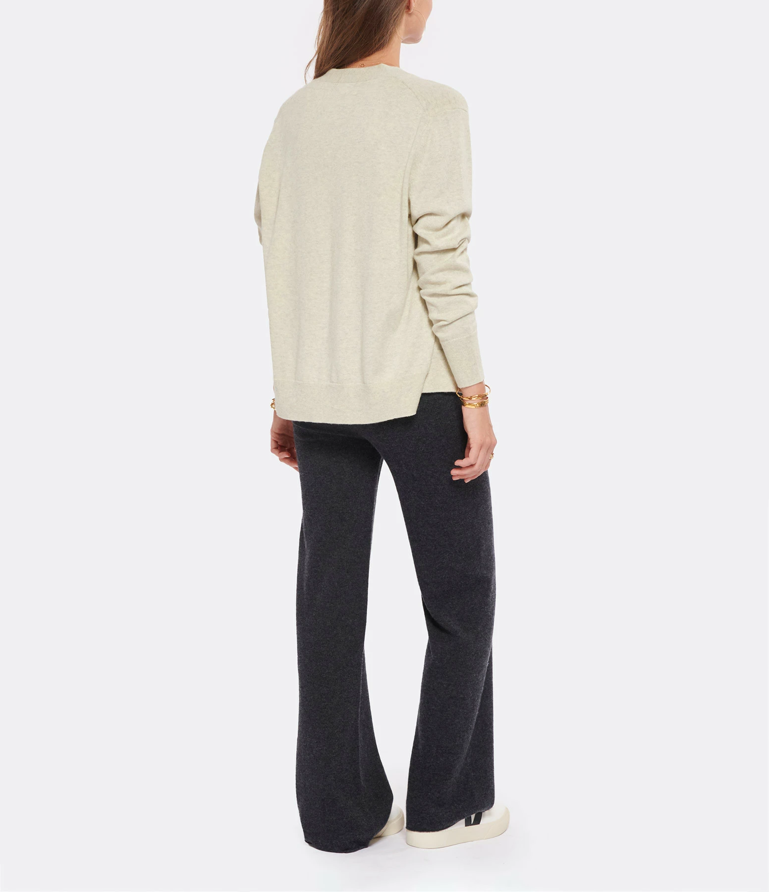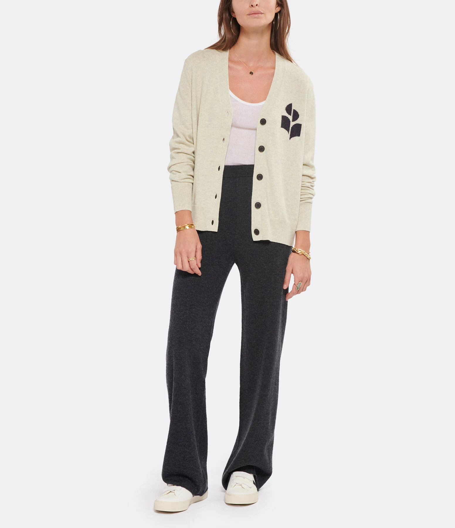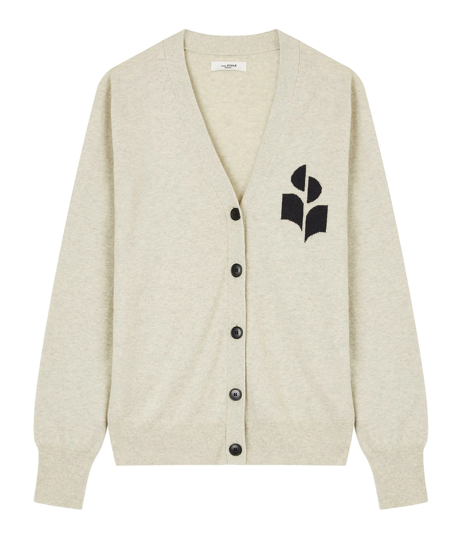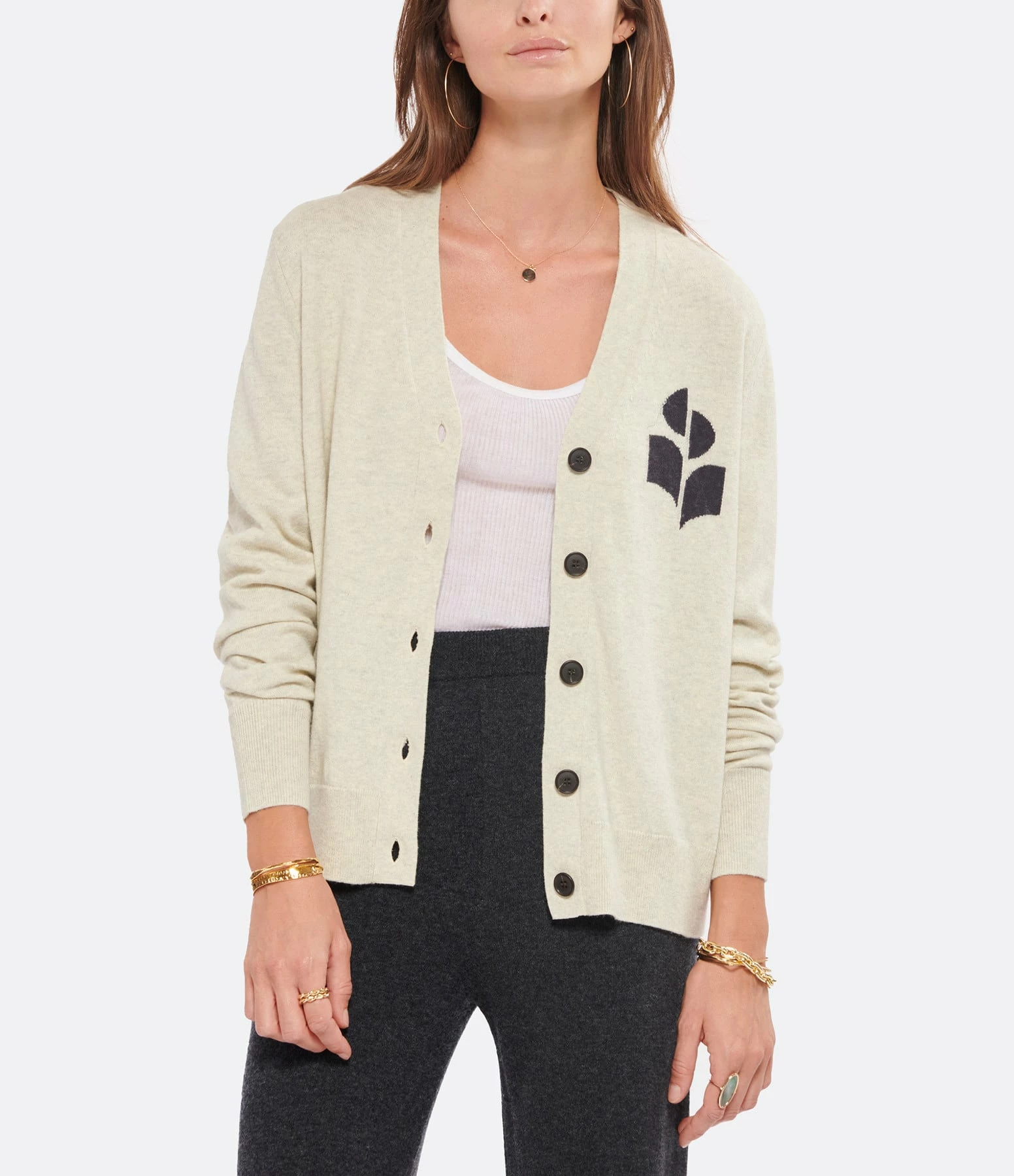 Cardigan en laine et coton gris clair avec logo noir sur la poitrine. Manches longues. Col V. Fermeture boutonnée. Coupe droite. Base droite.