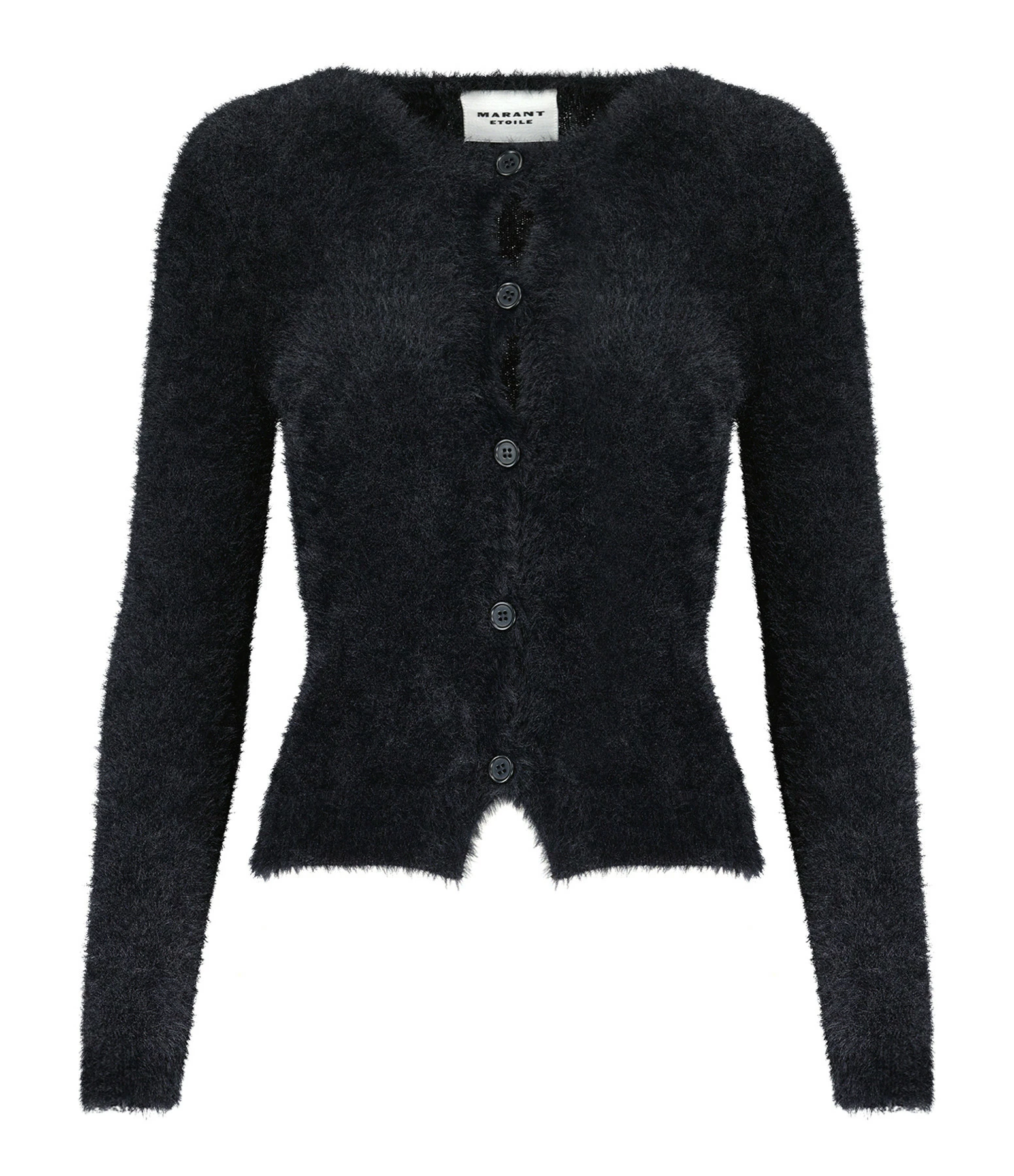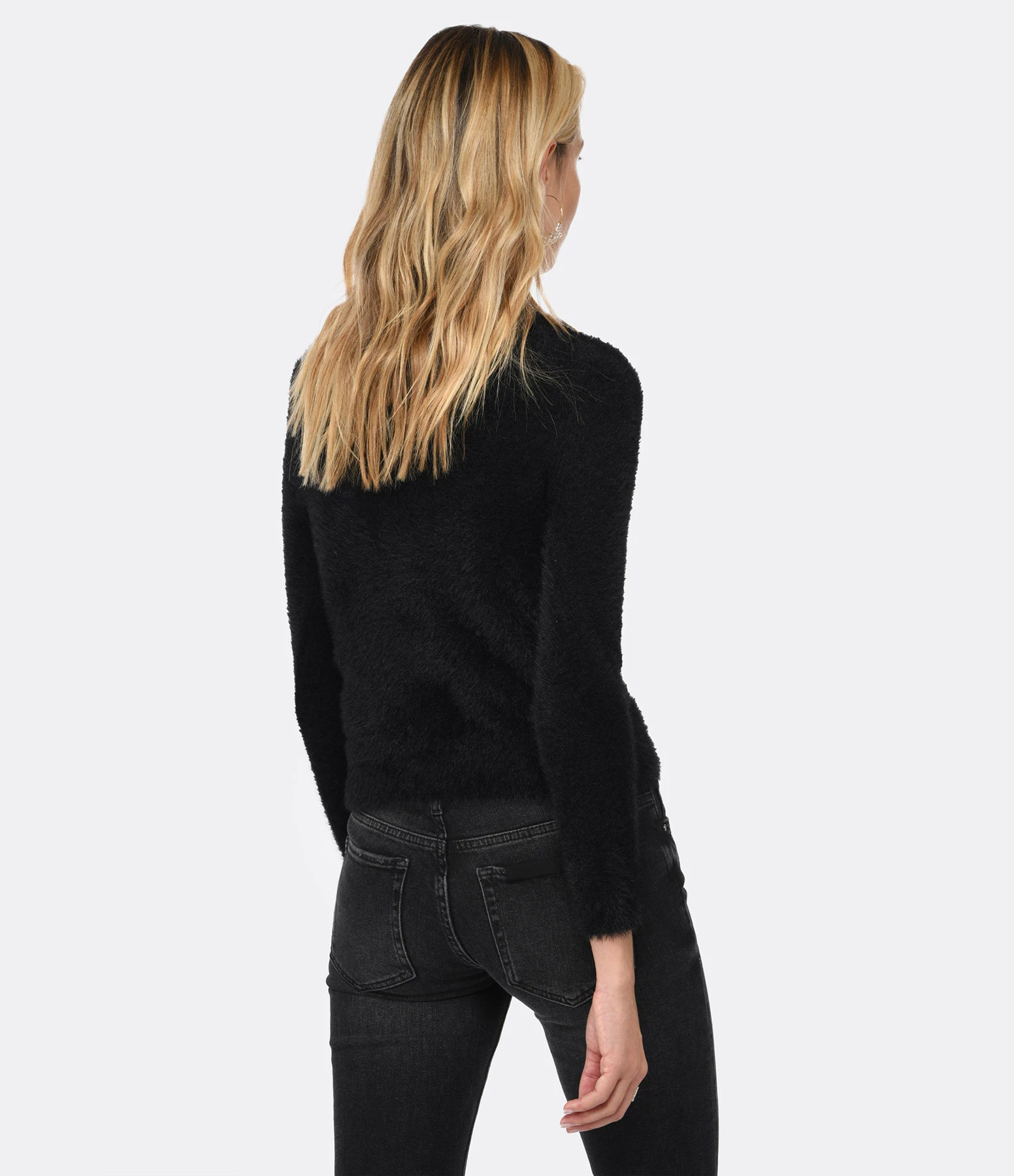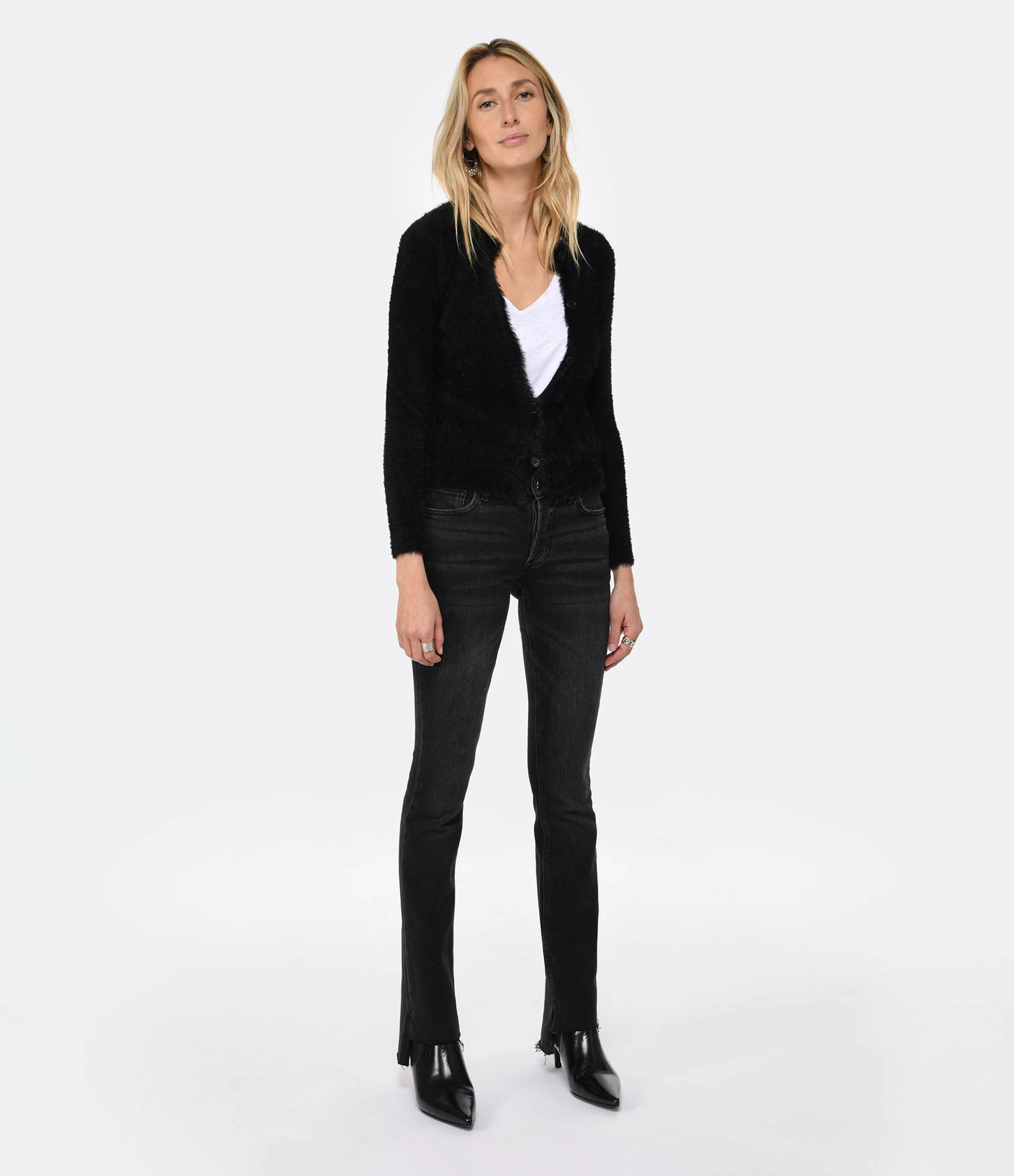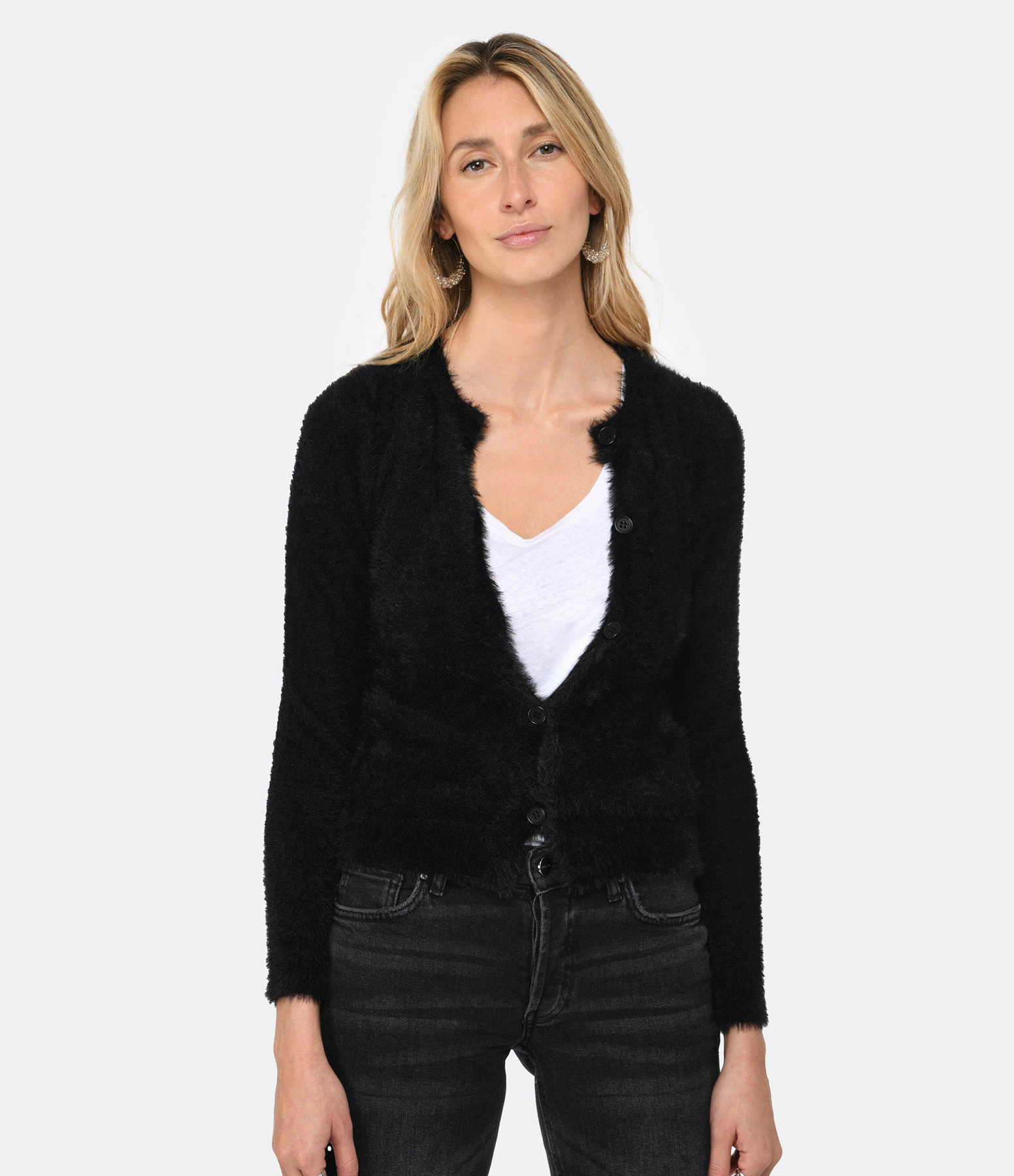 Cardigan en fourrure synthétique noire. Col rond . Manches longues. Fermeture boutonnée sur le devant. Coupe droite. Base droite.