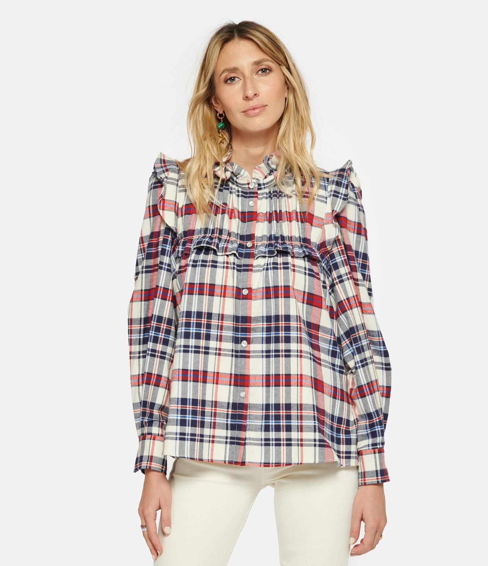 Chemise en coton à imprimé carreaux bleu et rouge ornée de fronces et de volants. Col montant volanté. Emmanchure marquée. Manches longues avec fentes et poignets pressionnés. Dos froncé. Fermeture pressionnée sur le devant. Petits boutons pression nacrés. Fentes latérales. Coupe droite. Base droite.