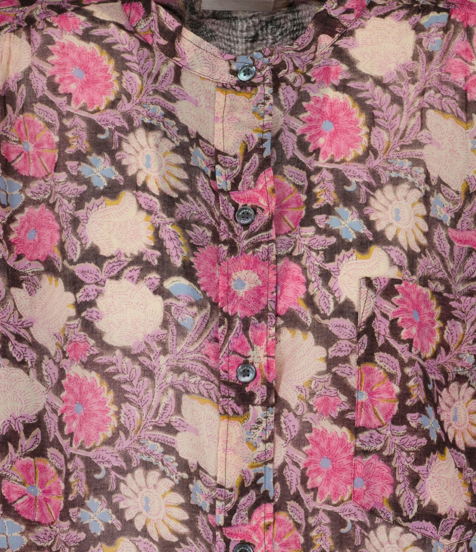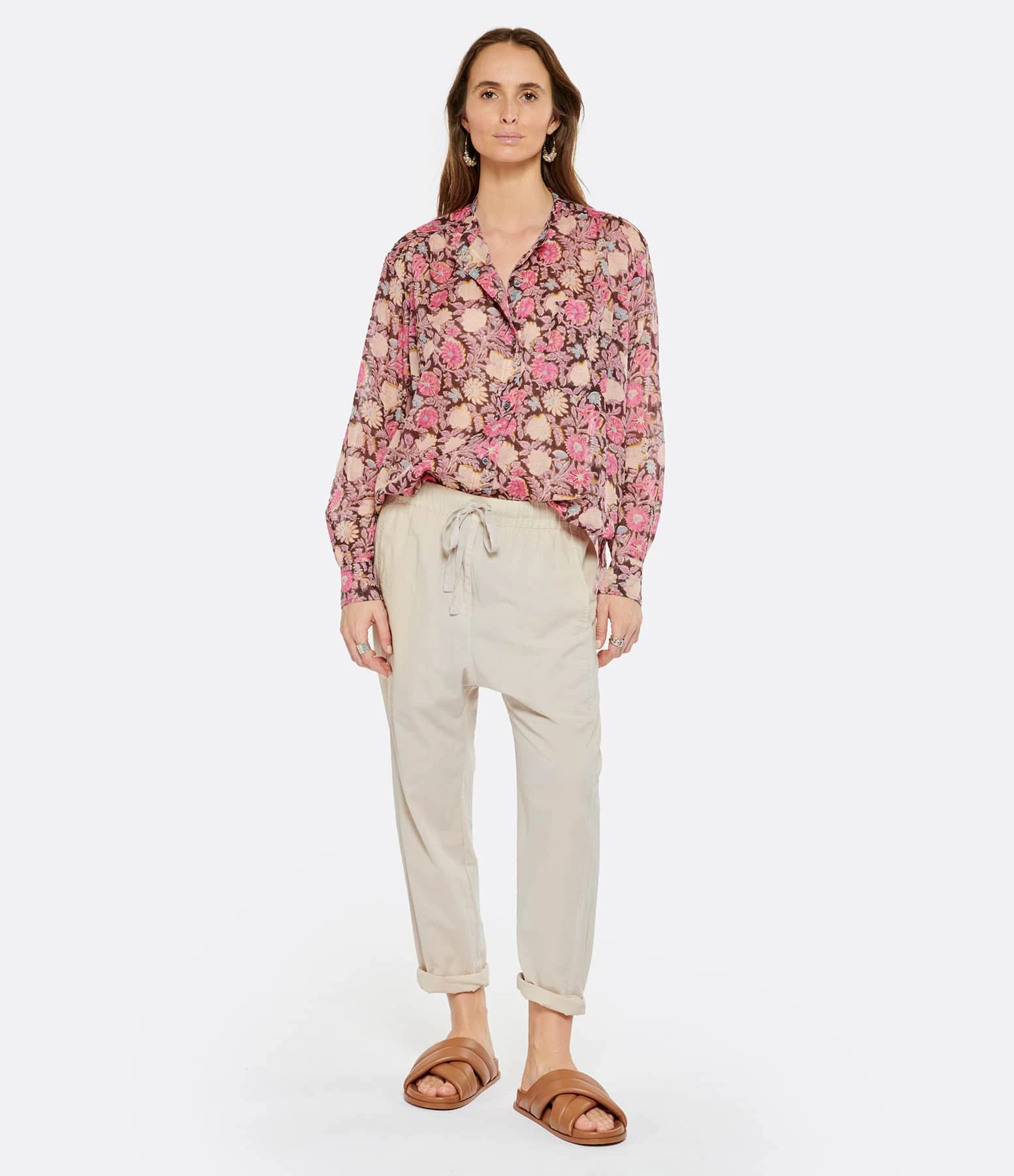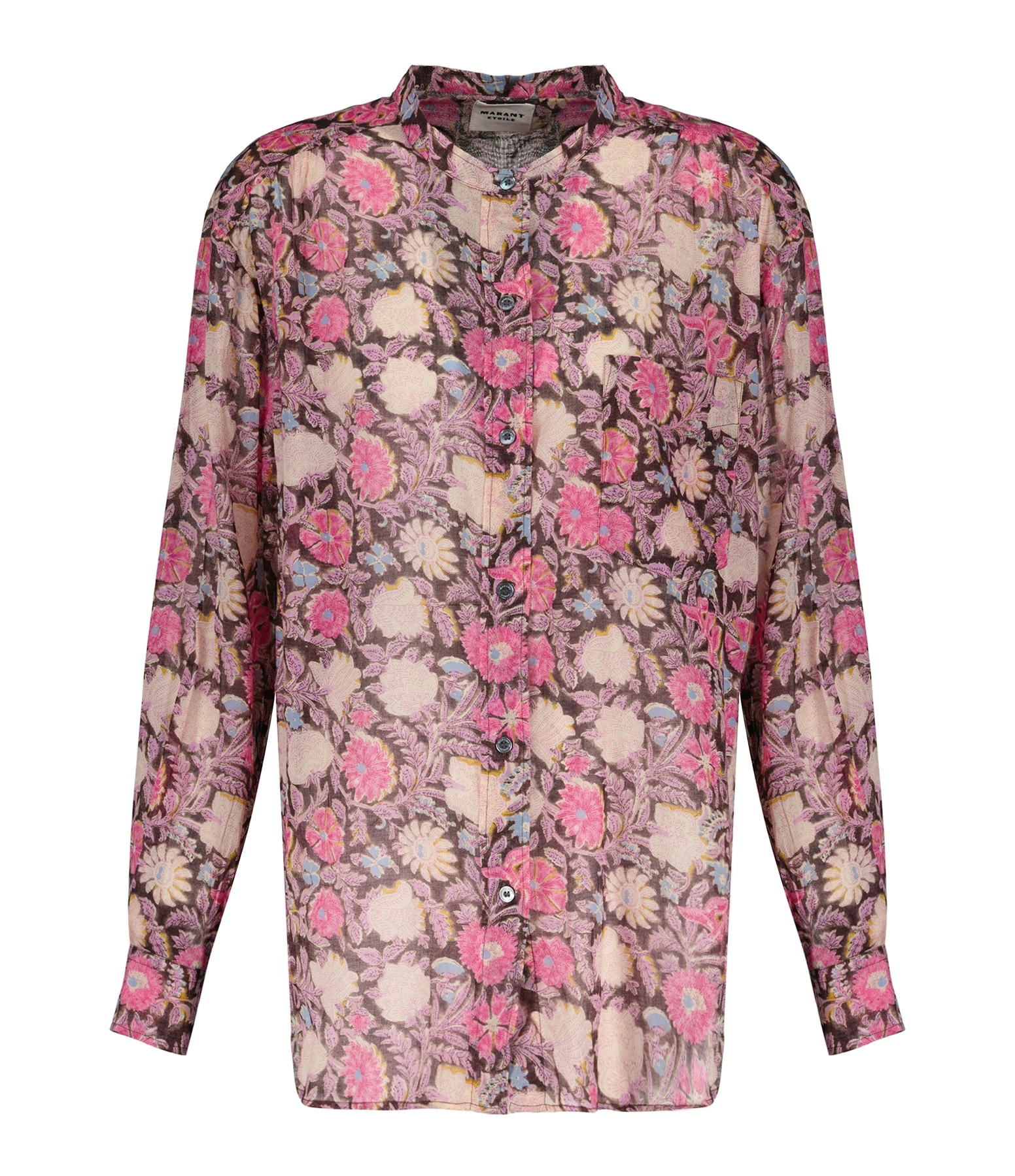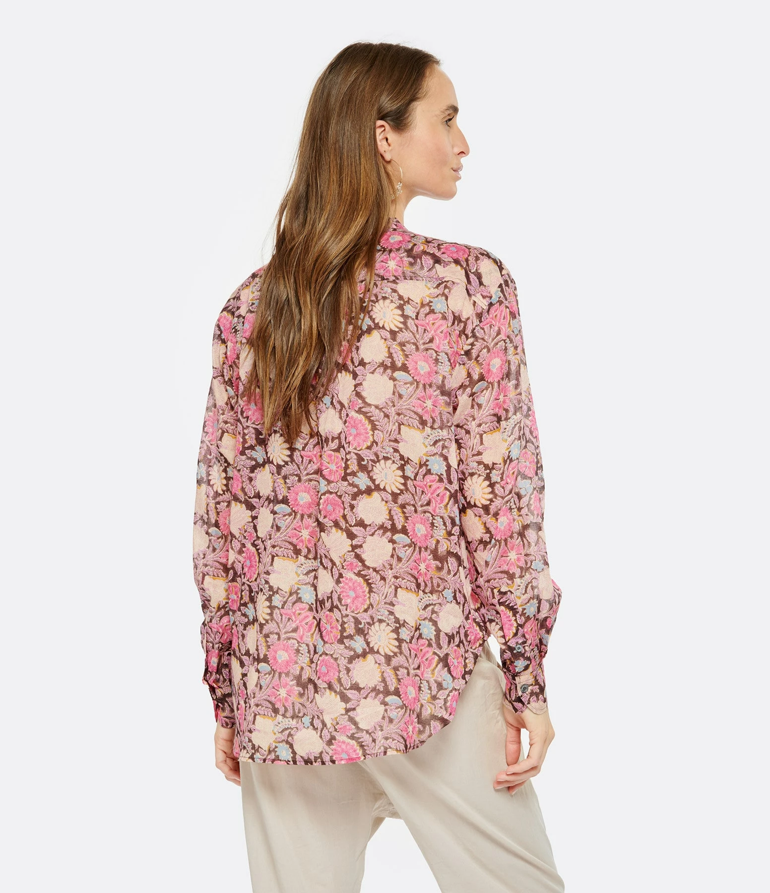 Chemise en coton à imprimé floral rose. Col officier. Manches longues avec fentes et poignets boutonnés. Fermeture boutonnée sur le devant. Une poche plaquée poitrine. Coupe droite. Base arrondie.