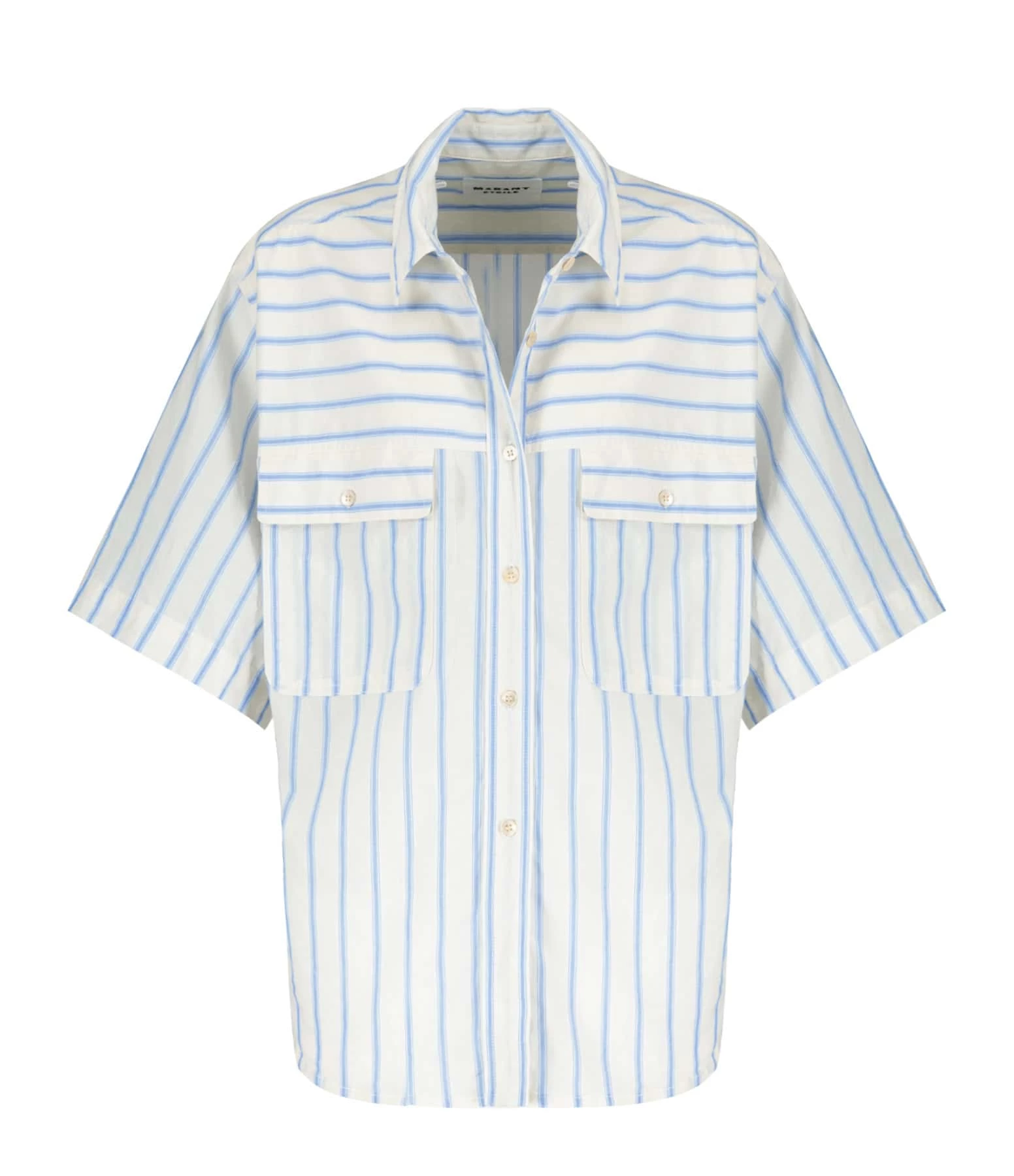 Chemise en coton écru à rayures bleues. Col chemise. Manches courtes. Fermeture boutonnée sur le devant. Deux poches à rabat boutonné sur le devant. Fentes latérales. Coupe droite. Base arrondie.