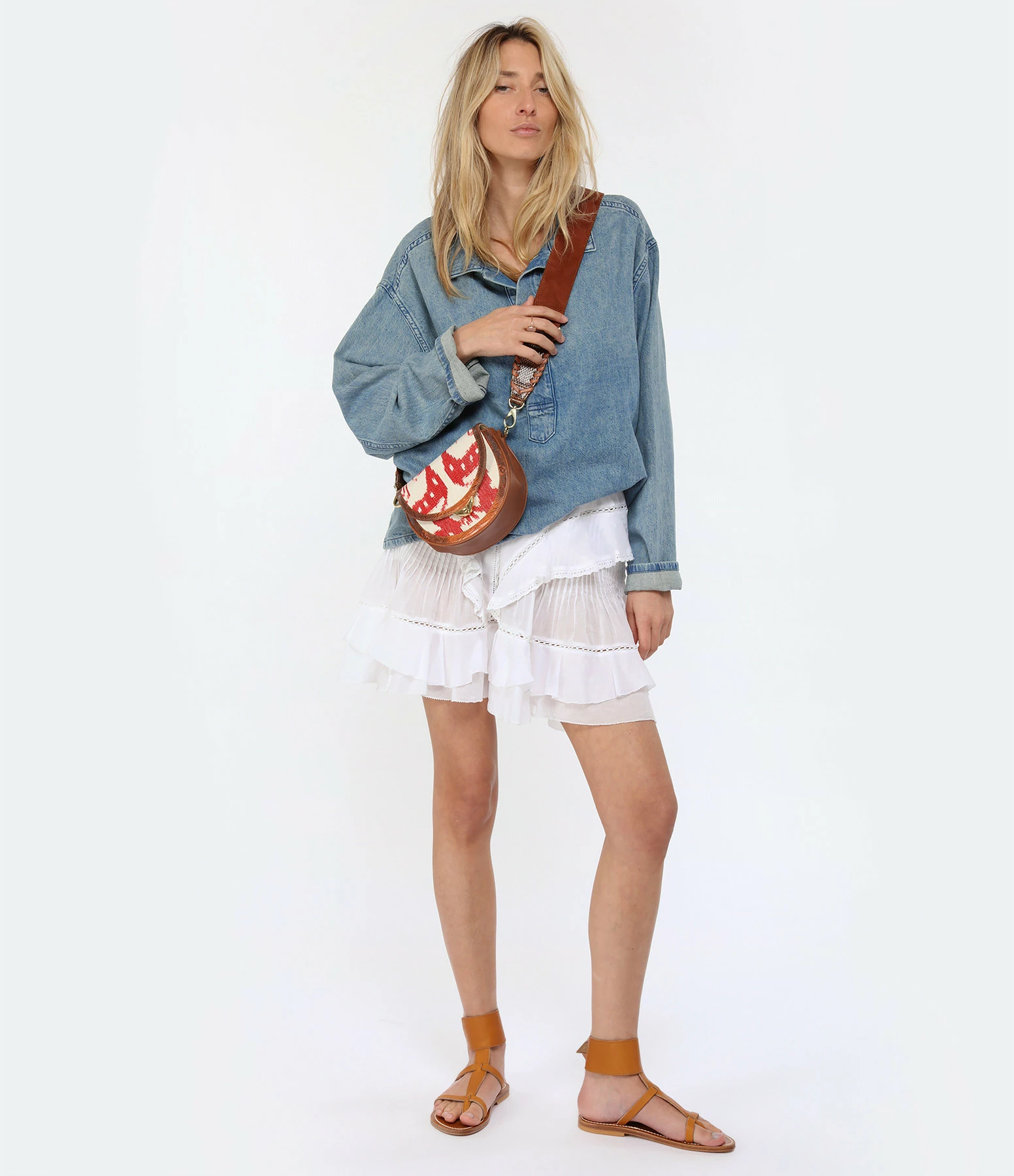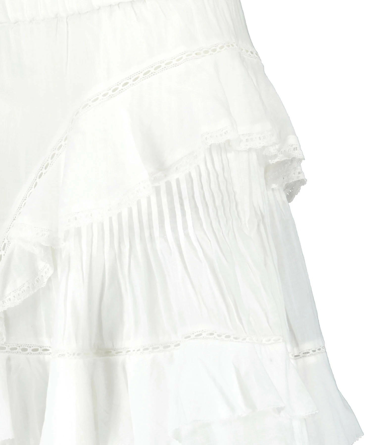 Jupe courte en coton blanc ornée de fronces et de volants. Taille élastiquée. Coupe évasée. Base à volants.