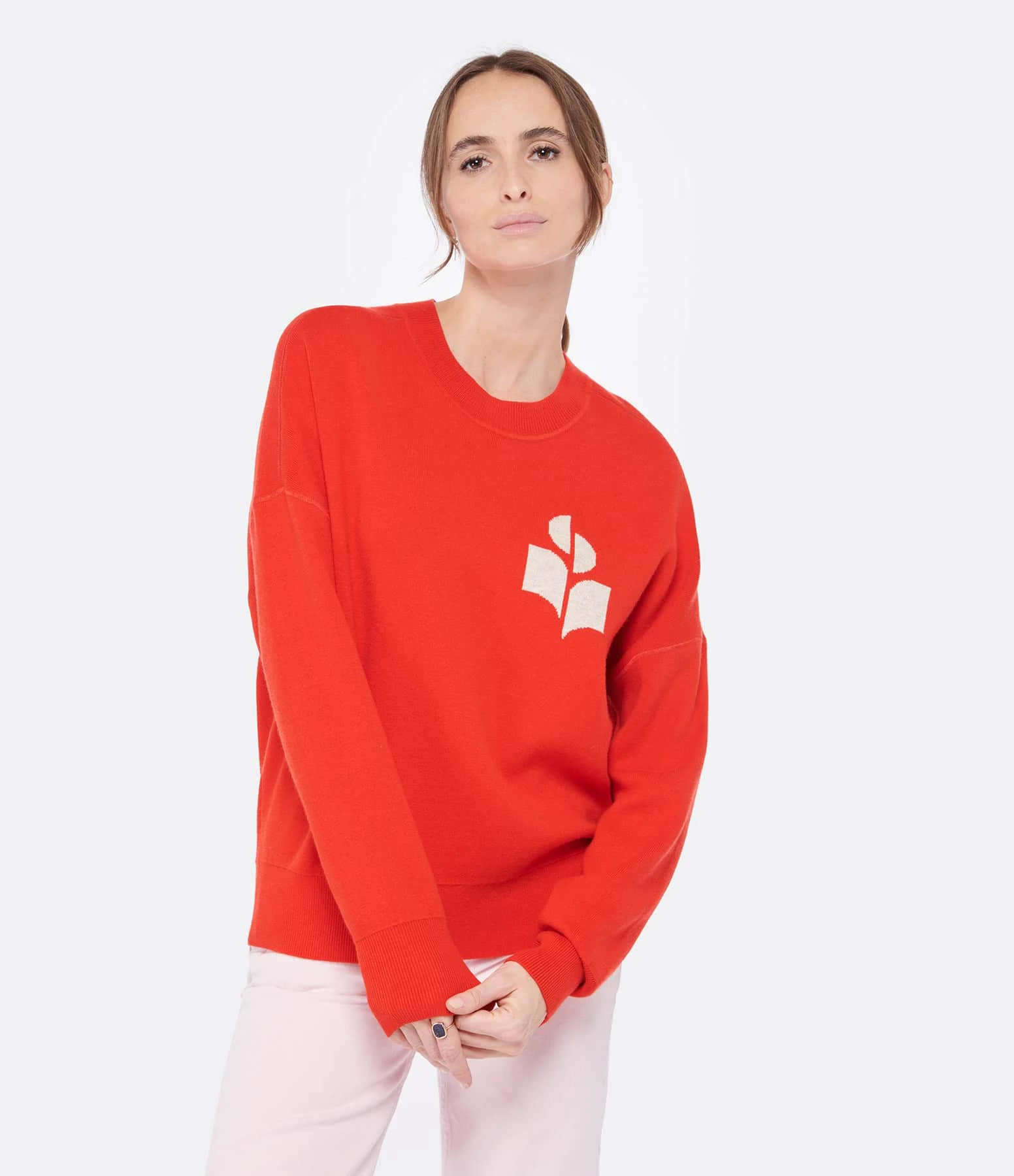 Pull en coton et laine rouge vermillon. Logo imprimé en écru et gris clair sur la poitrine. Col rond côtelé. Manches longues avec poignet côtelé. Coupe droite large. Base droite côtelée.