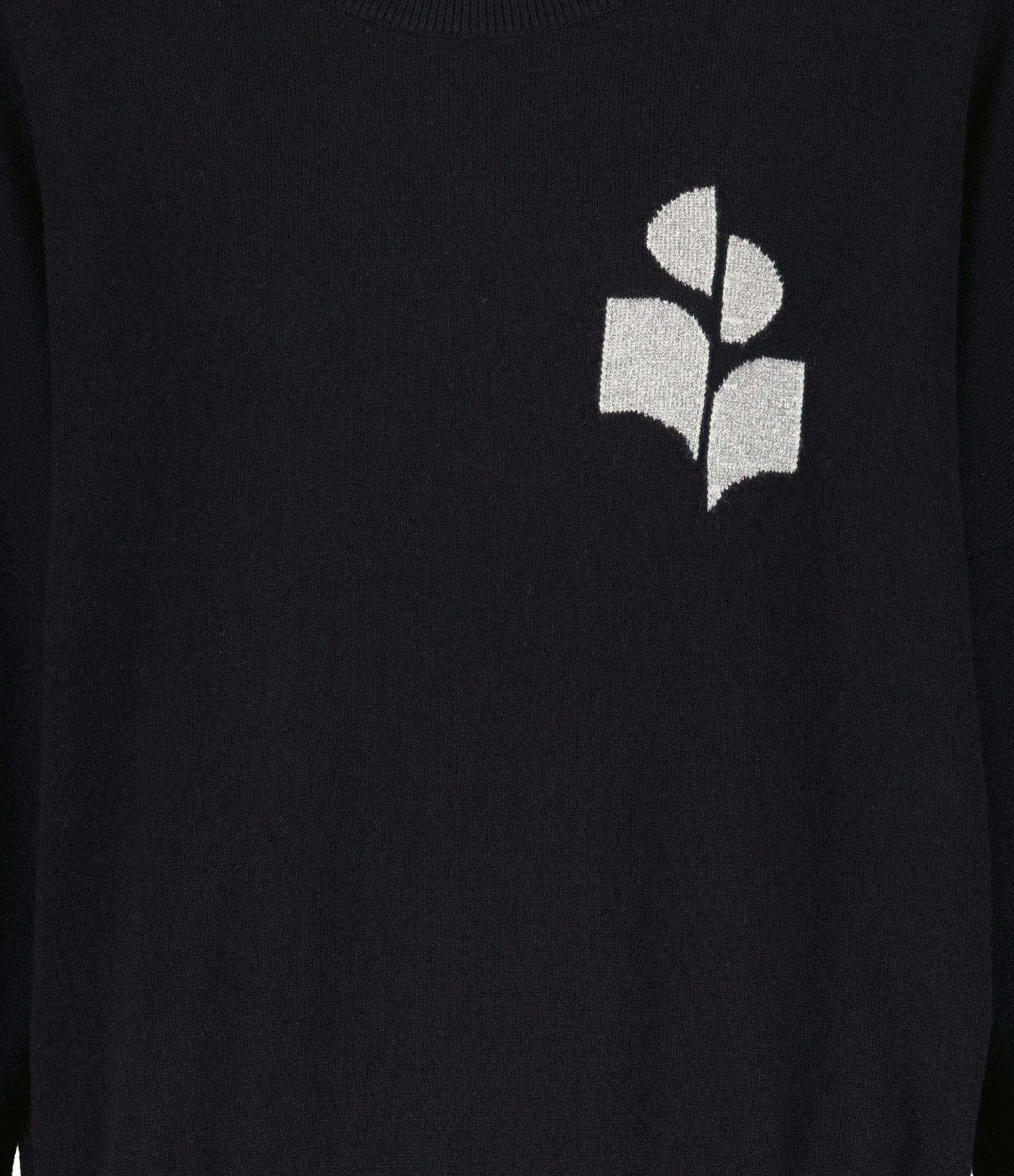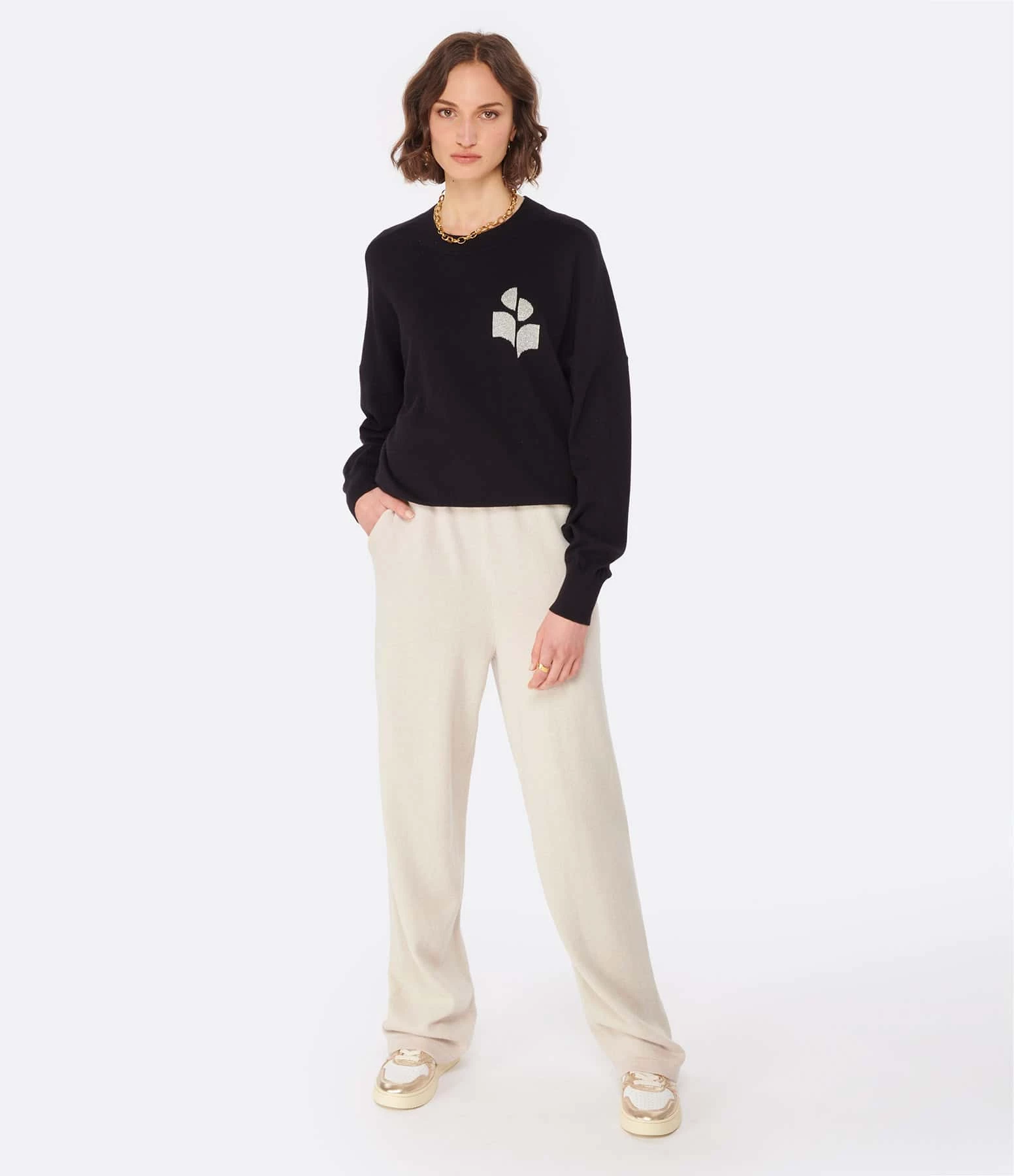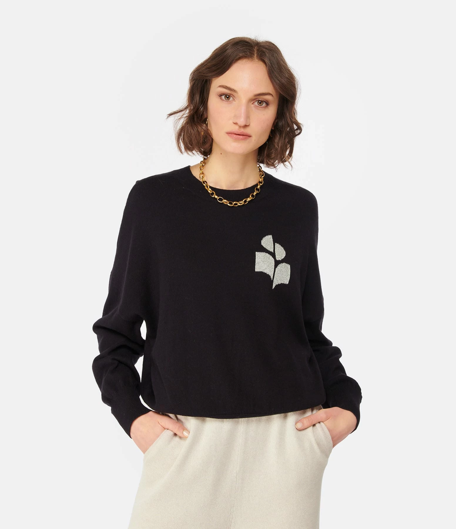 Pull en maille de coton et laine noir avec le logo brodé en argenté métallisé sur la poitrine. Col rond côtelés. Manches longues avec poignets côtelés. Coupe ample. Base droite.